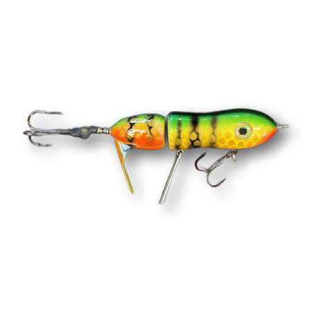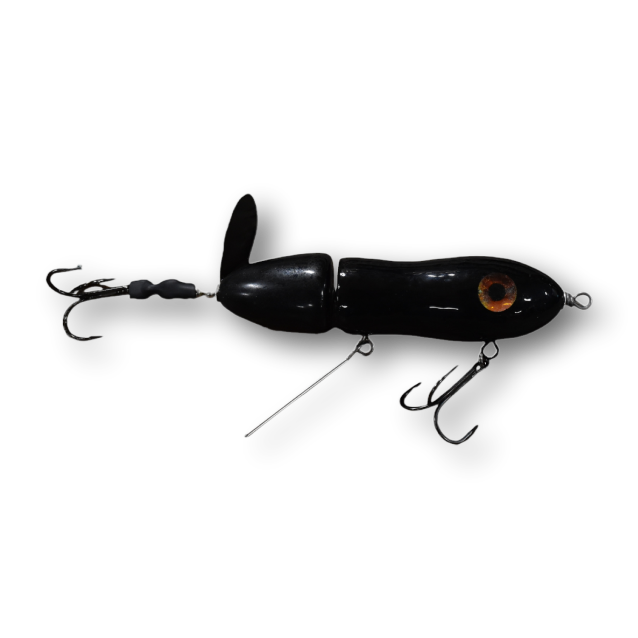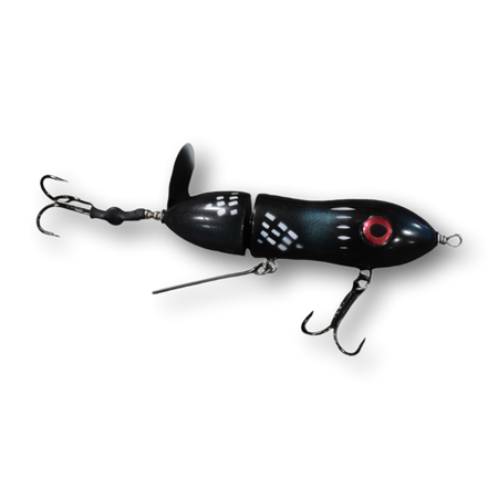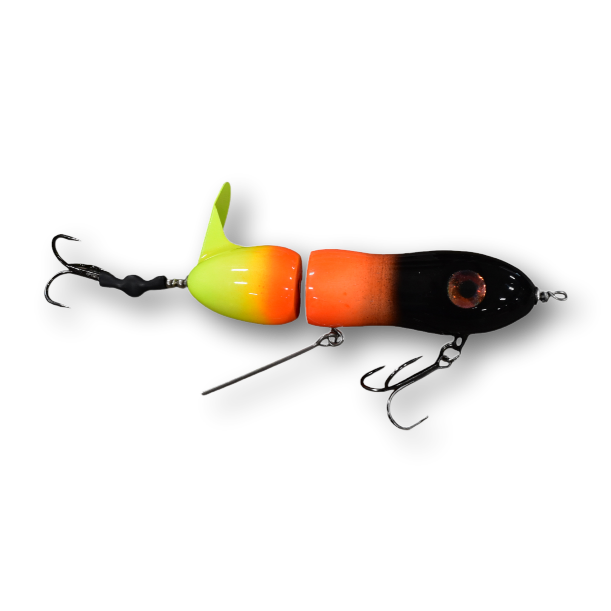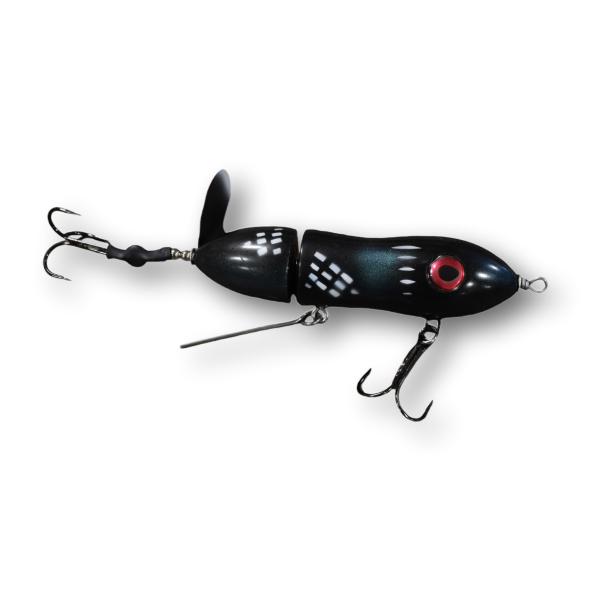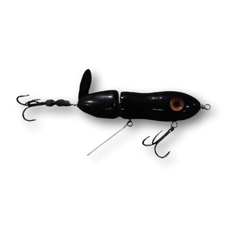 The Twis'td Sis'tr Clicker with it's distinctive slow rotation and deep plops plus the addition of a metallic clicking pin has been a top producer since day one. The Twis'td Sis'tr Clicker has a well earned reputation for producing huge fish. Hand made out of cedar you will find a thru wire construction, a swiveled front hook, a stainless steel pin attachment, and a stainless steel blade that you can tune and stays tuned. The back hook is shrink tubed to hold it in the perfect hooking position. Twis'td Sis'tr comes standard with a 3/0 Premium Black Trident Treble Hook on the front and a 4/0 on the back.