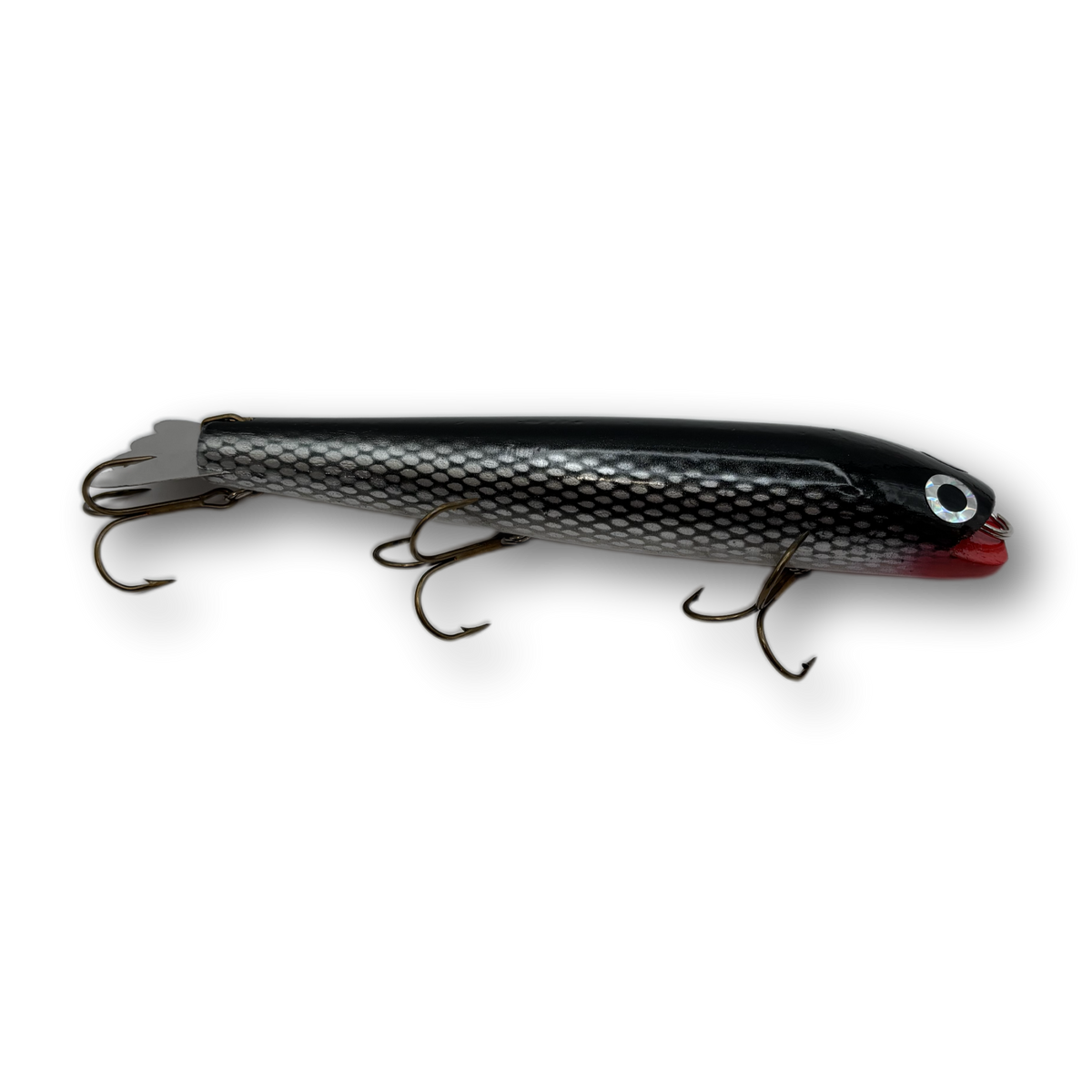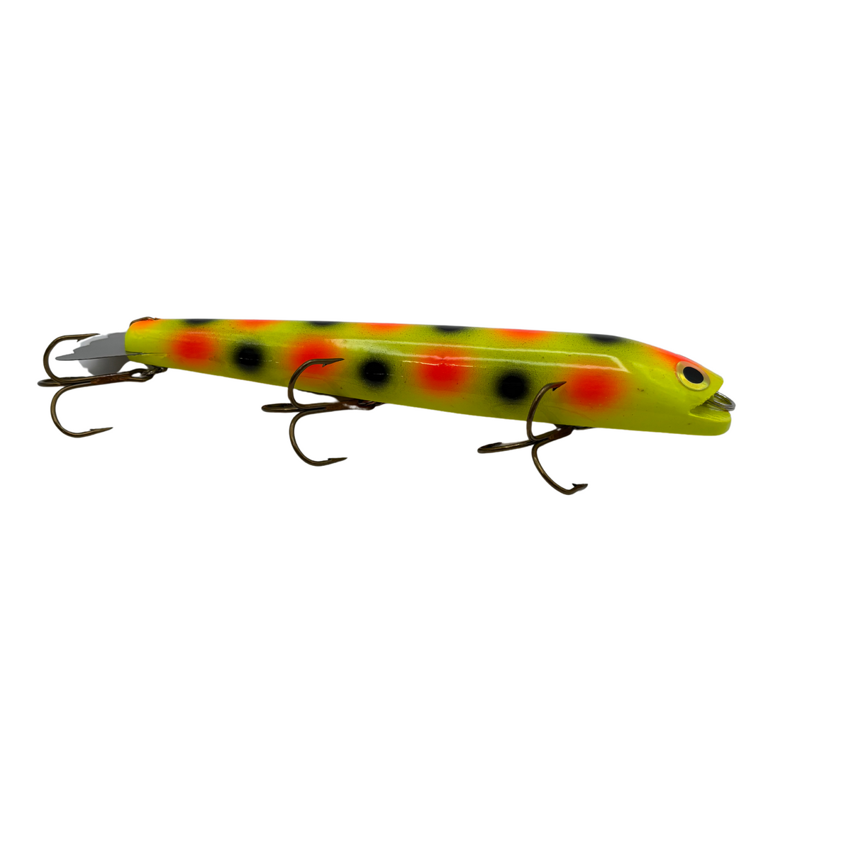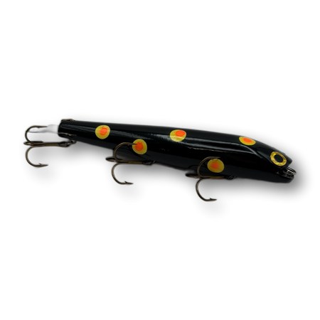Bobbie Baits have been pulling in record Muskies for more than 50 years. The Bobbie Bait is a quality lure, constructed from hand-turned pine, mounted with a pressed stainless steel adjustable tail and three treble hooks.