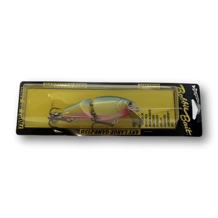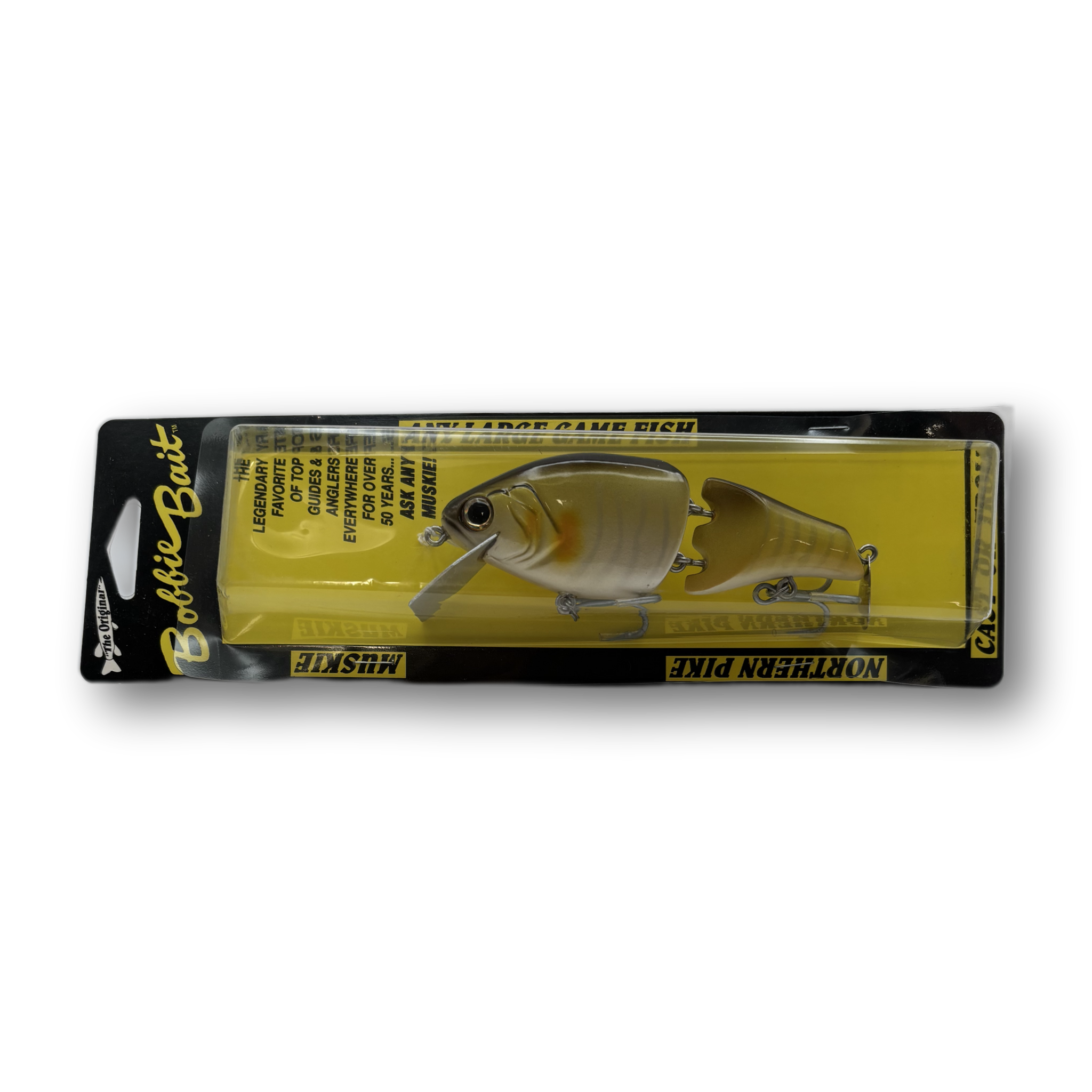 This rare Bobbie Bait Jointed Shiner is available in limited quantity at Guide's Choice Pro Shop. Similar to the Wood Wiggler, but in a smaller package, this 5.5" jointed crankbait has a #3 blade at the tail for extra flash. Bobbie Baits have been pulling in record muskies for more than 50 years!
