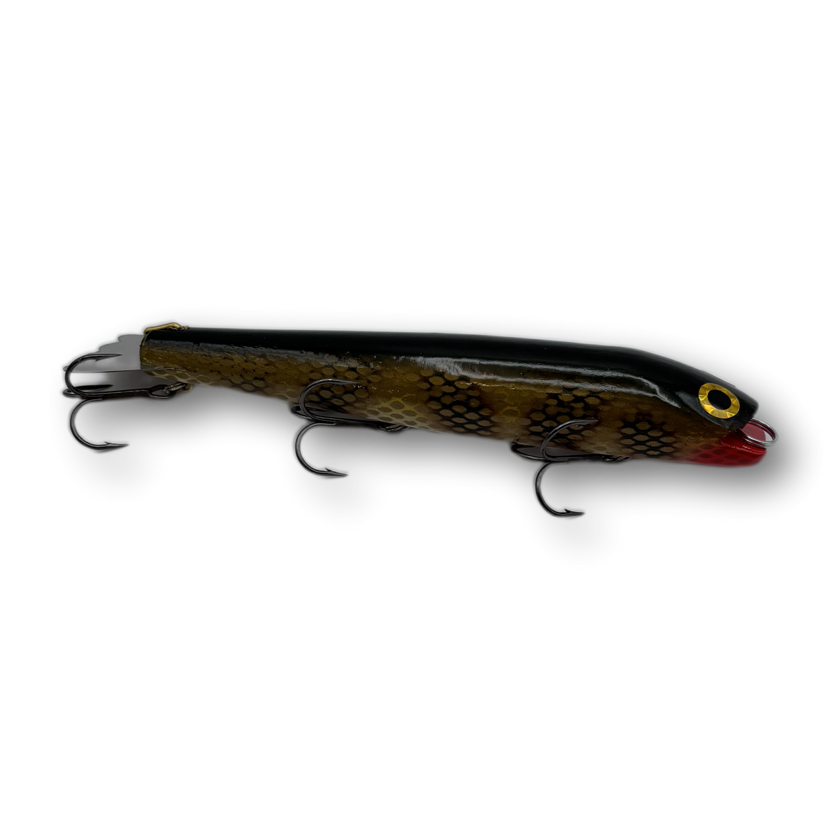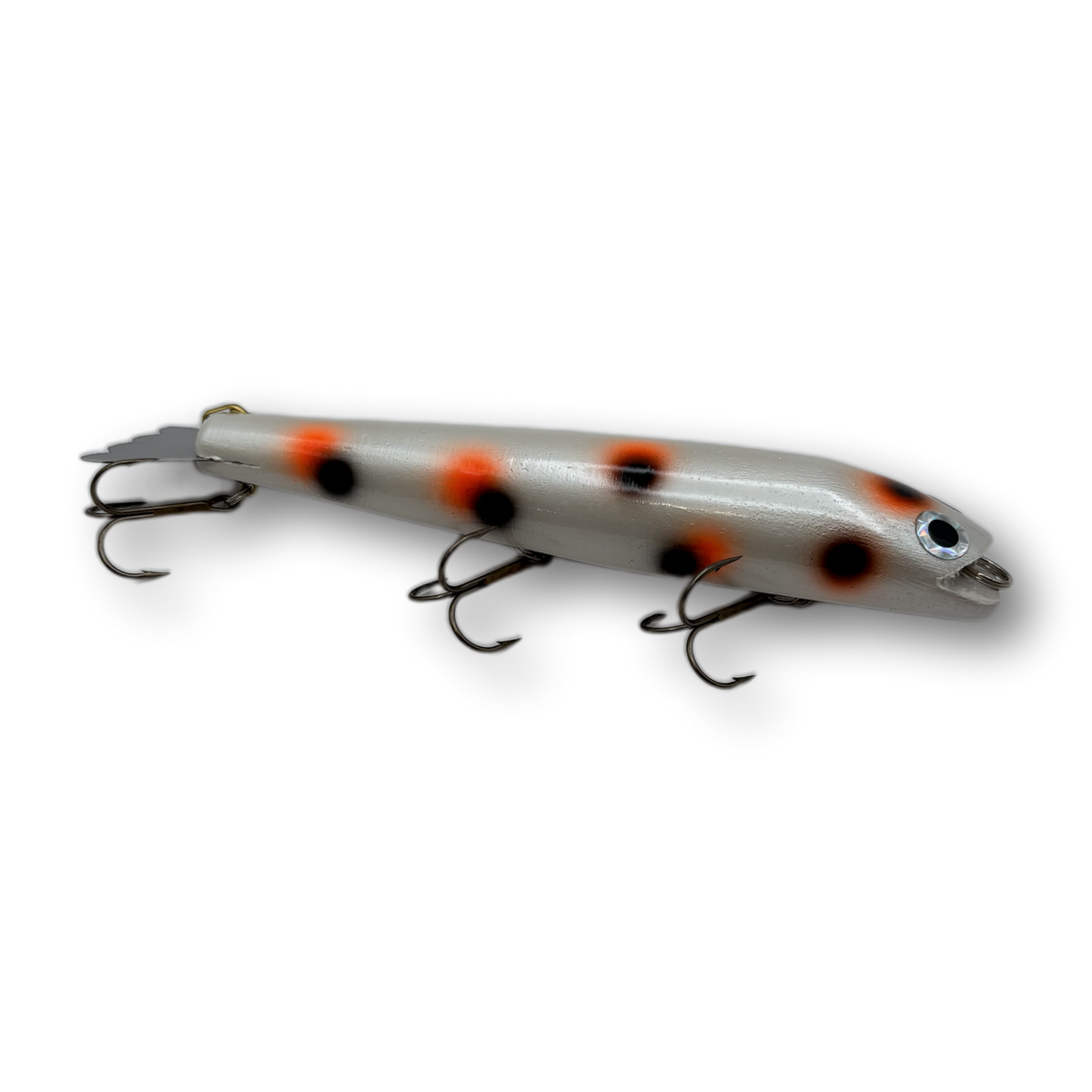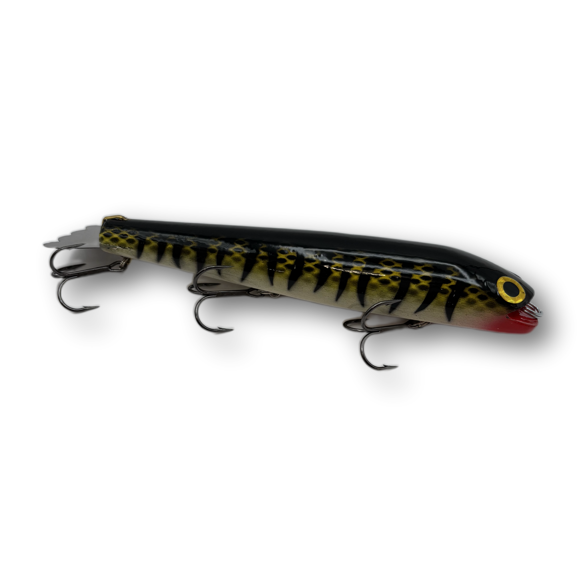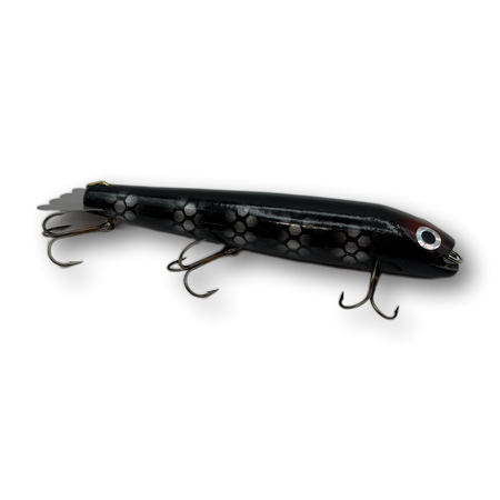Bobbie Baits have been pulling in record Muskies for more than 50 years. The Bobbie Bait is a quality lure, constructed from hand-turned pine, mounted with a pressed stainless steel adjustable tail and three treble hooks.