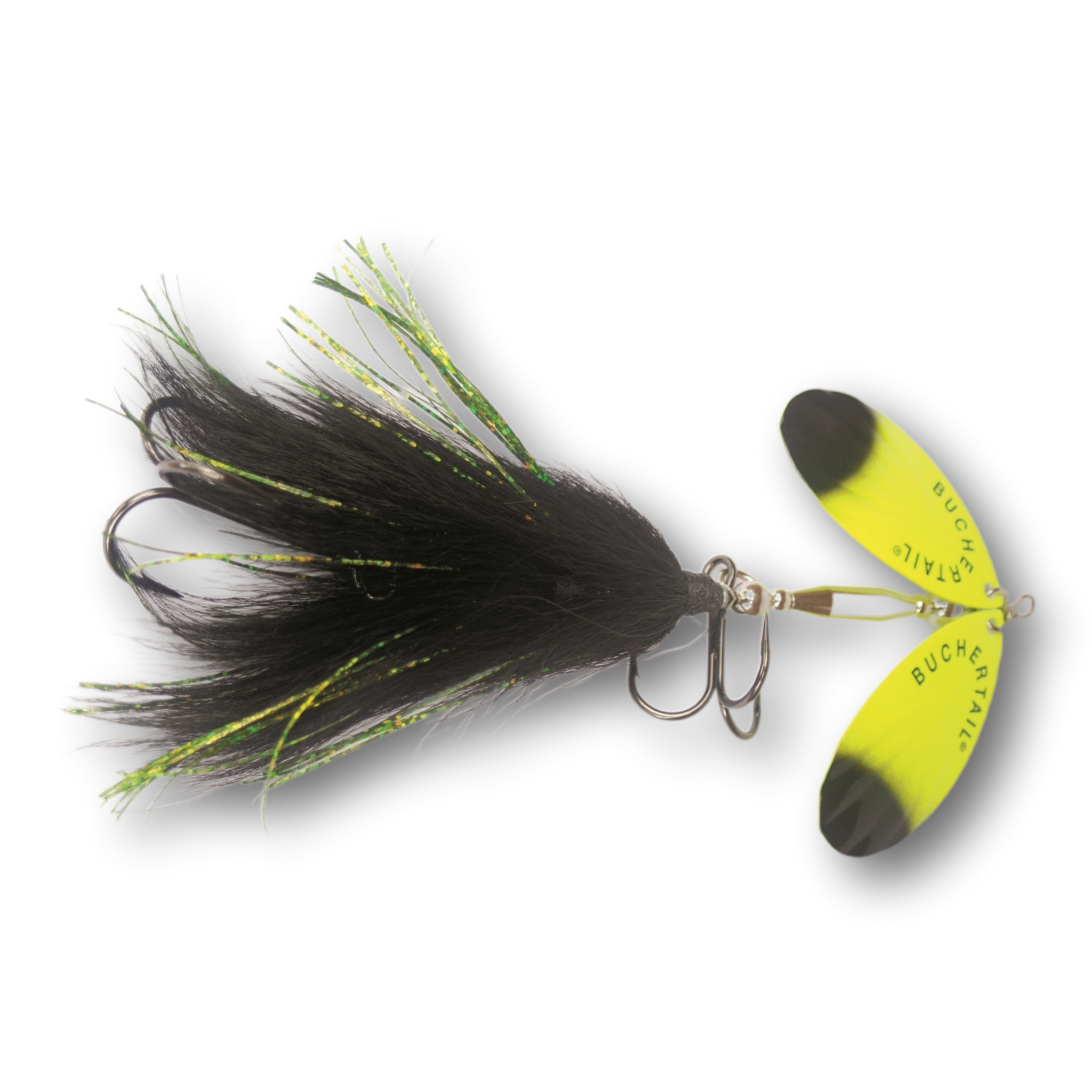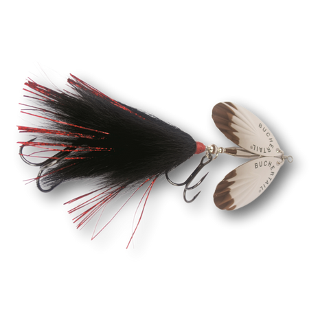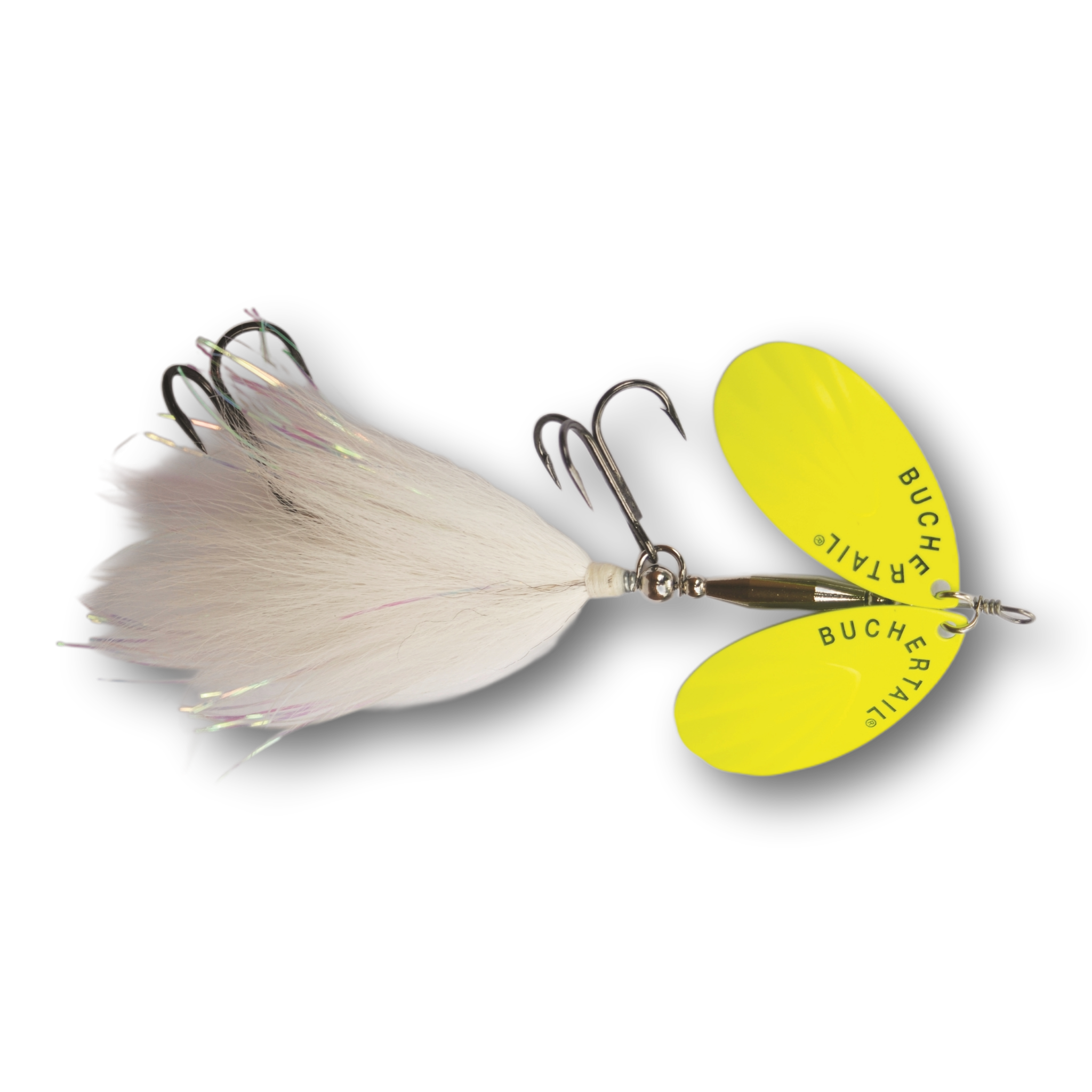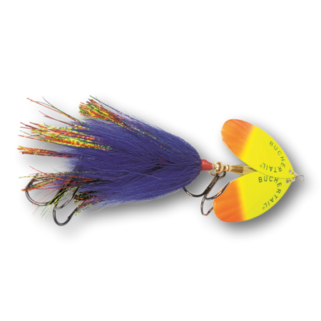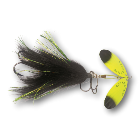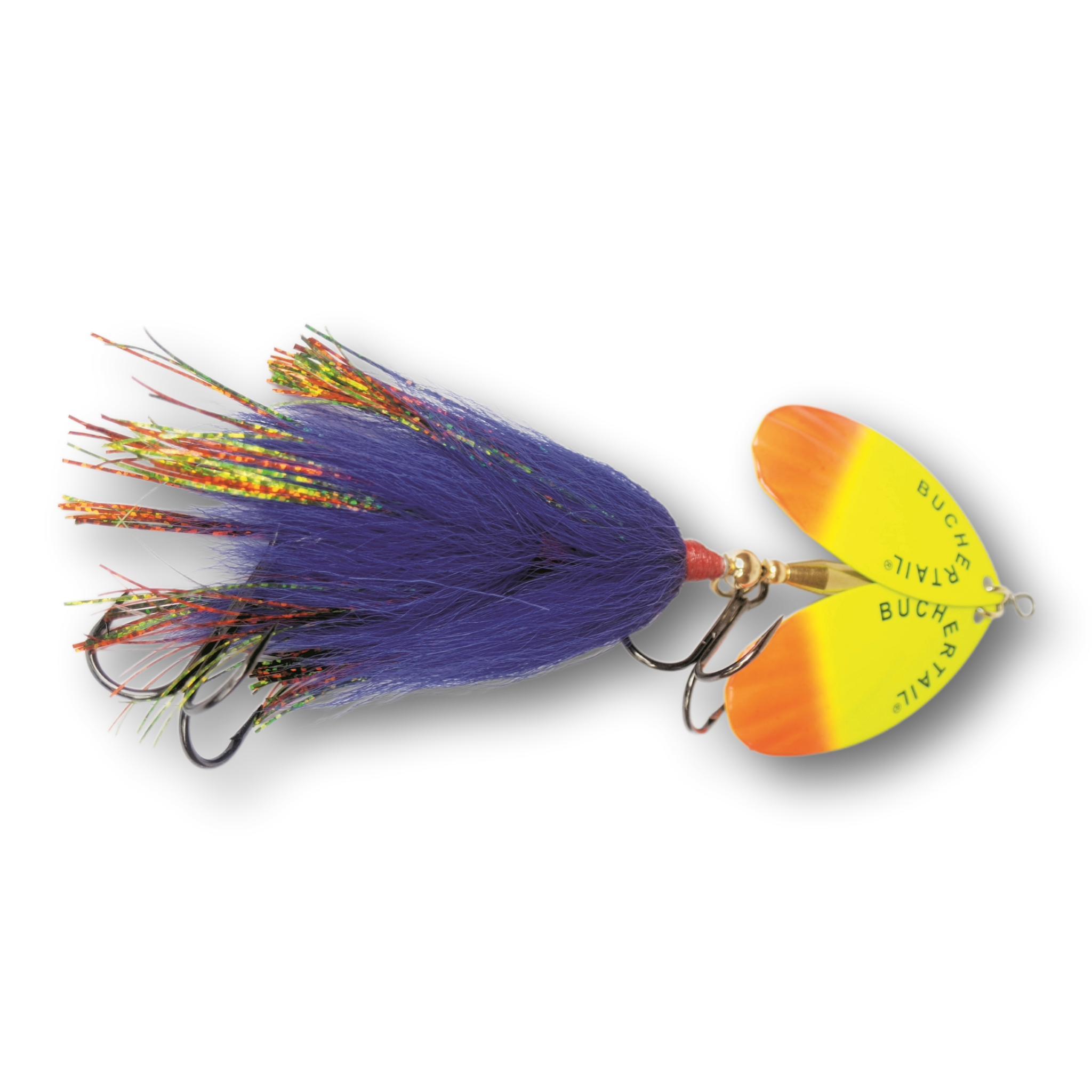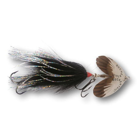 Joe Bucher successfully hybridized the original Buchertail 700 by blending the flash of tinsel Flashabou to natural bucktail – creating the TinBuck. In fact, the TinBuck has now become the go-to lure of many professional guides. This successful hybridization created a demand for a larger version sporting twin blades for those situations where muskies and other large gamefish seem to prefer a larger lure profile. Thus, the creation of the new TinBuck 2.