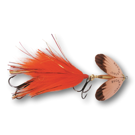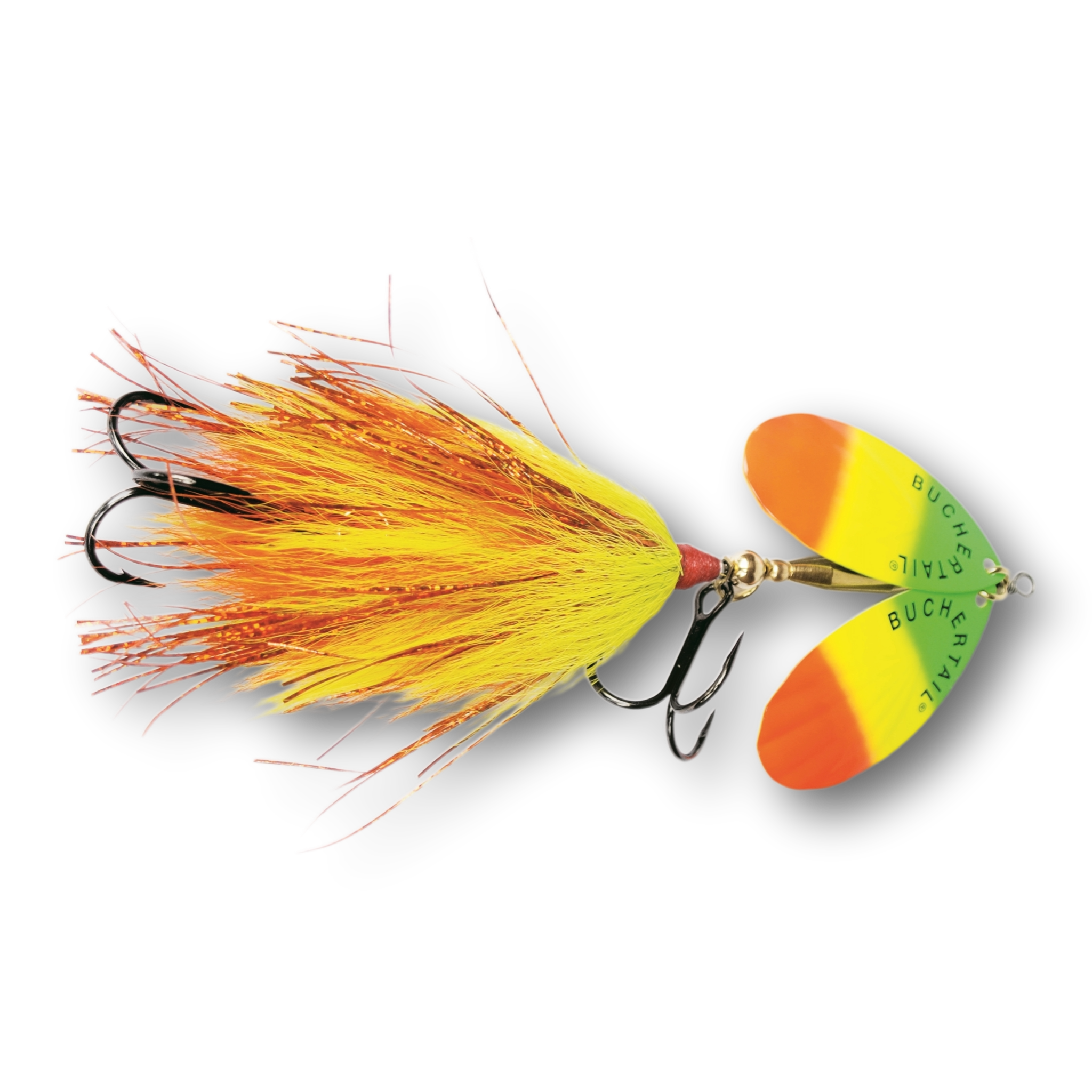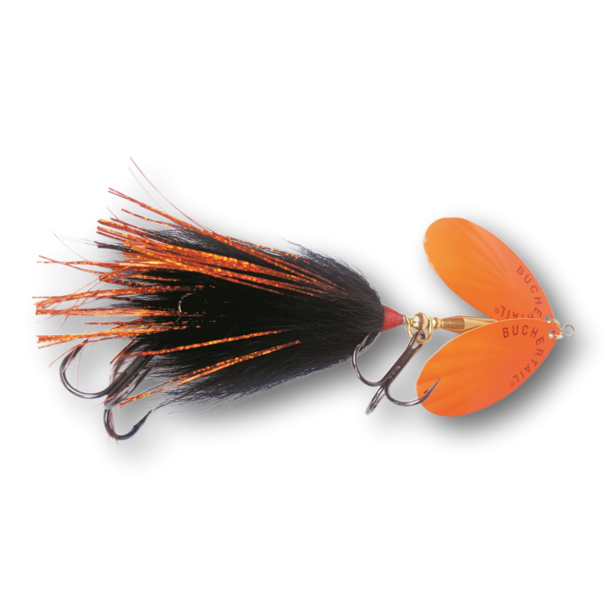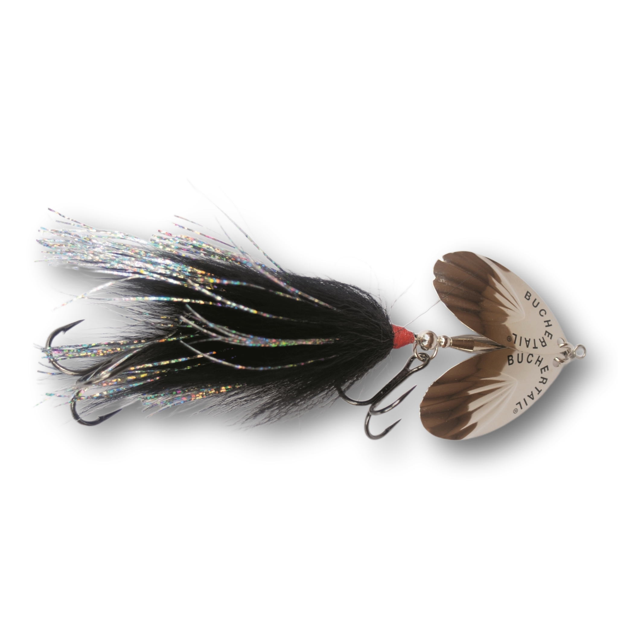 Joe Bucher successfully hybridized the original Buchertail 700 by blending the flash of tinsel Flashabou to natural bucktail – creating the TinBuck. In fact, the TinBuck has now become the go-to lure of many professional guides. This successful hybridization created a demand for a larger version sporting twin blades for those situations where muskies and other large gamefish seem to prefer a larger lure profile. Thus, the creation of the new TinBuck 2.