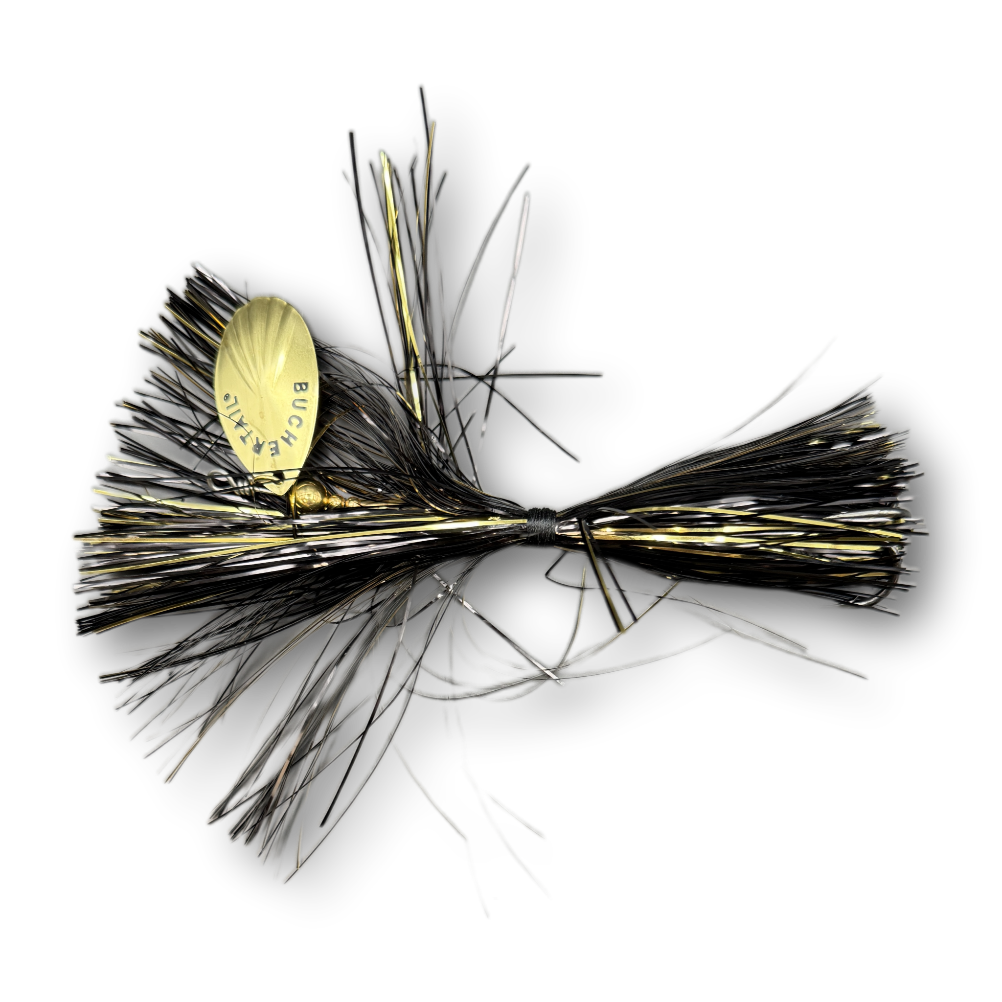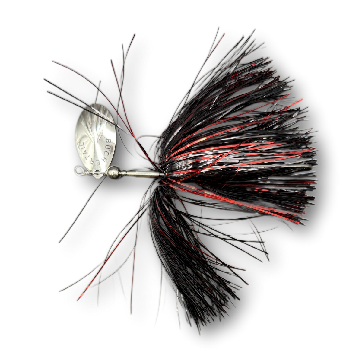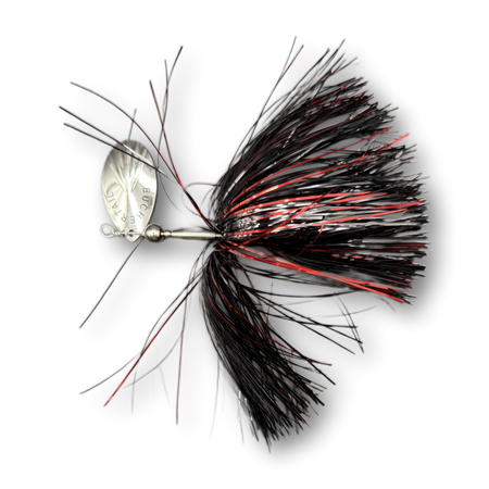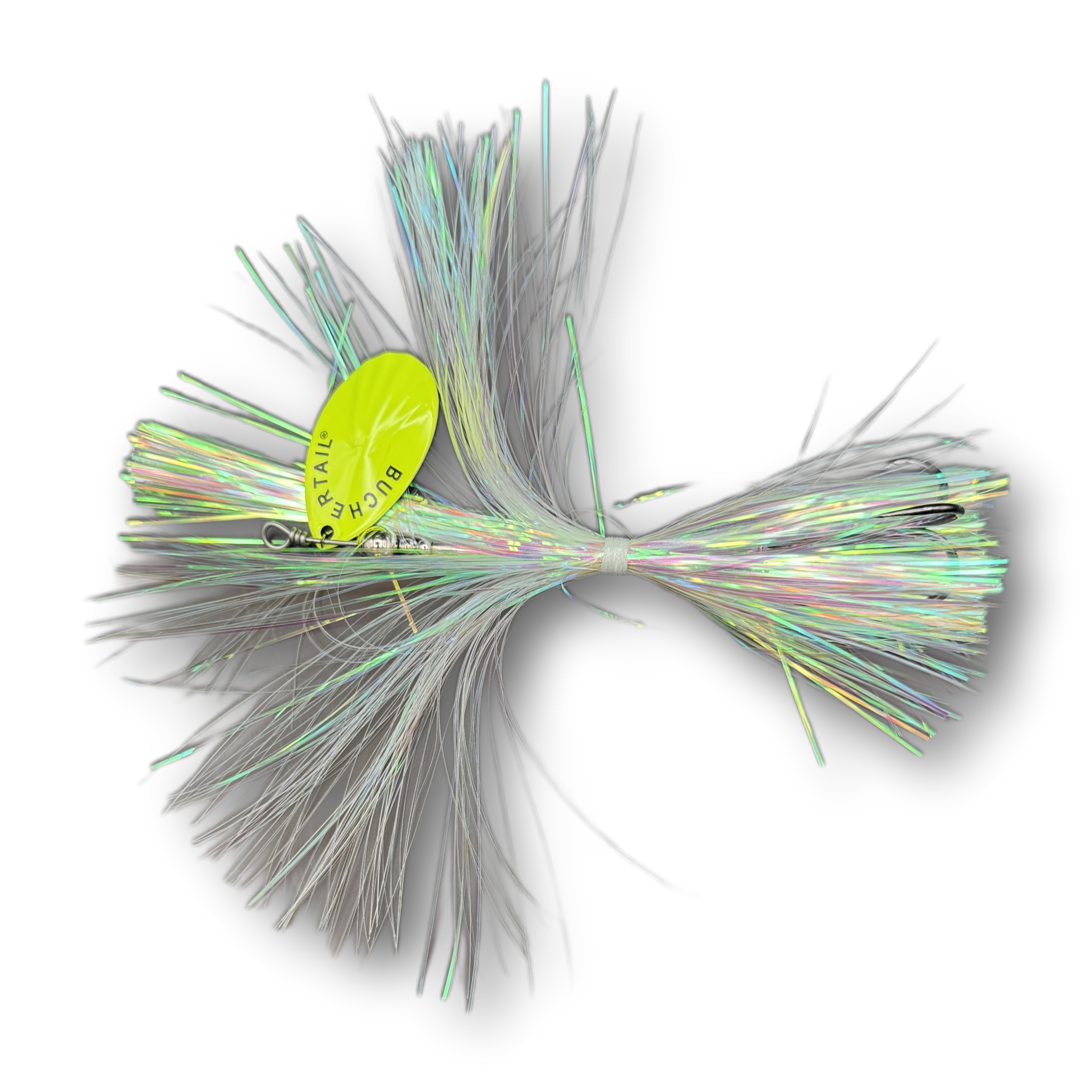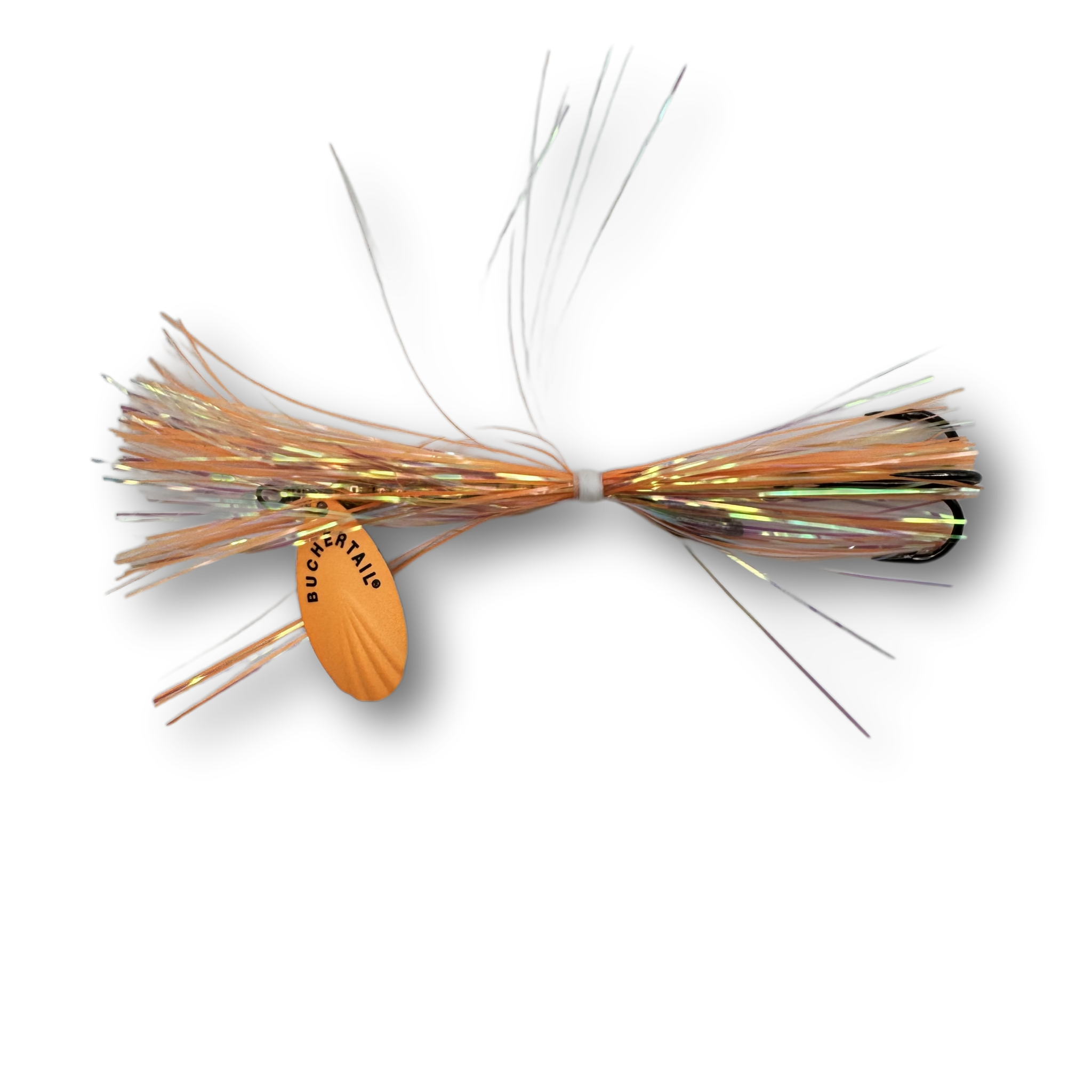 The Buchertail 500 Tinsel is built on a new concept focused on making a downsized version of the popular Buchertail 700 that casts and works like a full sized musky spinner. Unlike most downsized in-line spinners, the Buchertail 500 Tinsel has the same weight as the larger Buchertail 700 and an oversized treble hook. This design allows you to cast the 500 easily with a full sized conventional musky rod & reel outfit. The additional weight also allows the angler to retrieve this lure faster to trigger more strikes from following muskies and big pike.