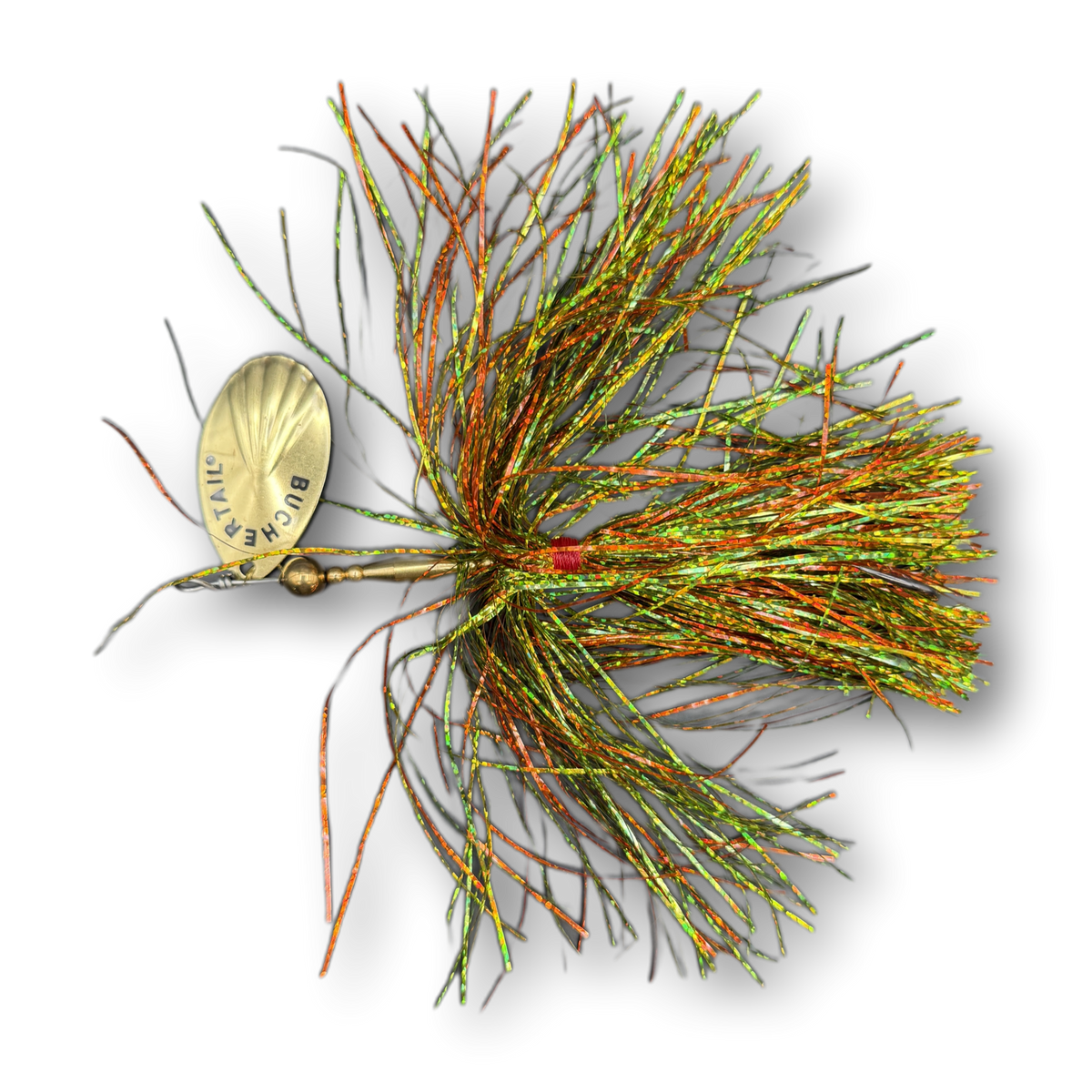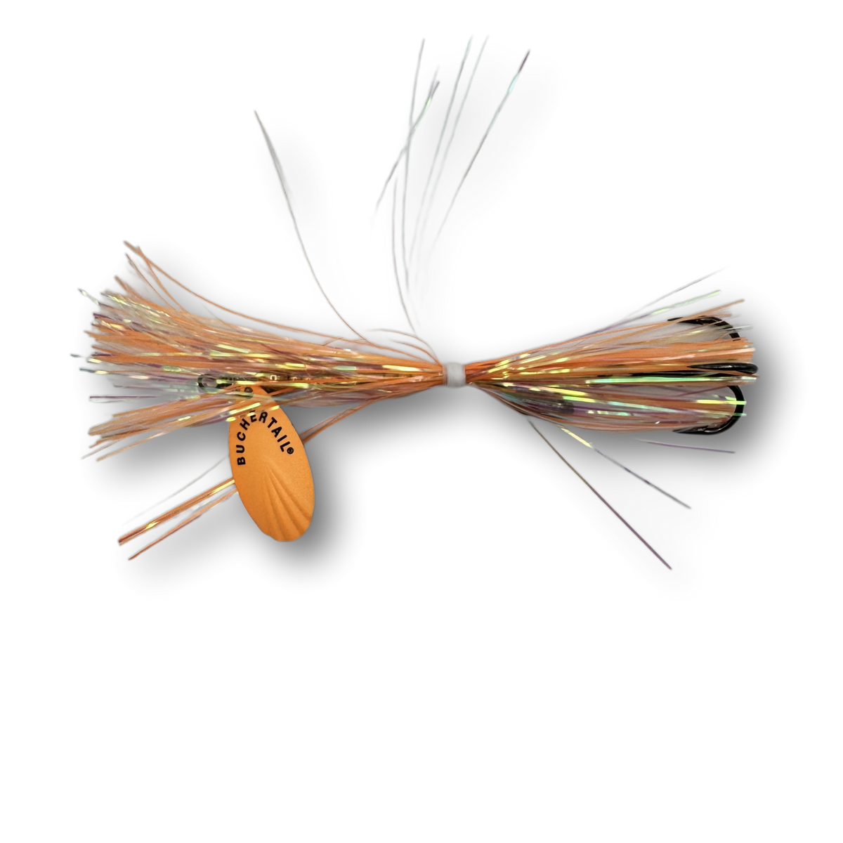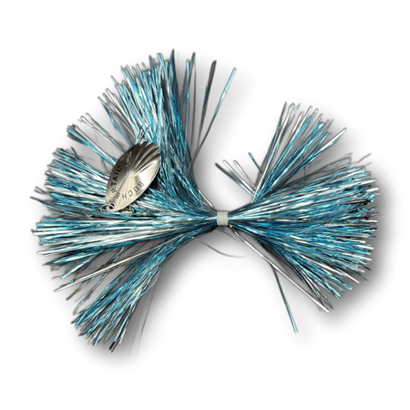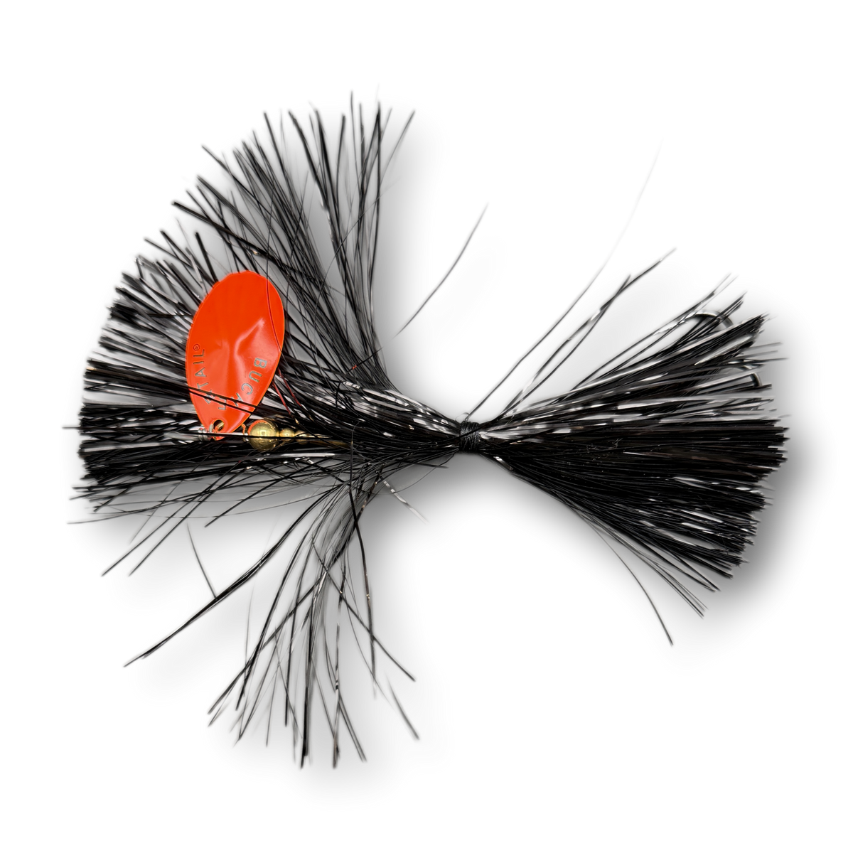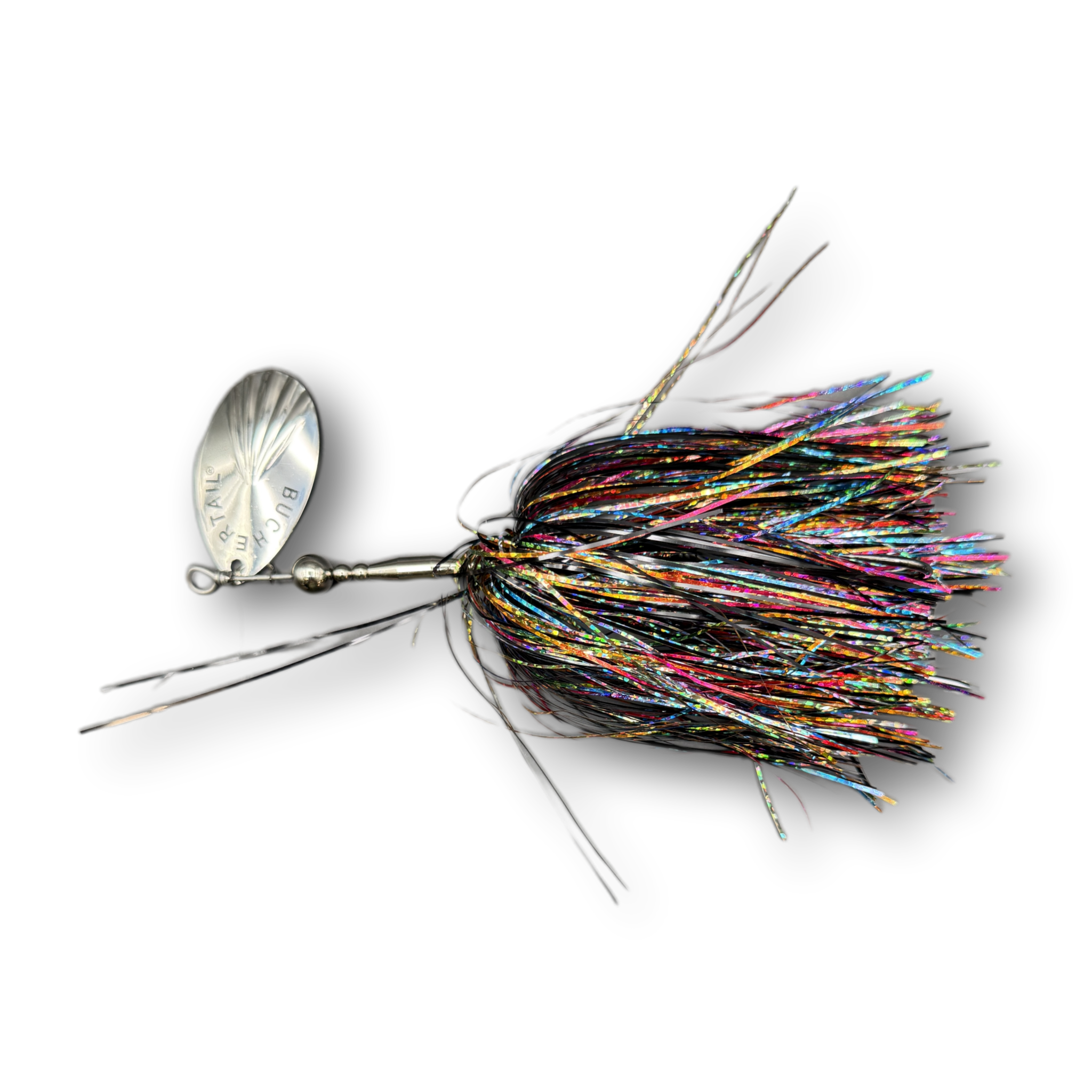 The Buchertail 500 Tinsel is built on a new concept focused on making a downsized version of the popular Buchertail 700 that casts and works like a full sized musky spinner. Unlike most downsized in-line spinners, the Buchertail 500 Tinsel has the same weight as the larger Buchertail 700 and an oversized treble hook. This design allows you to cast the 500 easily with a full sized conventional musky rod & reel outfit. The additional weight also allows the angler to retrieve this lure faster to trigger more strikes from following muskies and big pike.