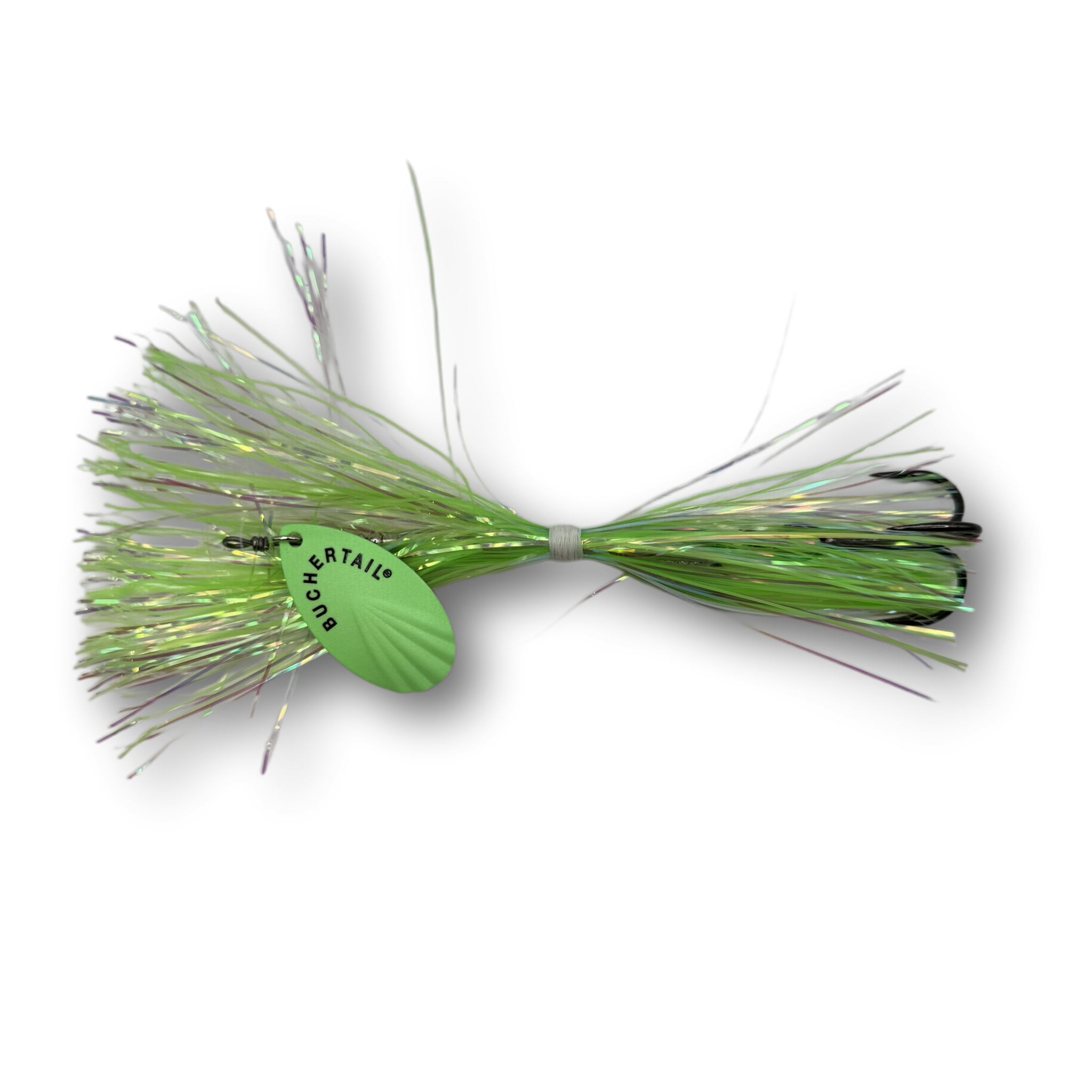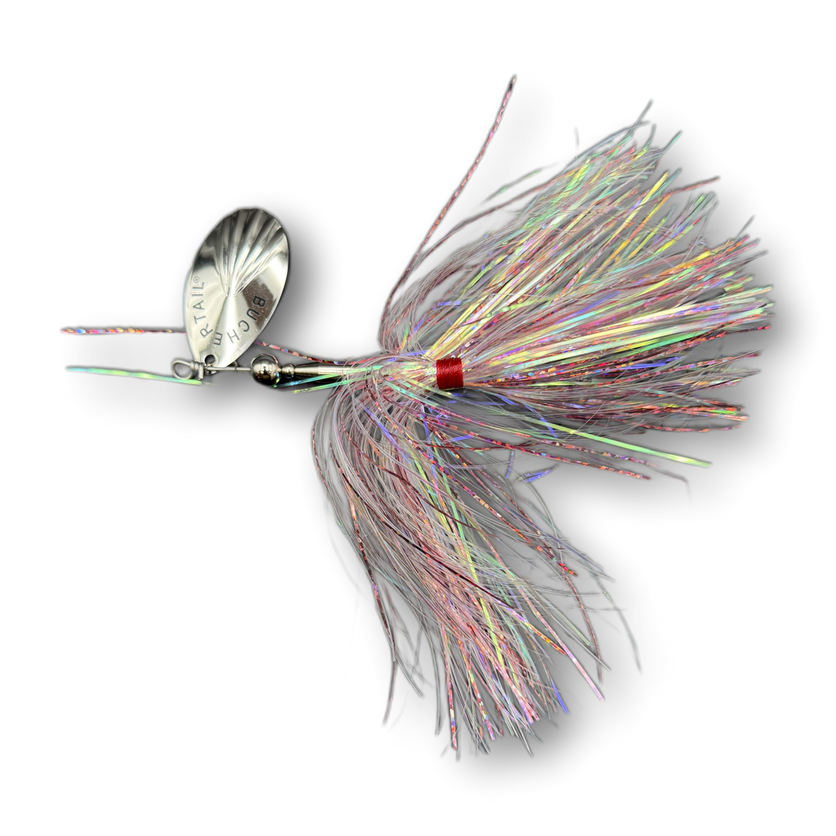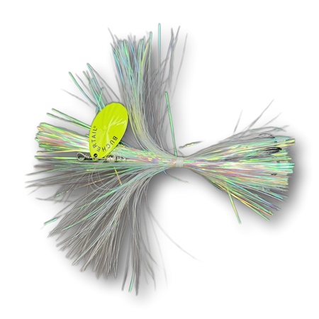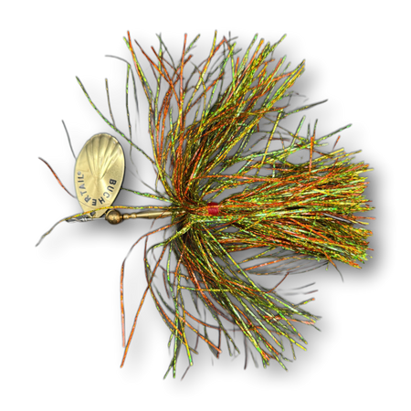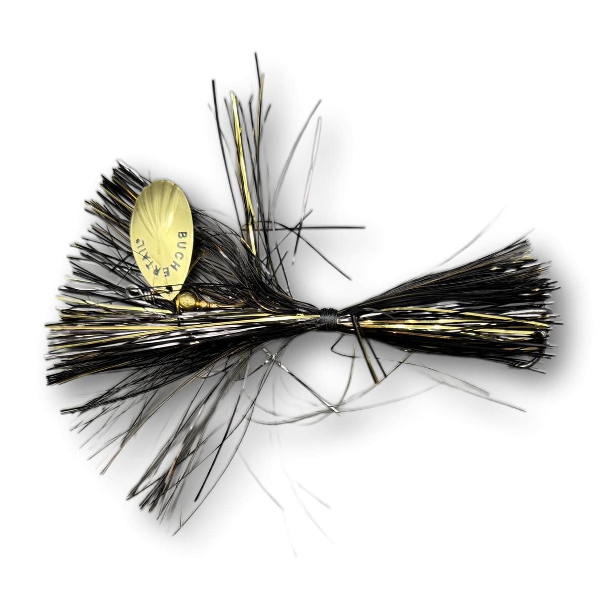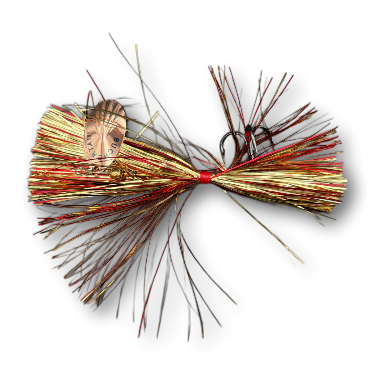 The Buchertail 500 Tinsel is built on a new concept focused on making a downsized version of the popular Buchertail 700 that casts and works like a full sized musky spinner. Unlike most downsized in-line spinners, the Buchertail 500 Tinsel has the same weight as the larger Buchertail 700 and an oversized treble hook. This design allows you to cast the 500 easily with a full sized conventional musky rod & reel outfit. The additional weight also allows the angler to retrieve this lure faster to trigger more strikes from following muskies and big pike.
