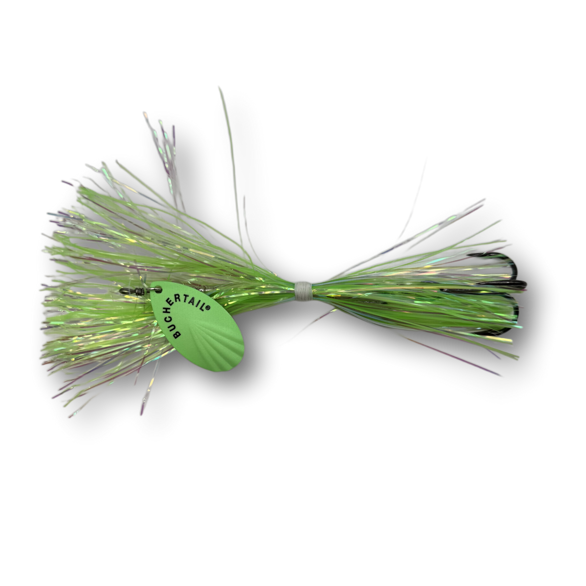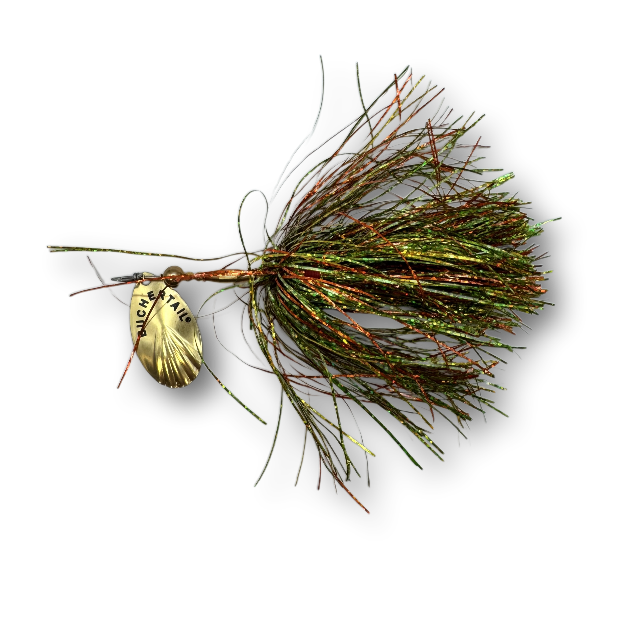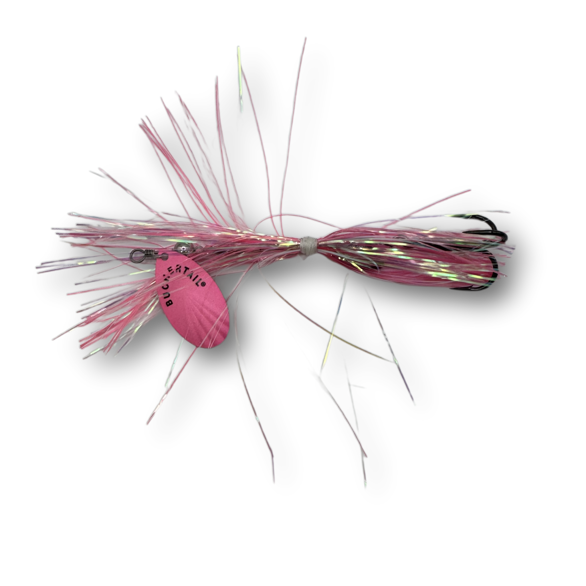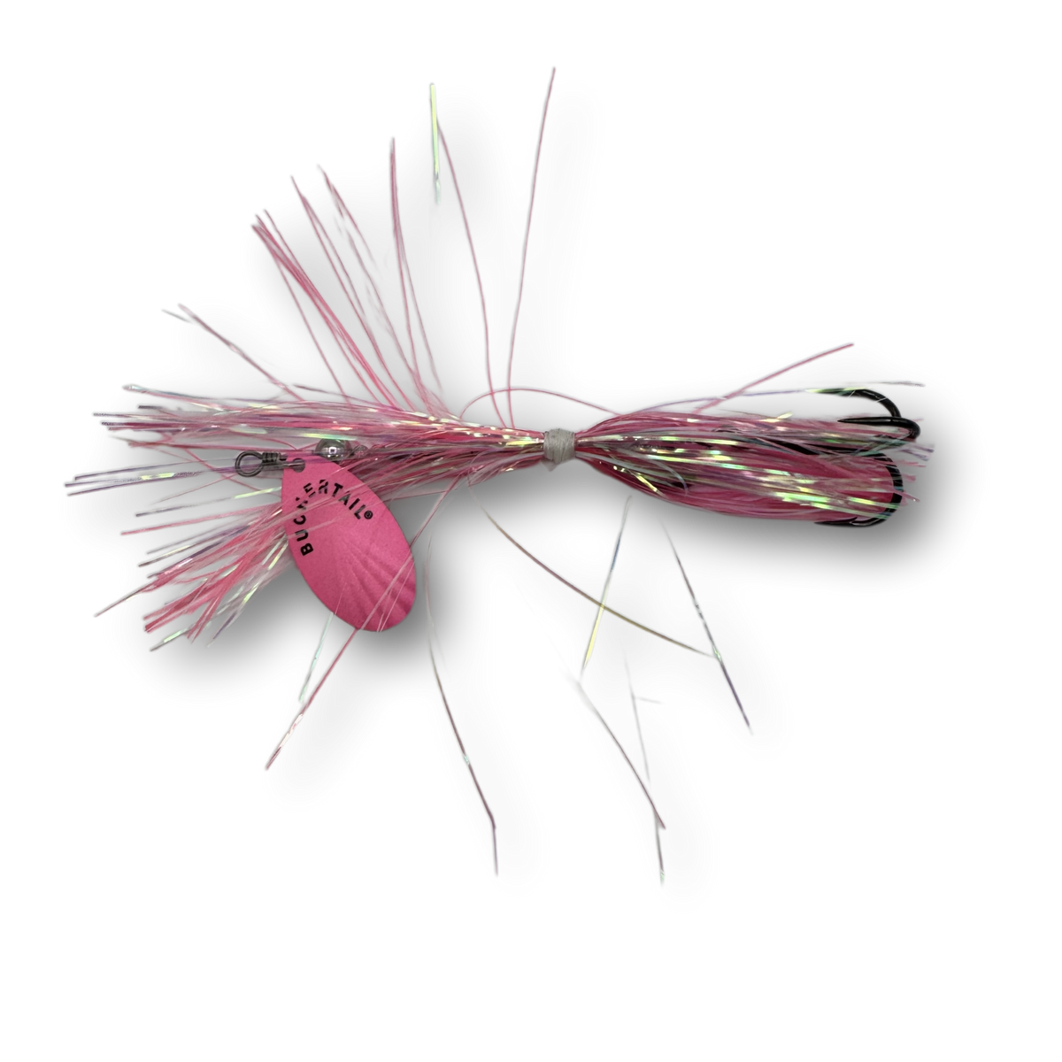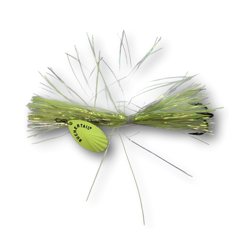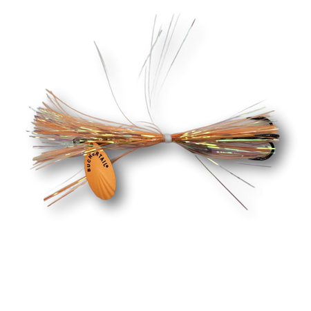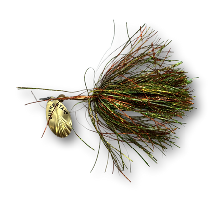 The Buchertail 500 Tinsel is built on a new concept focused on making a downsized version of the popular Buchertail 700 that casts and works like a full sized musky spinner. Unlike most downsized in-line spinners, the Buchertail 500 Tinsel has the same weight as the larger Buchertail 700 and an oversized treble hook. This design allows you to cast the 500 easily with a full sized conventional musky rod & reel outfit. The additional weight also allows the angler to retrieve this lure faster to trigger more strikes from following muskies and big pike.
