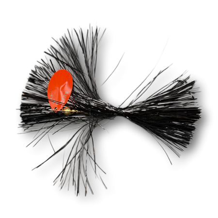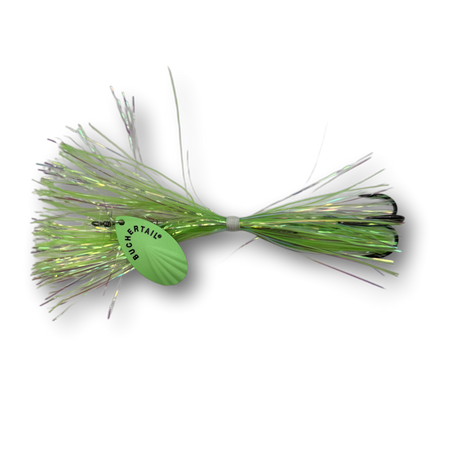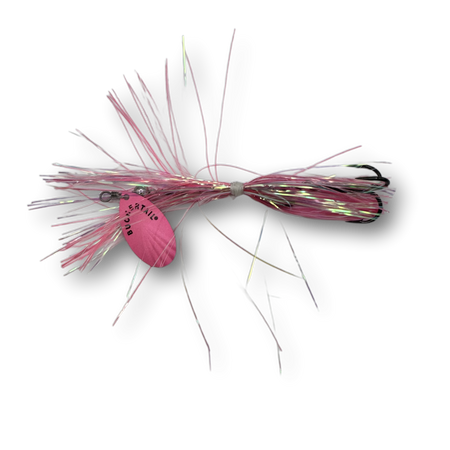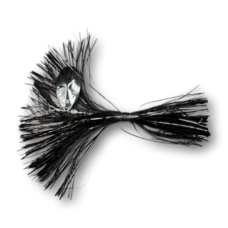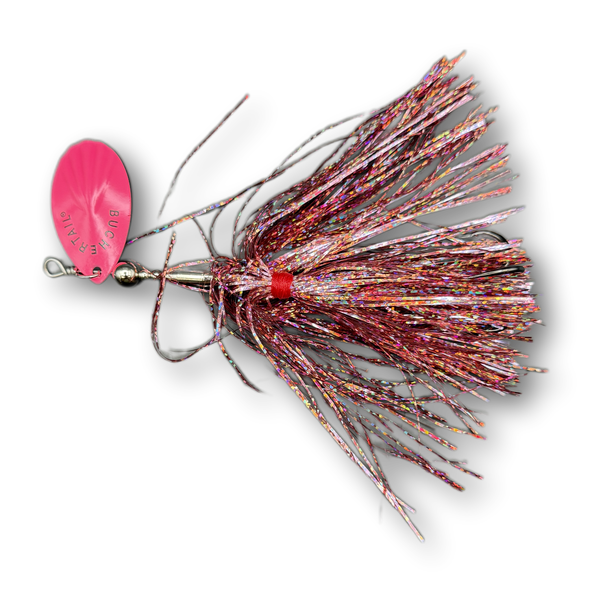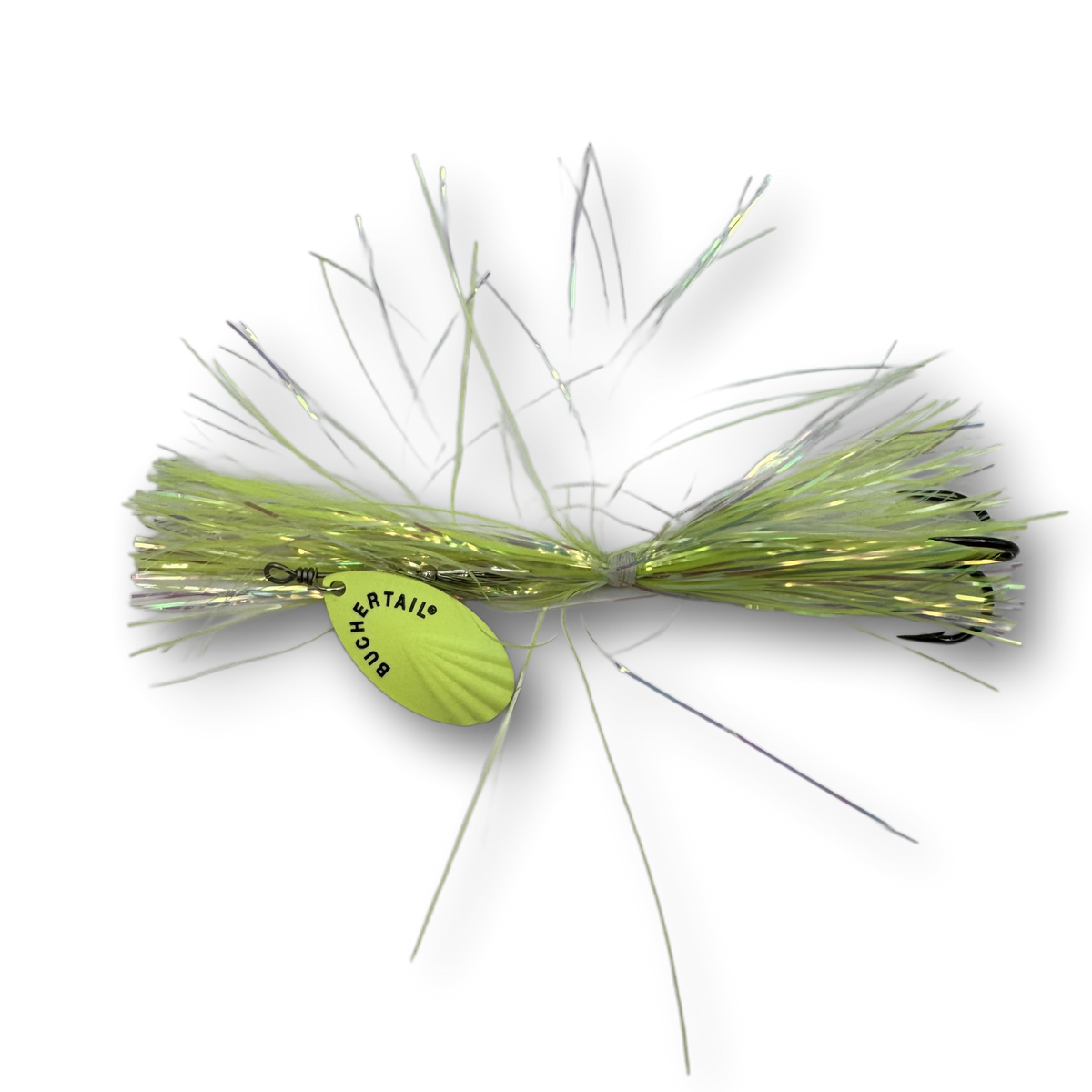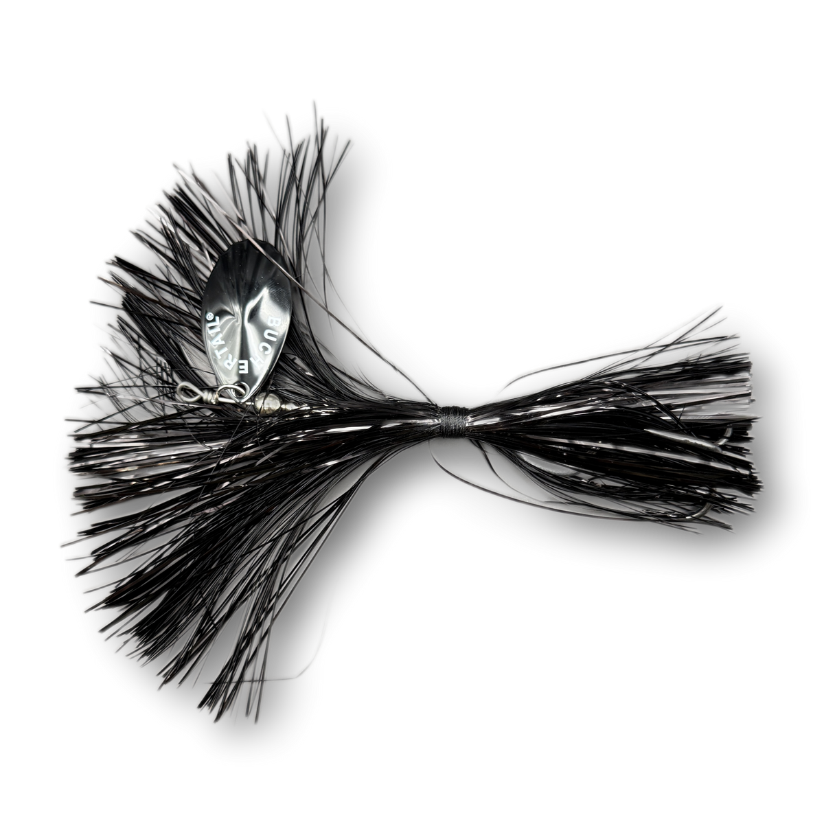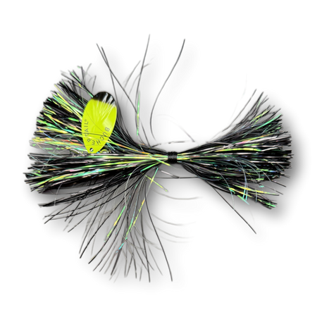 The Buchertail 500 Tinsel is built on a new concept focused on making a downsized version of the popular Buchertail 700 that casts and works like a full sized musky spinner. Unlike most downsized in-line spinners, the Buchertail 500 Tinsel has the same weight as the larger Buchertail 700 and an oversized treble hook. This design allows you to cast the 500 easily with a full sized conventional musky rod & reel outfit. The additional weight also allows the angler to retrieve this lure faster to trigger more strikes from following muskies and big pike.
