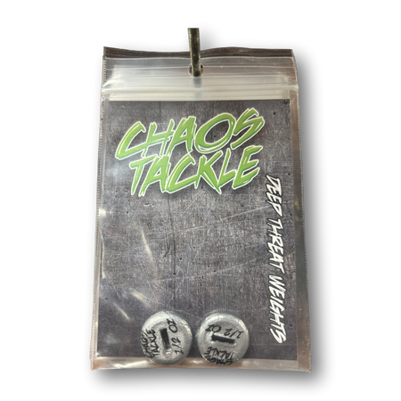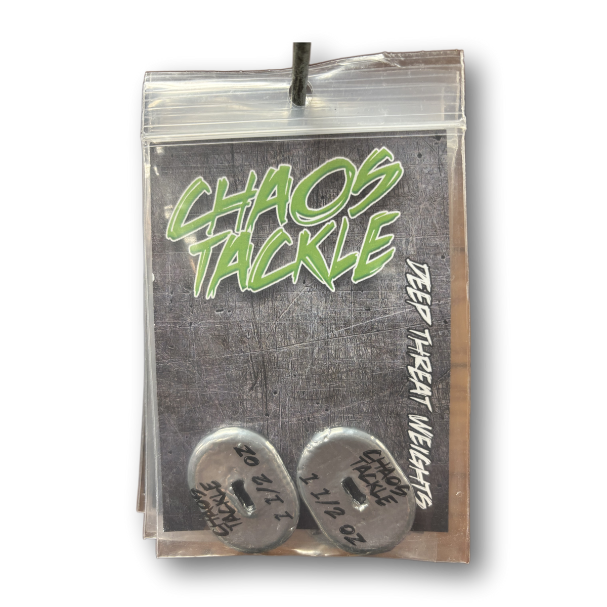 The Deep Threat is a very simple to use, yet highly effective way to add extra weight to a Medussa and many other lures. These weights will allow you to work your bails deeper and stay in the strike zone longer while fishing over deep structure or open water. Available in 3 different weights ( 1/2 oz, 1 oz, 1 1/2 oz) to offer you the angler, the ultimate depth control and the ability to key in on the exact depths you want to fish. Simply detach the front or back split ring and hook from your Medussa, slide the "Deep Threat" over the hook hanger and reattach the split ring and hook. It's that simple. The "Deep Threat" will help every angler put more and larger fish in the boat by getting your Medussa down there it needs to be throughout the year. Get DEEP and get BIT with Deep Threat from Chaos Tackle.