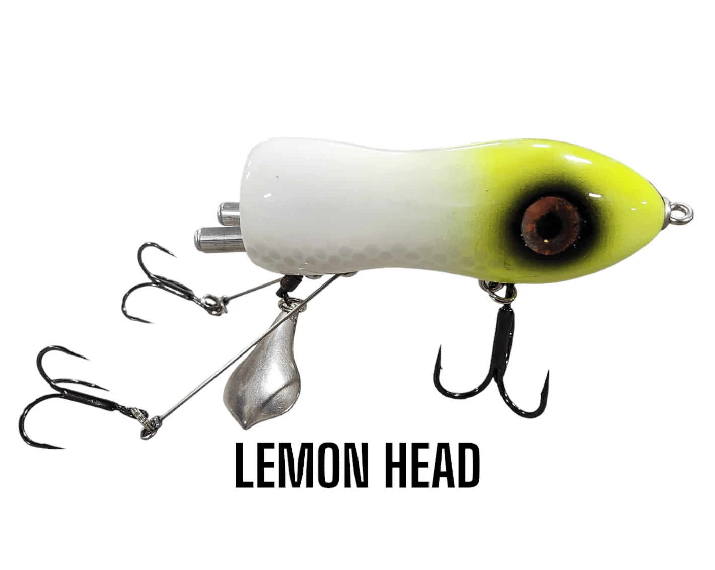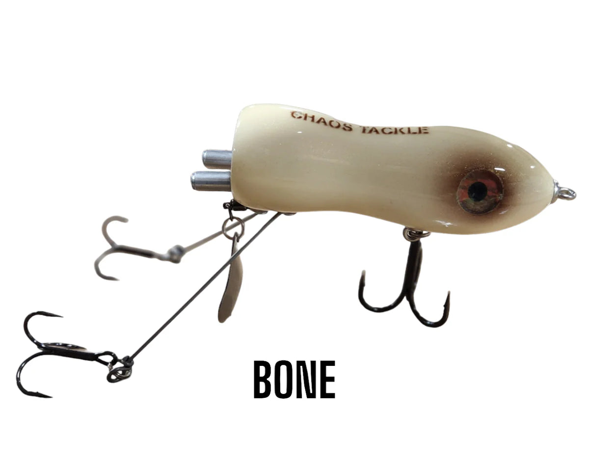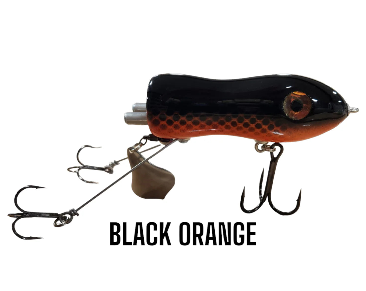 The Psycho Flap Tail is a hand made cedar topwater lure. Fish a Flap Tail very slow to medium speed for explosive strikes. We have placed two pins and a stainless steel blade on the back of the lure. The stainless steel blade makes contact with the two pins during the retrieve making a distinctive loud pinking sound game fish find irresistible. The Psycho Flap Tail utilizes spreader wires for the back hooks this greatly increases hookup percentage to close to 100% as you can get. The Psycho Flap Tail comes with one 6/0 Premium Black Trident Treble Hook on the front and a 2/0 on each side of the spreaders.