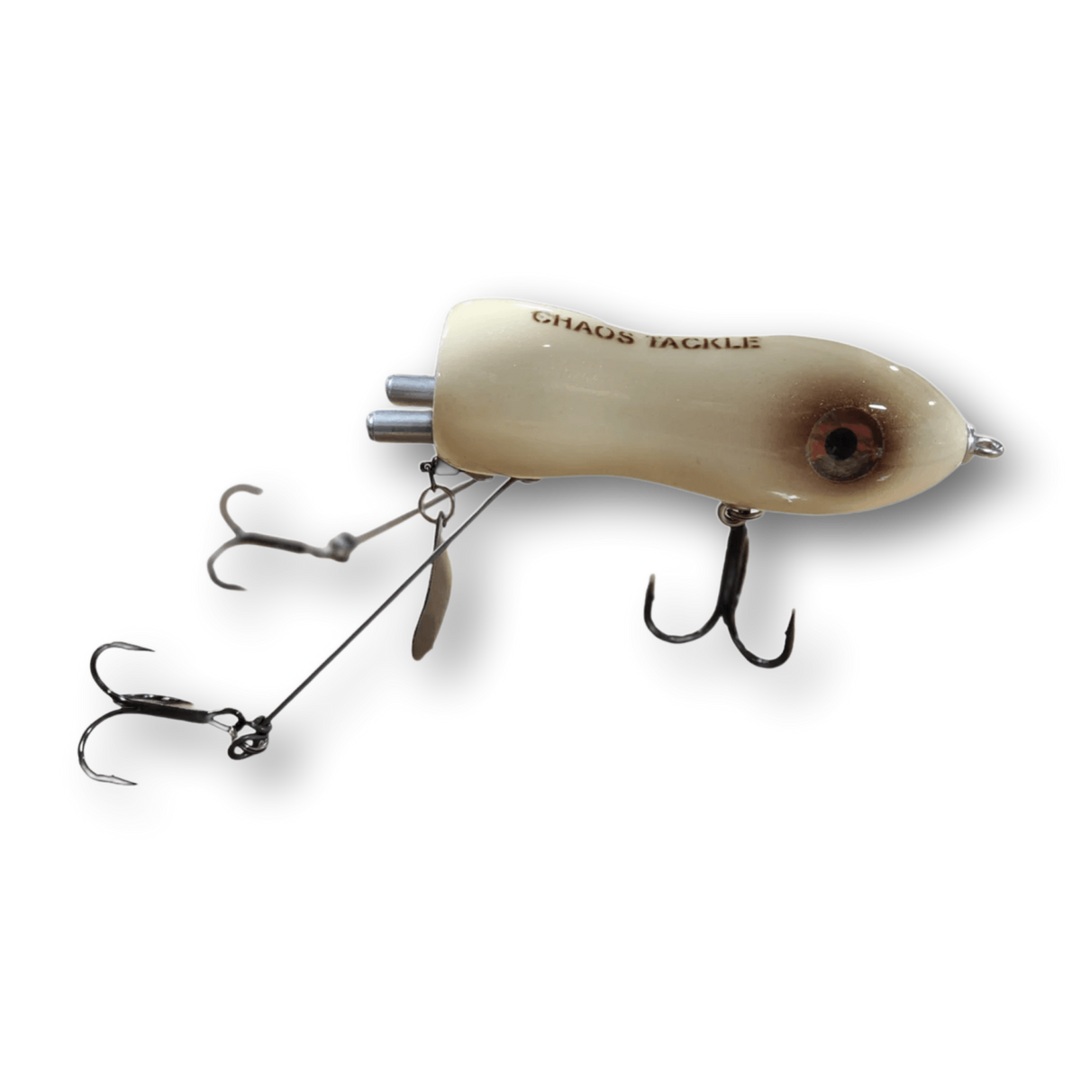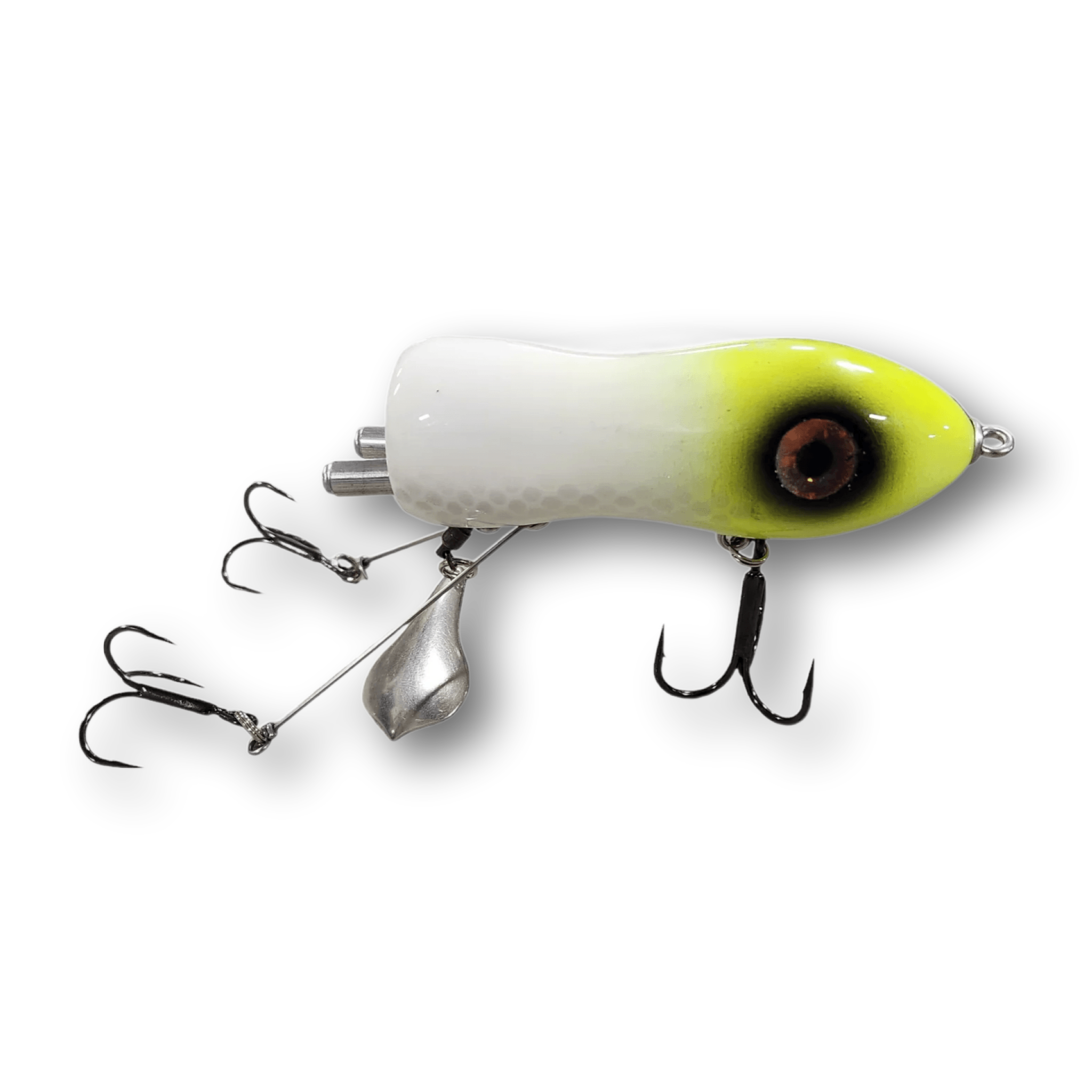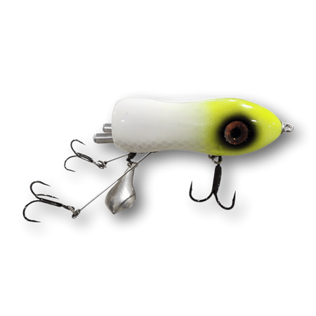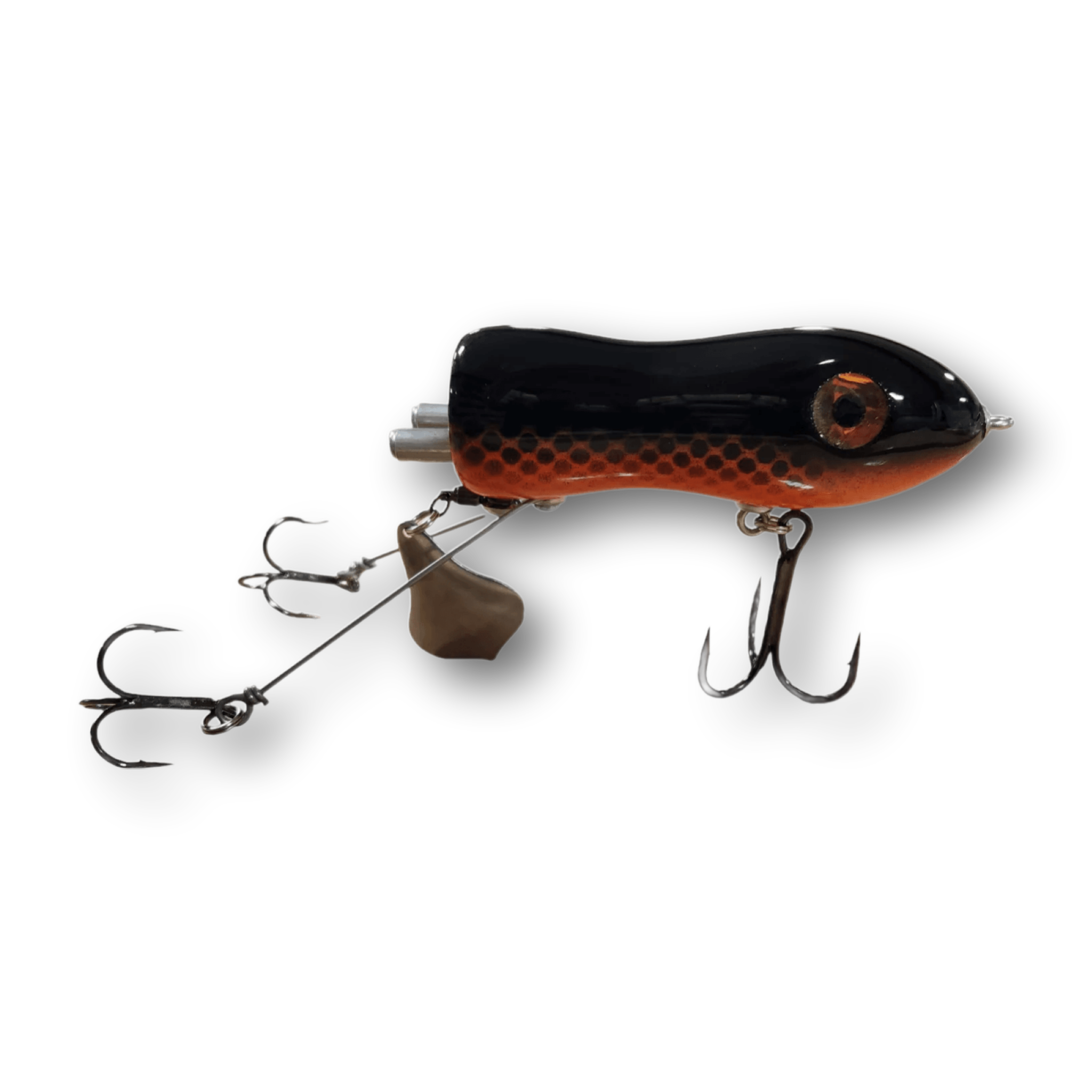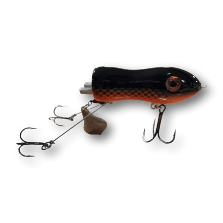 The Psycho Flap Tail is a hand made cedar topwater lure. Fish a Flap Tail very slow to medium speed for explosive strikes. The Flap Tail has two pins and a stainless steel blade on the back of the lure. The stainless steel blade makes contact with the two pins during the retrieve making a distinctive loud pinking sound game fish find irresistible. The Psycho Flap Tail utilizes spreader wires for the back hooks this greatly increases hookup percentage. The Psycho Flap Tail comes with one 6/0 Premium Black Trident Treble Hook on the front and a 2/0 on each side of the spreaders.