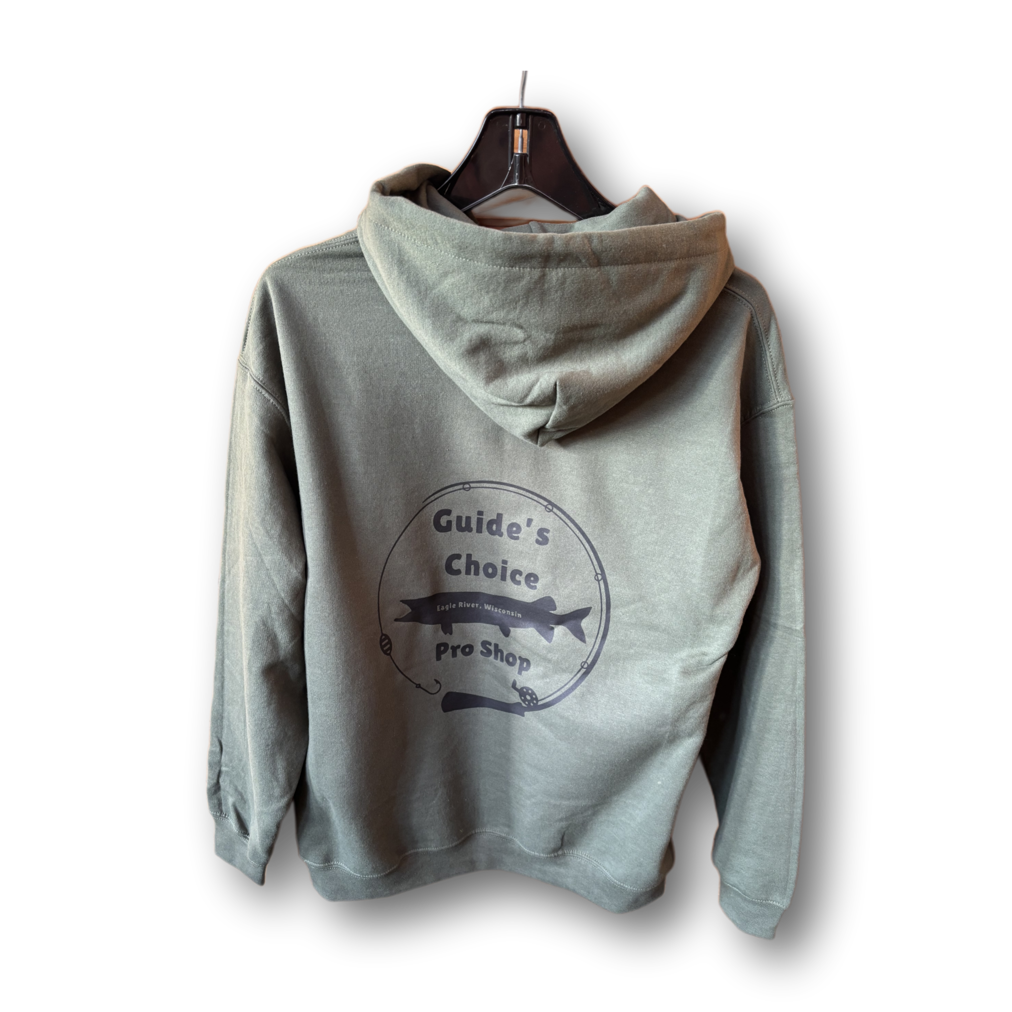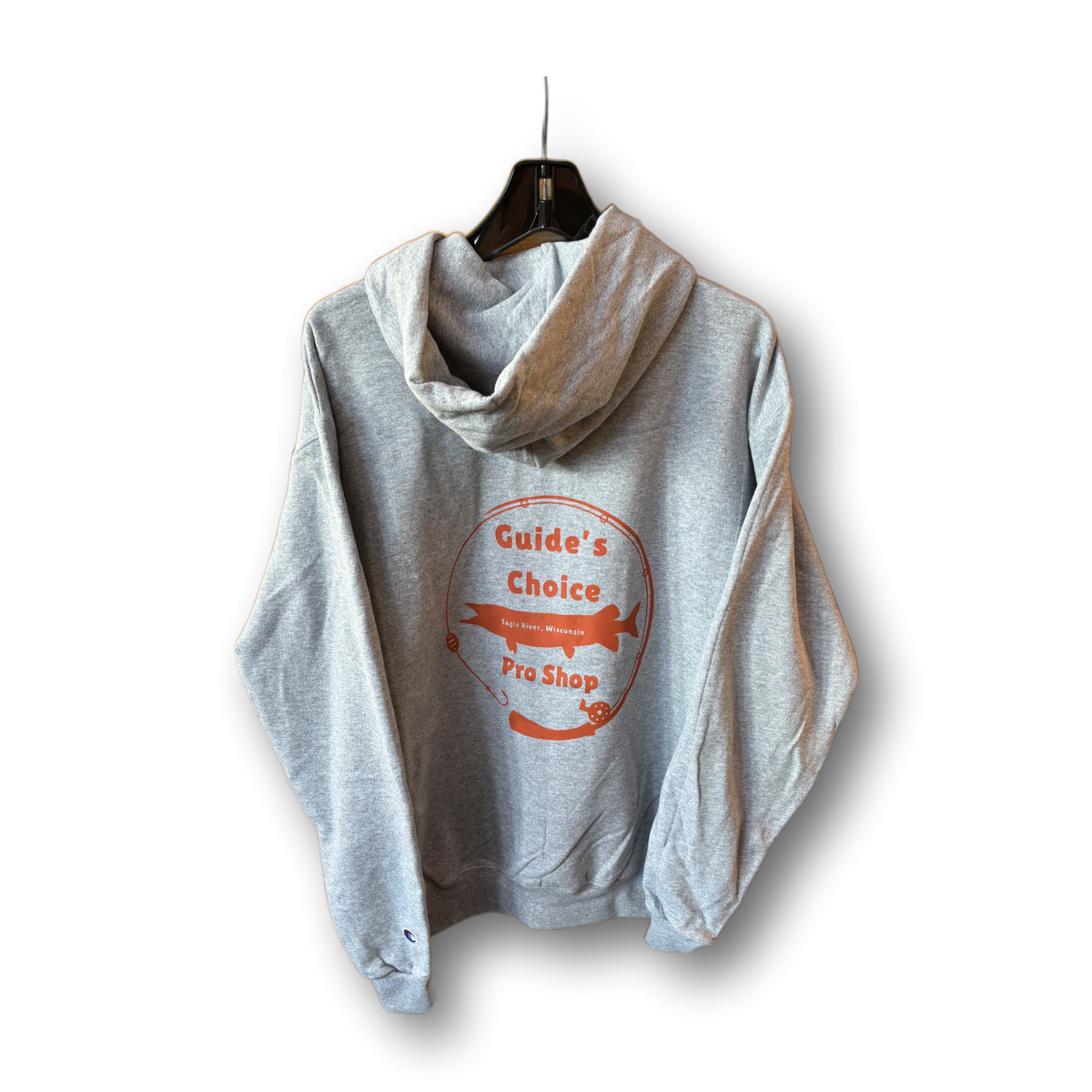 Choose from a green Gildan brand hoodie or grey Champion brand hoodie with the Guide's Choice Pro Shop log on front and back.