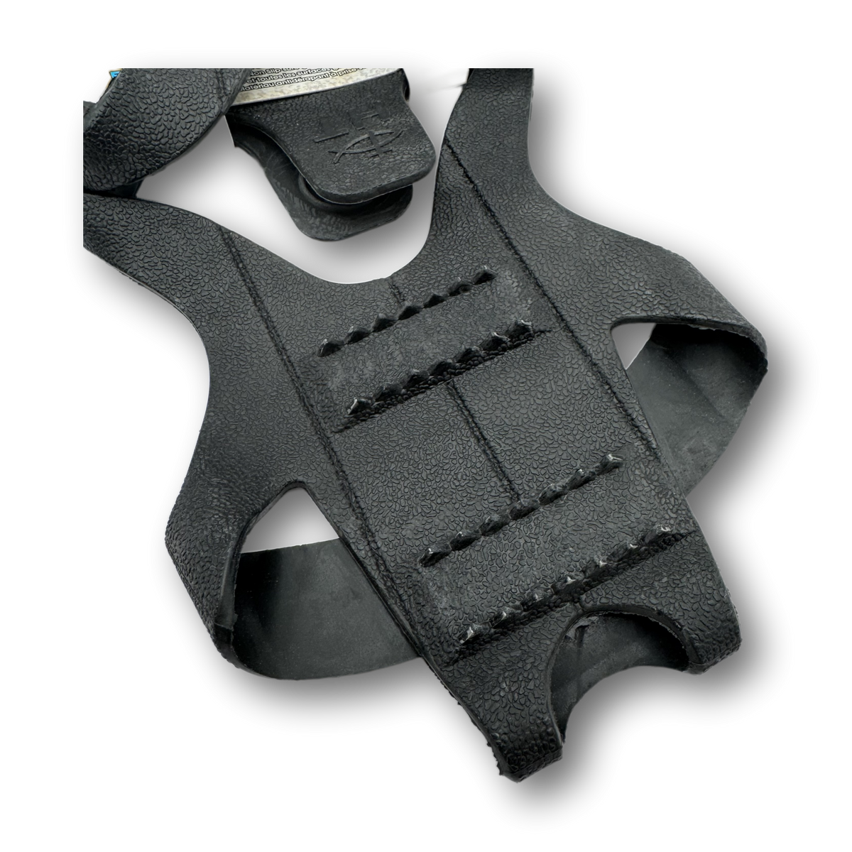 - Traction: Four rows of steel teeth/spikes dig into ice and snow for sure footing.