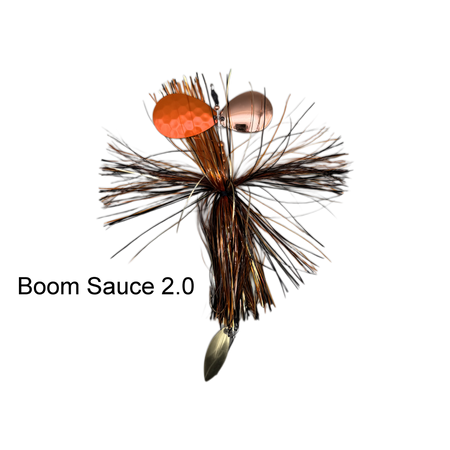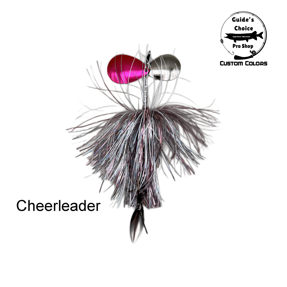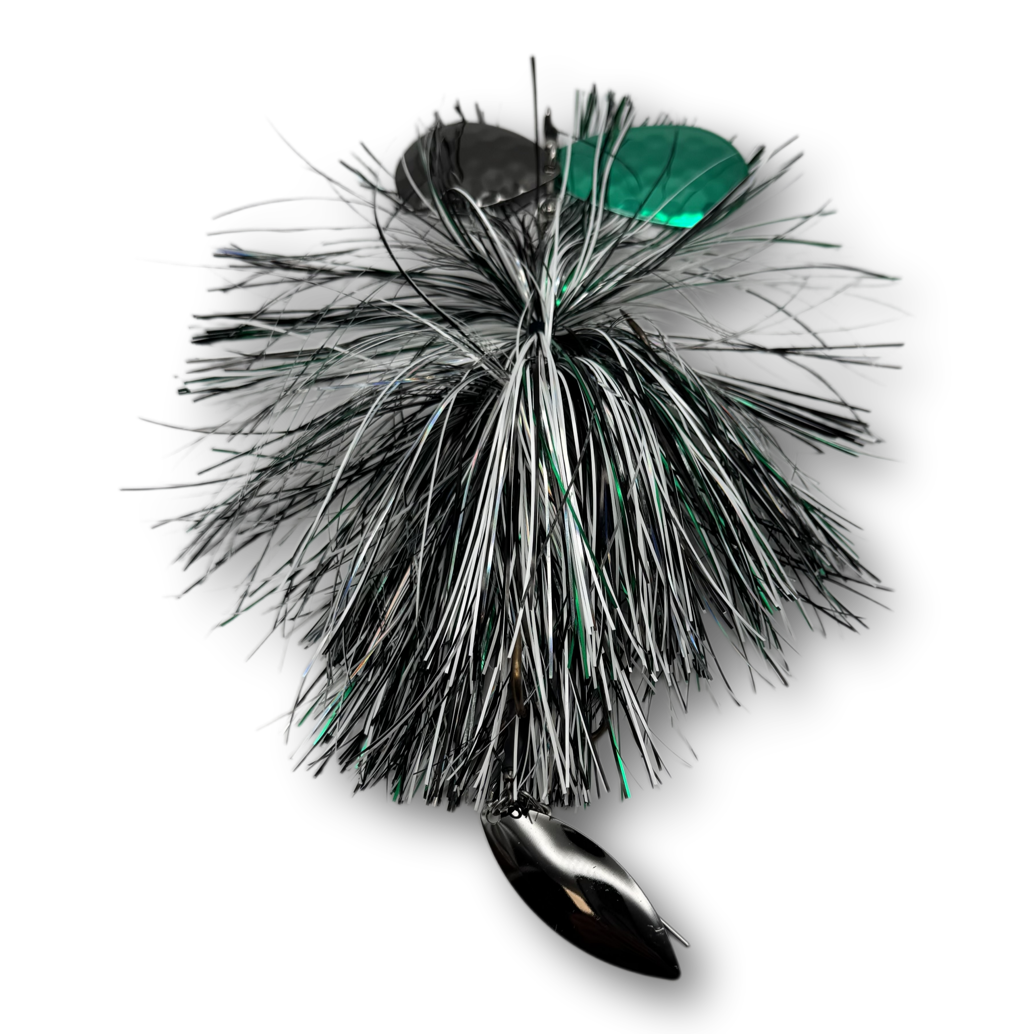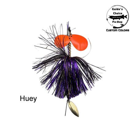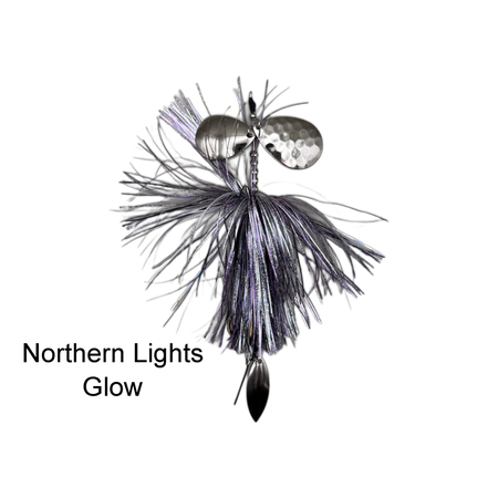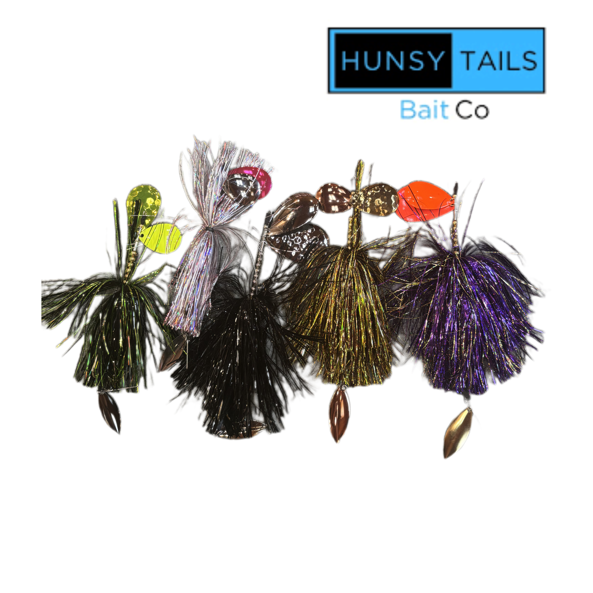 Introducing the 7/8 Banger from HunsyTails Bait Co., a standout bladed bait for musky fishing. Unlike standard bucktails, it features two different-sized Colorado blades and a willow trailer with a ticker. The rear blade’s ticker adds unique noise, enhancing flash and vibration beyond typical bladed baits. Measuring 10 inches long and weighing 2.1 ounces, the 7/8 Banger is designed to attract big muskies with its distinctive action and sound.