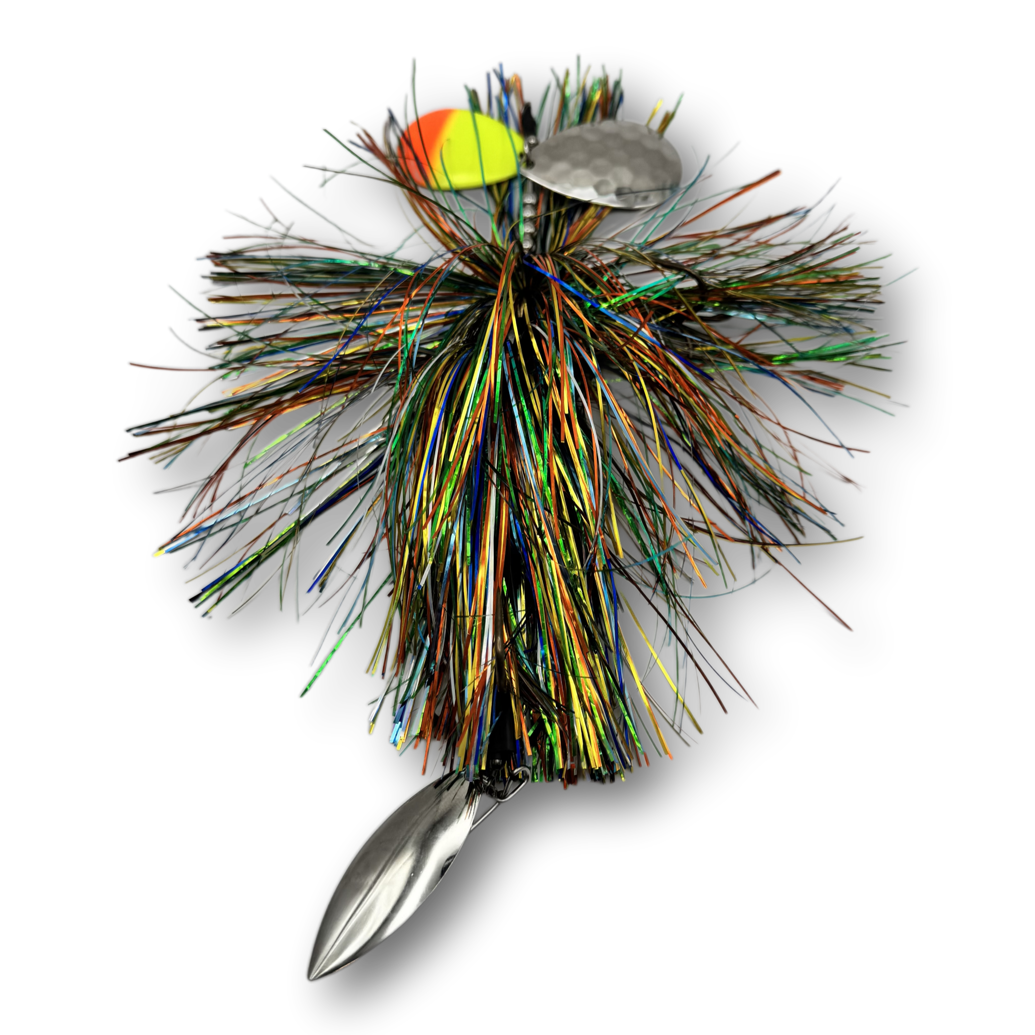 Introducing the 7/8 XL Banger from HunsyTails Bait Co., an enhanced bladed bait for musky fishing. This bucktail surpasses standard designs with two different-sized Colorado blades and a willow trailer featuring a ticker. The rear blade’s ticker adds unique noise, amplifying flash and vibration beyond typical bladed baits. Compared to the standard 7/8 Banger, the XL version includes an extra skirt, hook, and added weight for a larger profile. Measuring 10 inches long and weighing 3.1 ounces, the 7/8 XL Banger is crafted to lure big muskies with its bold action and sound.