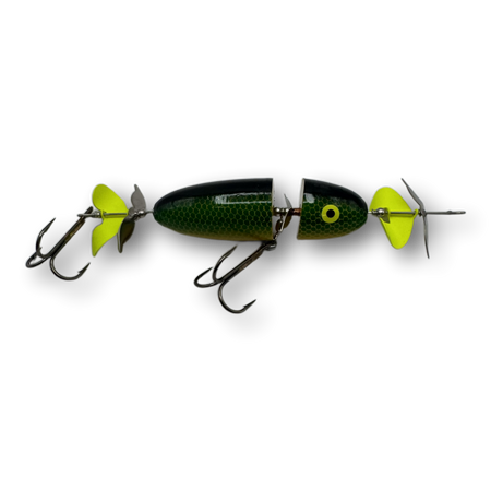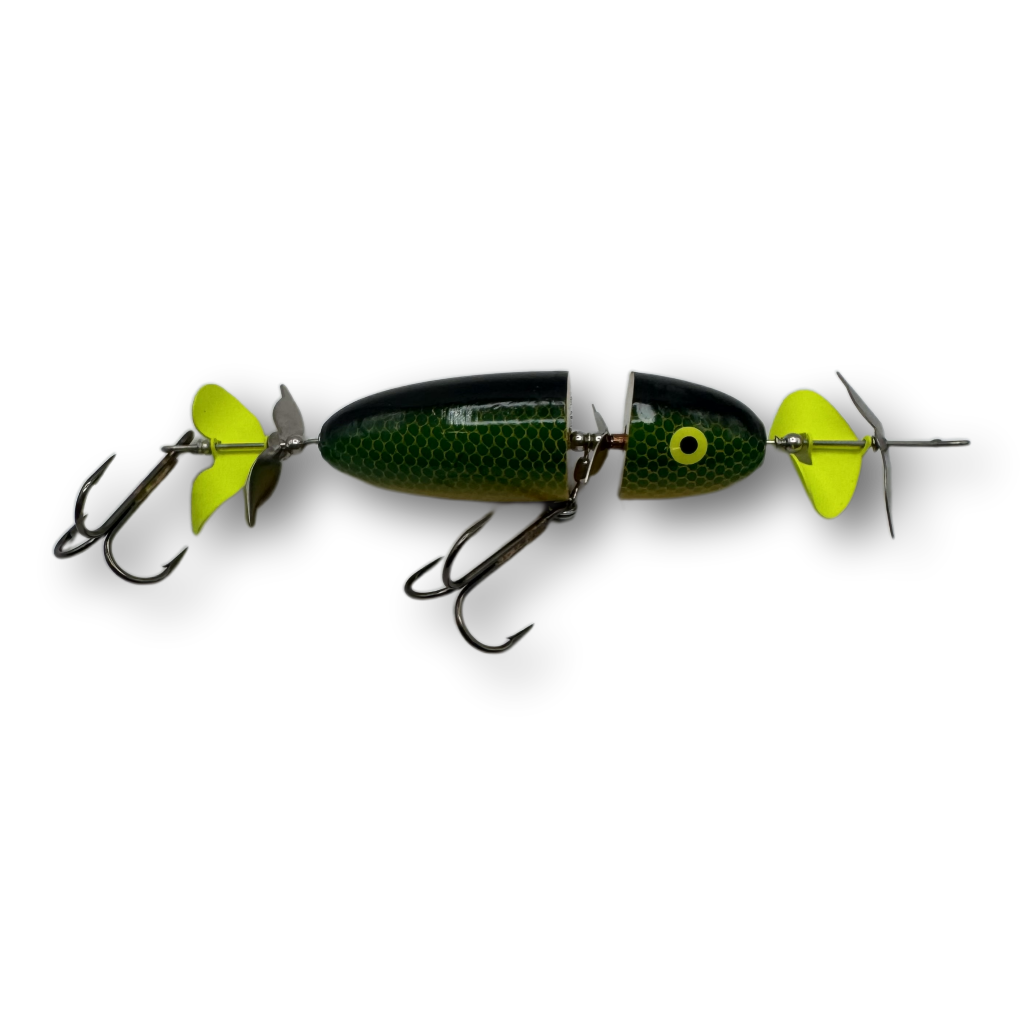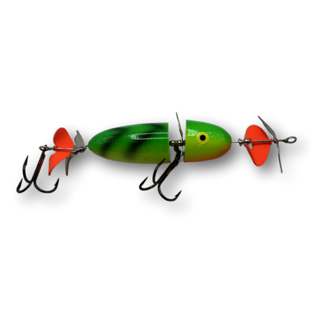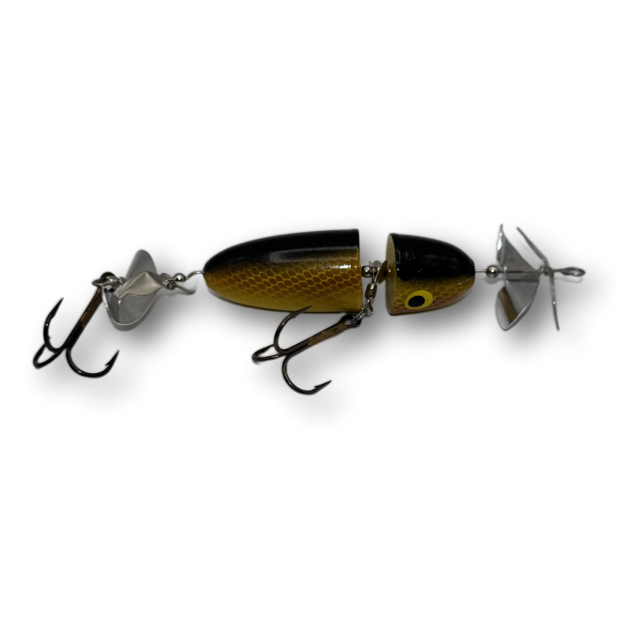 The Mouldy’s Propper Topper is a legendary topwater bait designed to call in monster muskies with explosive surface strikes. Its cupped prop tail spits, gurgles, and churns water, creating a loud, irresistible disturbance that drives big fish crazy. Built tough to handle violent attacks, the Propper Topper features durable hardware, a solid body, and a balanced design for long, accurate casts. Retrieve it slow for a steady plop or burn it fast to trigger reaction strikes — either way, the surface commotion is pure musky magic.