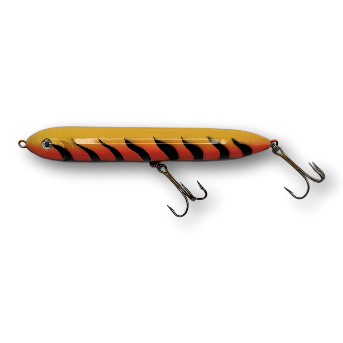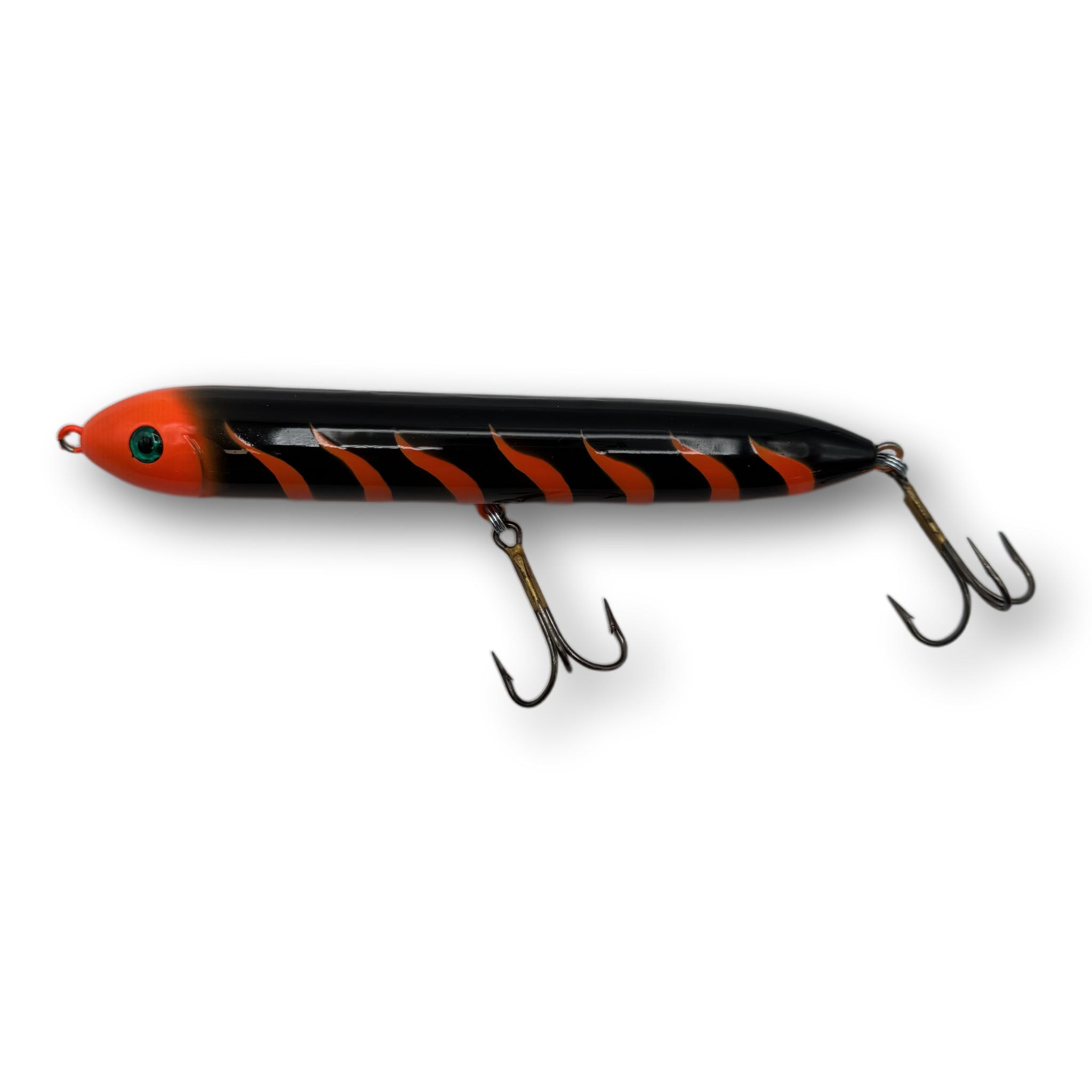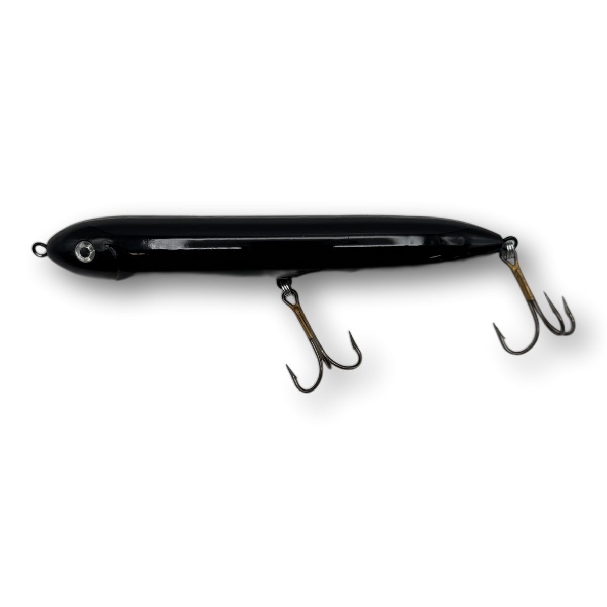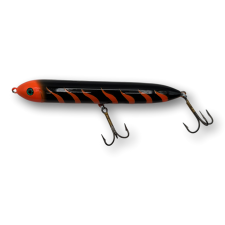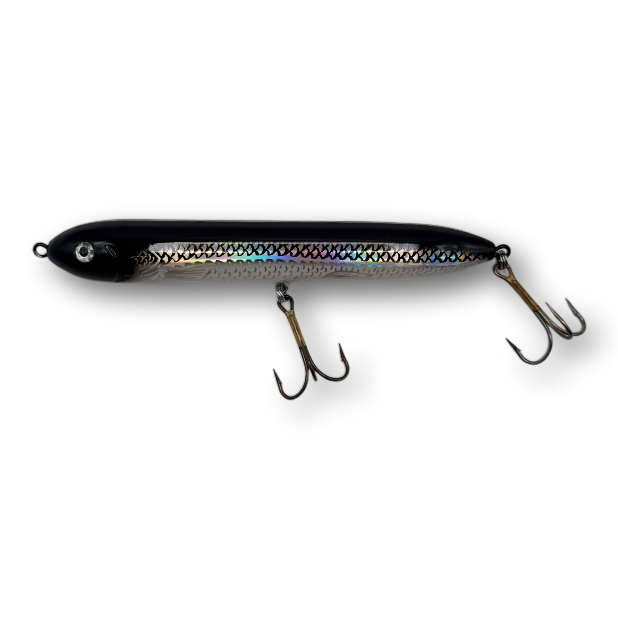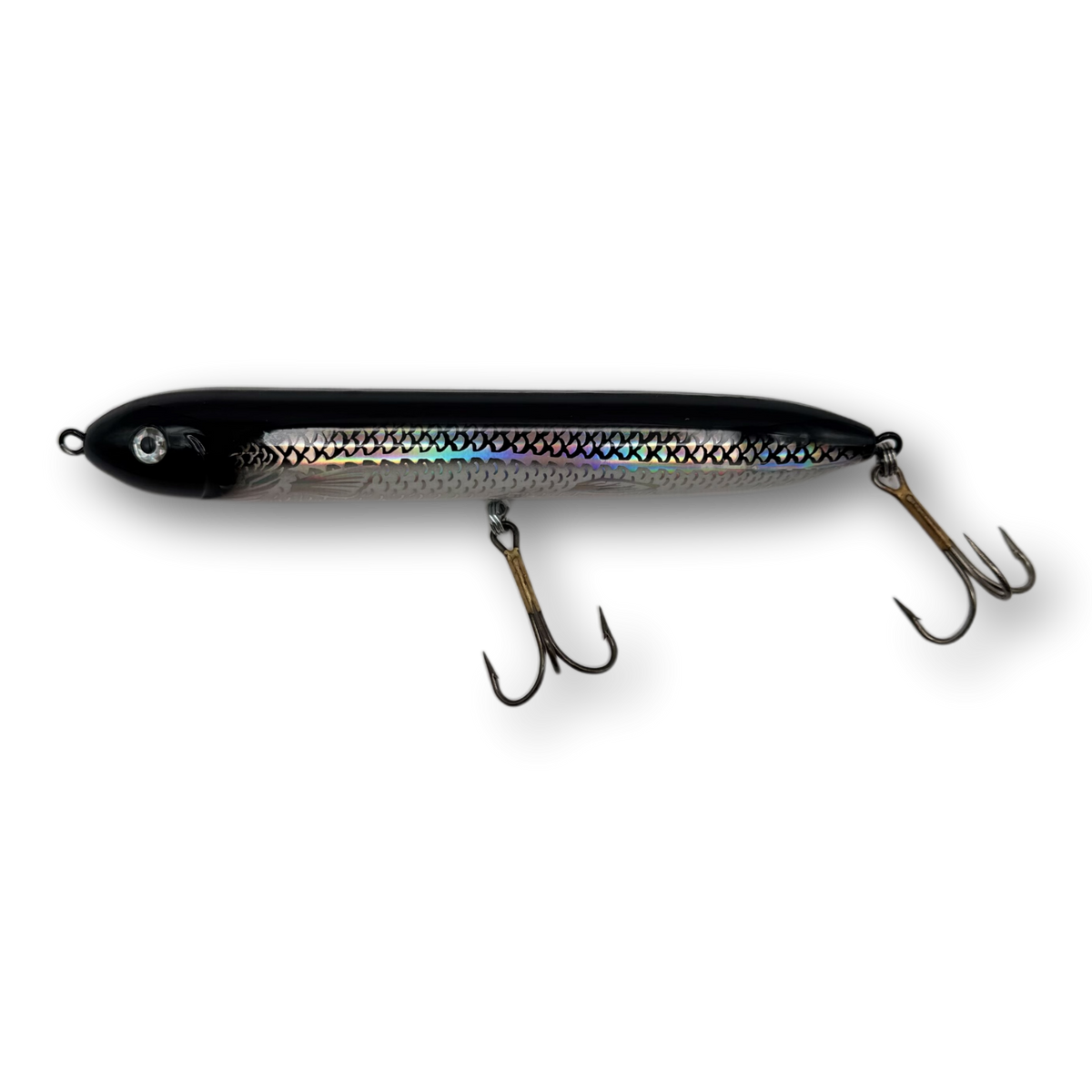 The Doc™ (3.5 ounces) is a classic walk-the-dog topwater lure. It has exceptional triggering capabilities resulting from its mesmerizing side-to-side action. At 9 inches in length, it represents a meal that trophy fish find appealing. It’s plastic body and tapered construction produce excellent hooking percentages for this type of lure. The fish’s teeth don’t penetrate the lure but rather they slide over the surface allowing quality hookups time after time. The size of the lure lures allows fishing even in heavy seas. Its buoyancy is perfected allowing easy working with a simple timely twitch…zig…zag…zig…zag…the lure glides back and forth pushing a signature wave that attracts the most stubborn of fish. A short pause between twitches allows you to witness a monster surface strike that you’ll always remember. The lure is further enhanced with internal rattles (silent version is optional) and paint schemes that are bottom oriented. The hand painted designs were developed to provide a contrasting image under the waterline…a silhouette that fish can easily target.