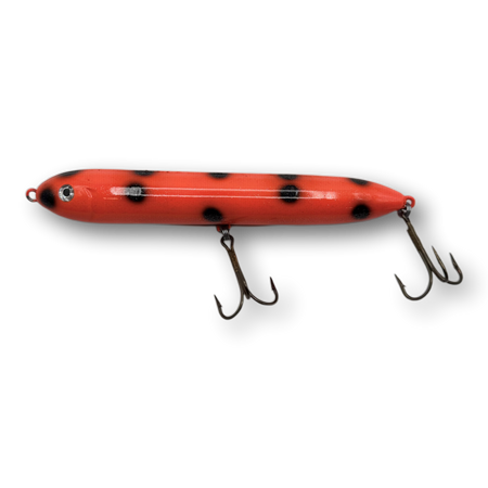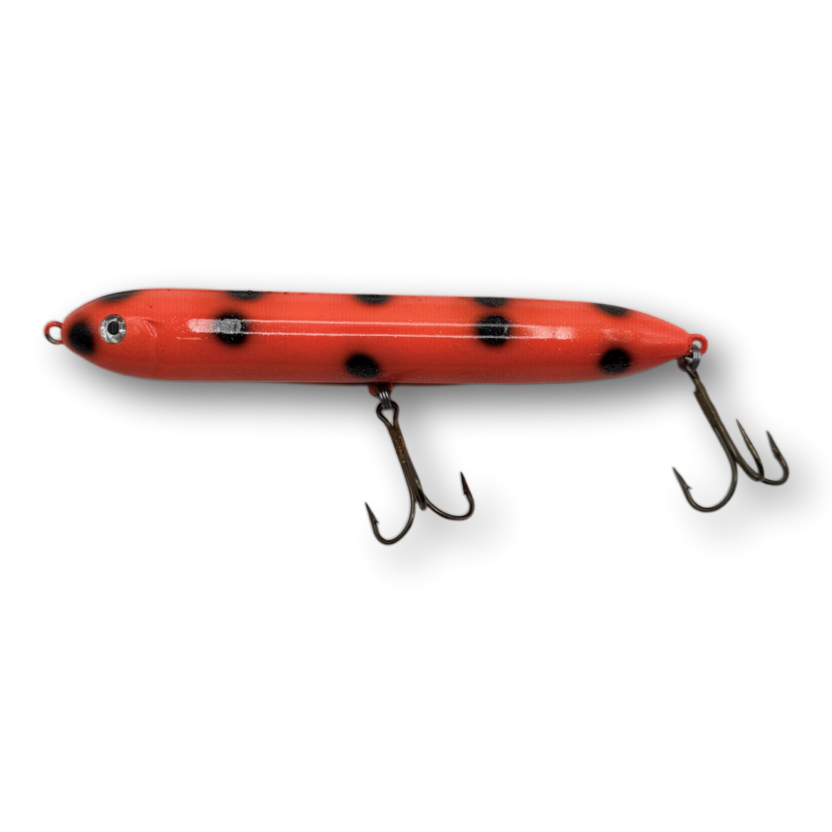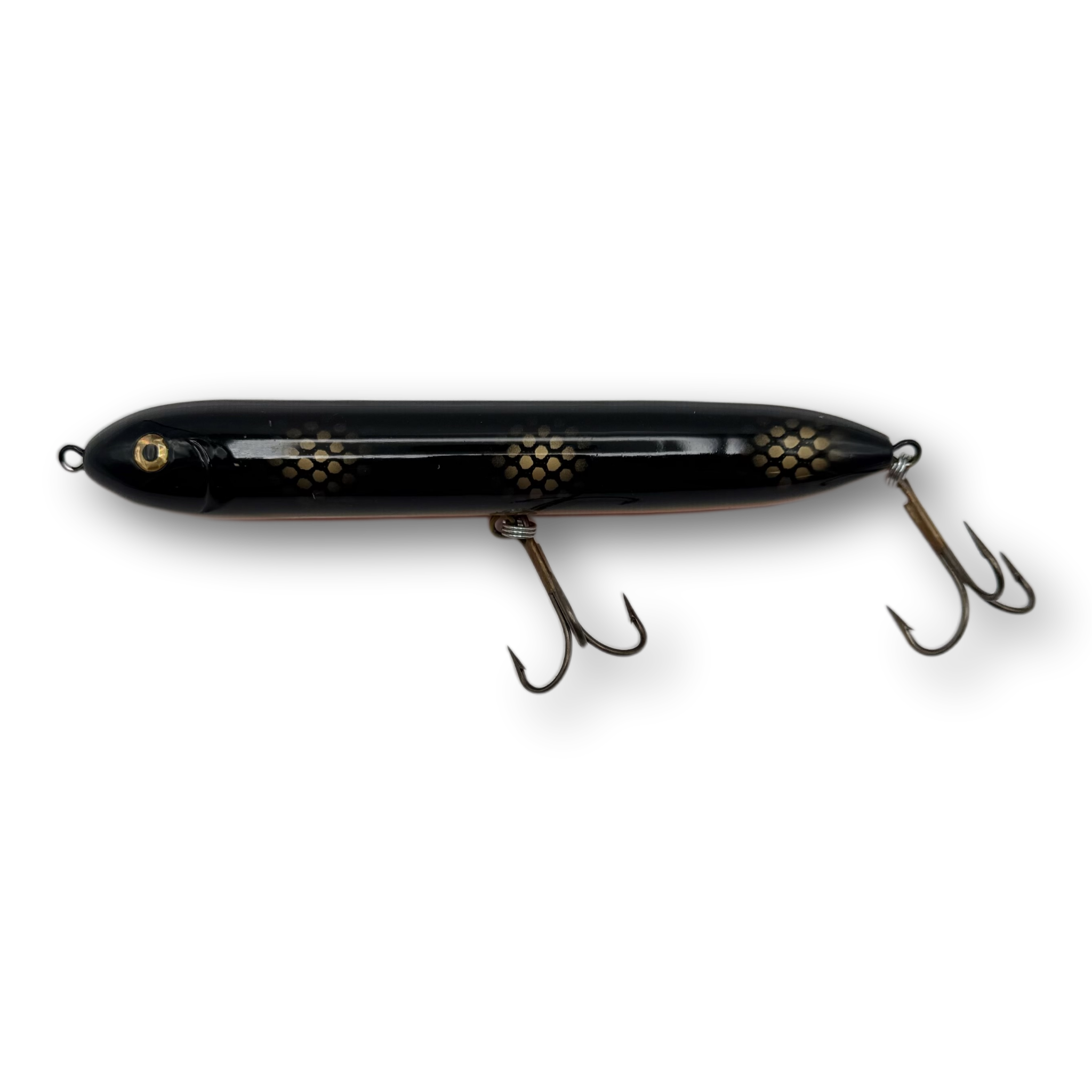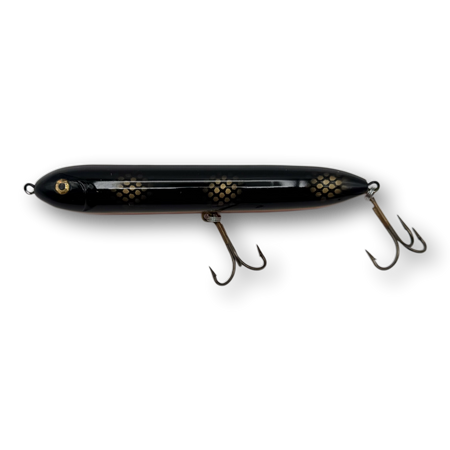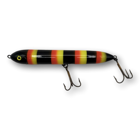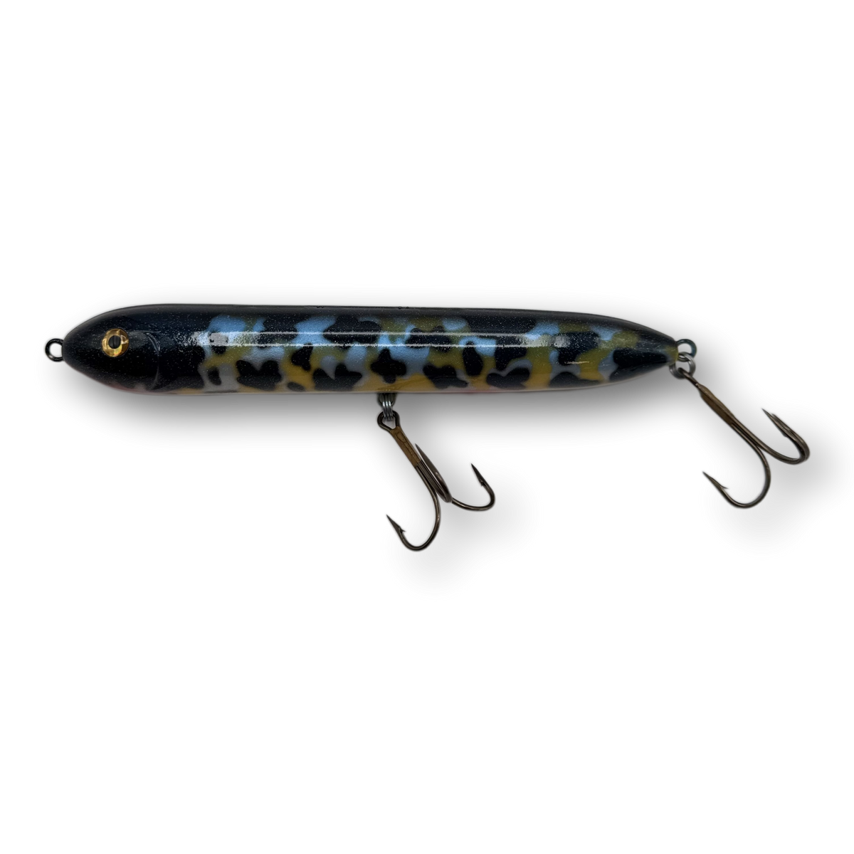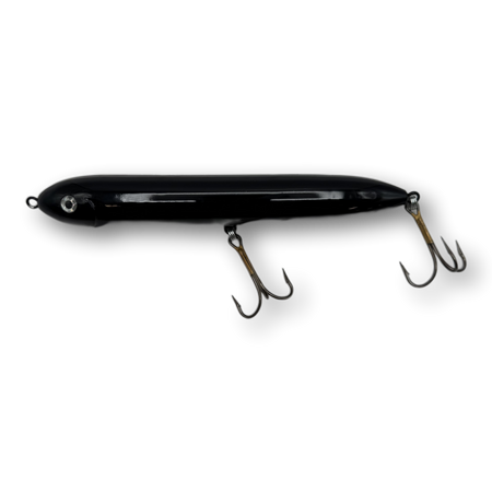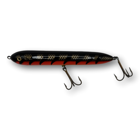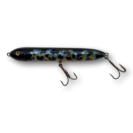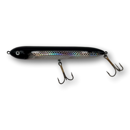 The Doc™ (3.5 ounces) is a classic walk-the-dog topwater lure. It has exceptional triggering capabilities resulting from its mesmerizing side-to-side action. At 9 inches in length, it represents a meal that trophy fish find appealing. It’s plastic body and tapered construction produce excellent hooking percentages for this type of lure. The fish’s teeth don’t penetrate the lure but rather they slide over the surface allowing quality hookups time after time. The size of the lure lures allows fishing even in heavy seas. Its buoyancy is perfected allowing easy working with a simple timely twitch…zig…zag…zig…zag…the lure glides back and forth pushing a signature wave that attracts the most stubborn of fish. A short pause between twitches allows you to witness a monster surface strike that you’ll always remember. The lure is further enhanced with internal rattles (silent version is optional) and paint schemes that are bottom oriented. The hand painted designs were developed to provide a contrasting image under the waterline…a silhouette that fish can easily target.