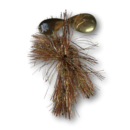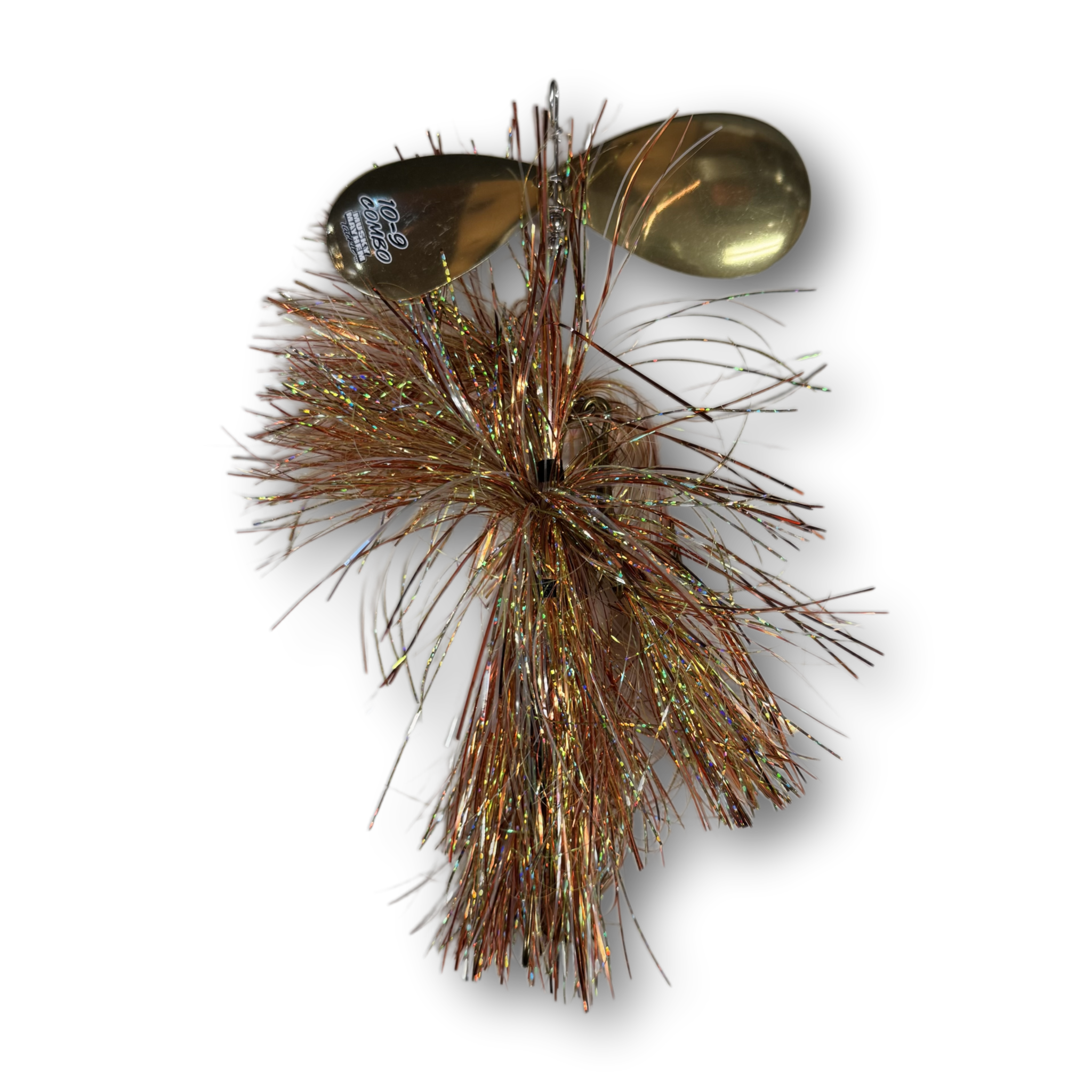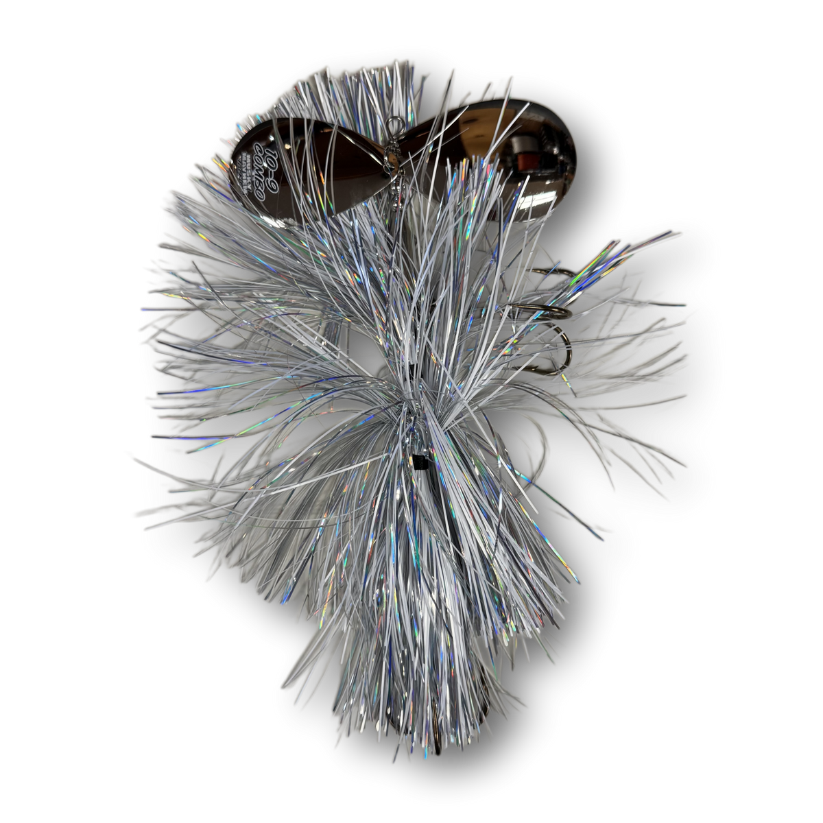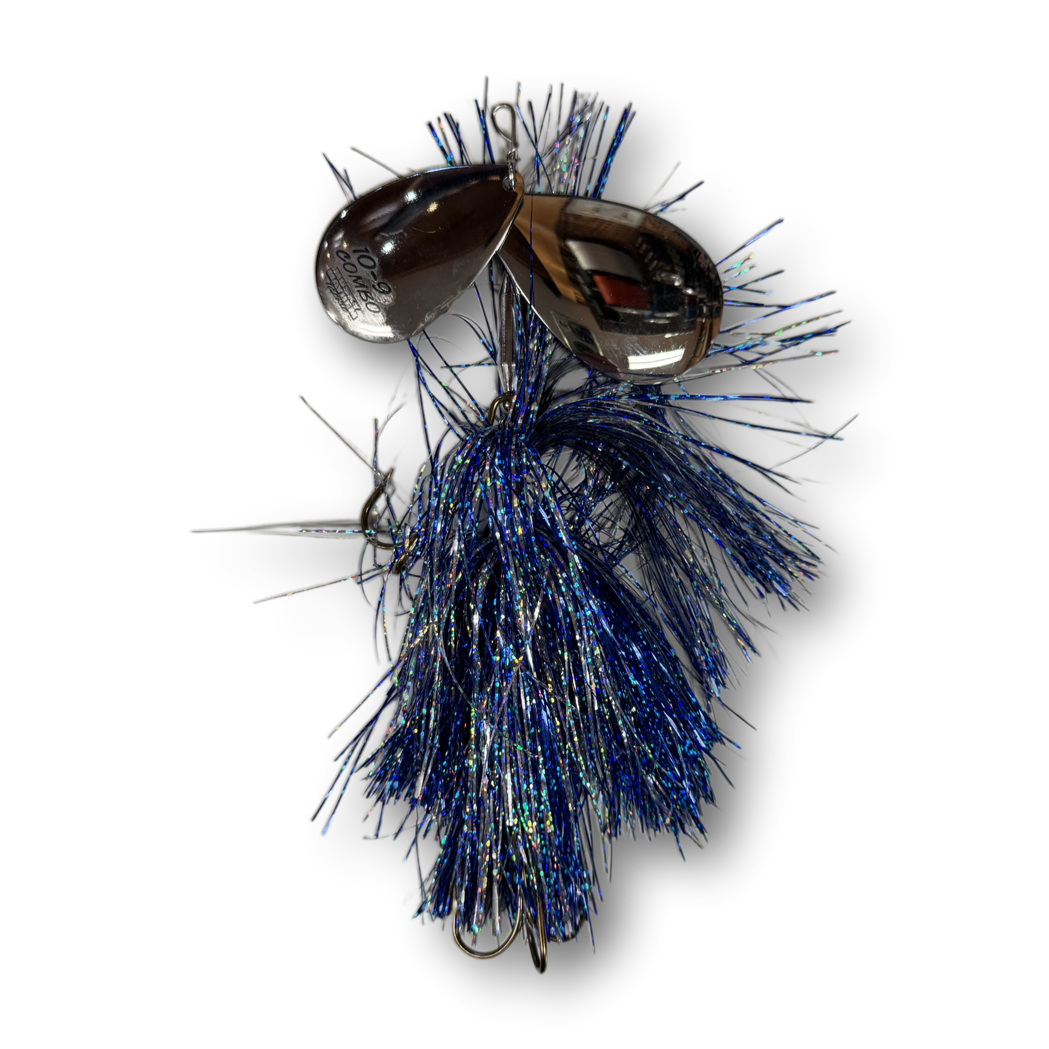 The NEW 10-9 Combo is now available. The 2 different sized spinner blades create a unique thump and vibration in the water all its own. The Classic Flashabou skirting gives it color, lifelike action and a huge profile, putting it right up there next to the Double Cowgirl as the best baitfish simulating inline spinner on the market today. Two 7/0 Mustad hooks give it an excellent hooking percentage, so you are sure to catch the big one.