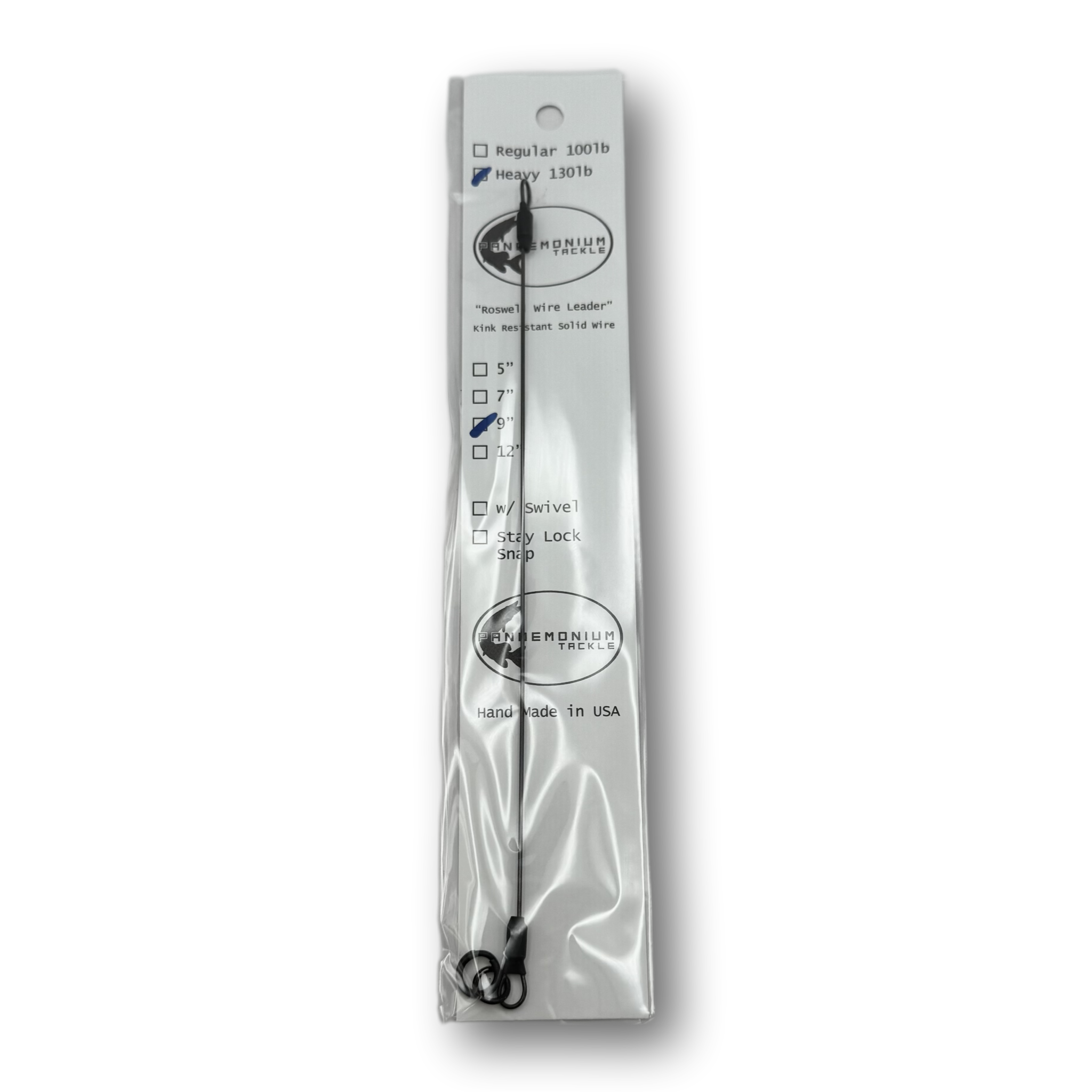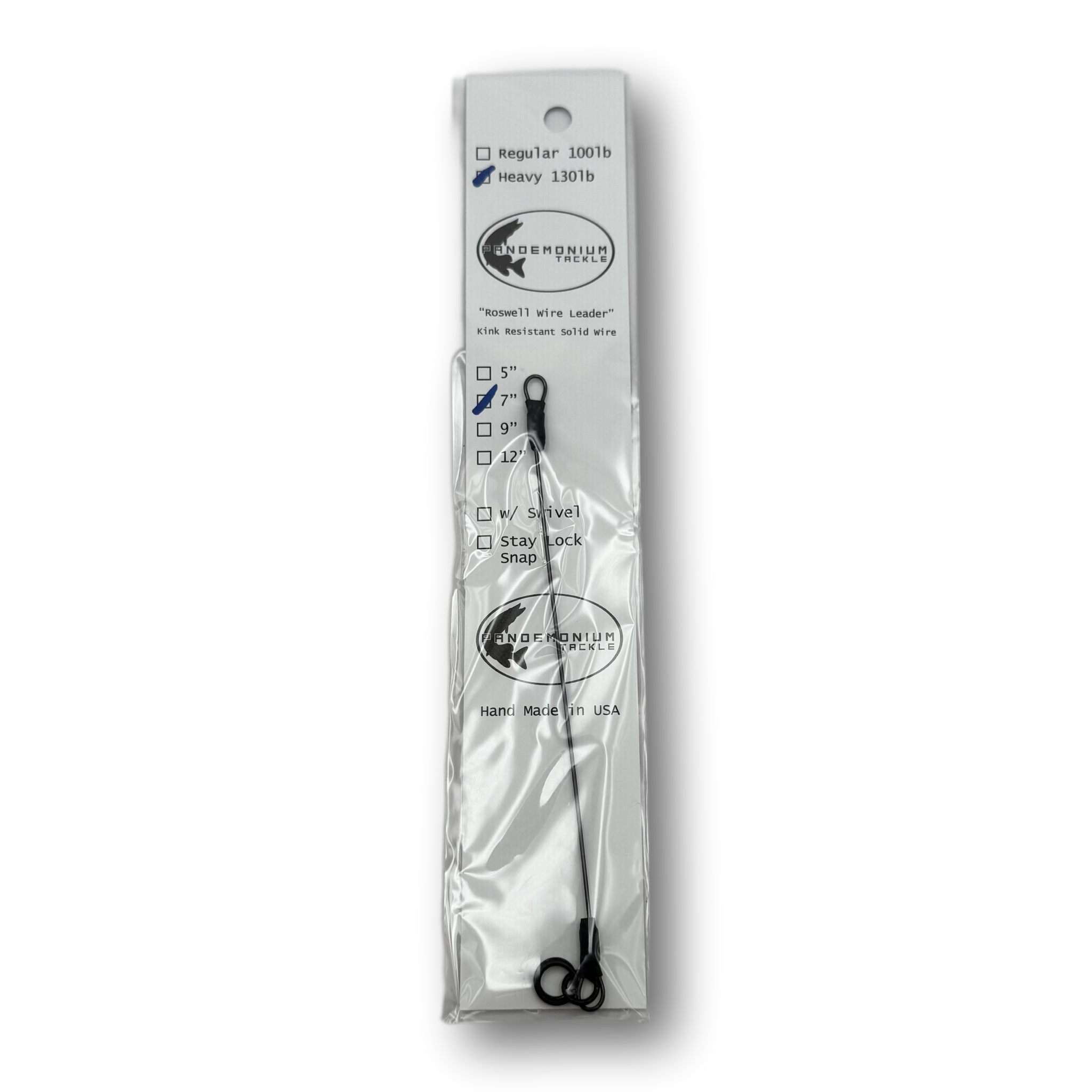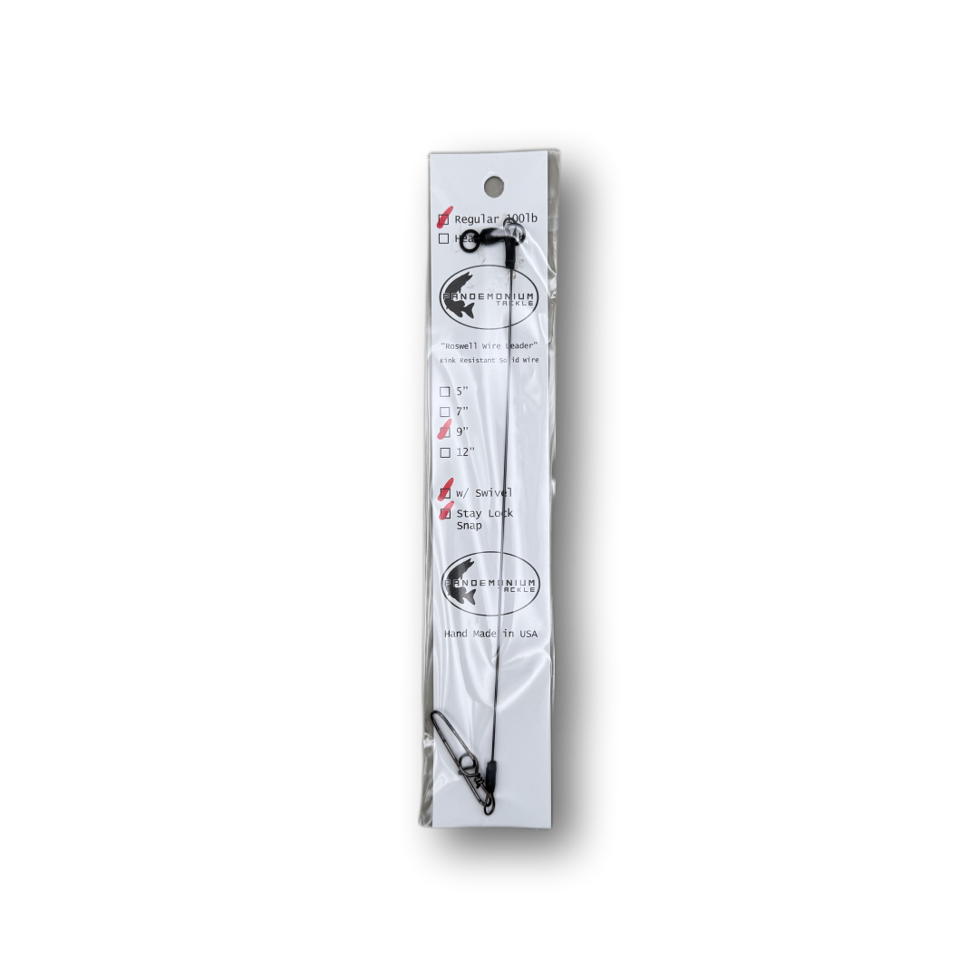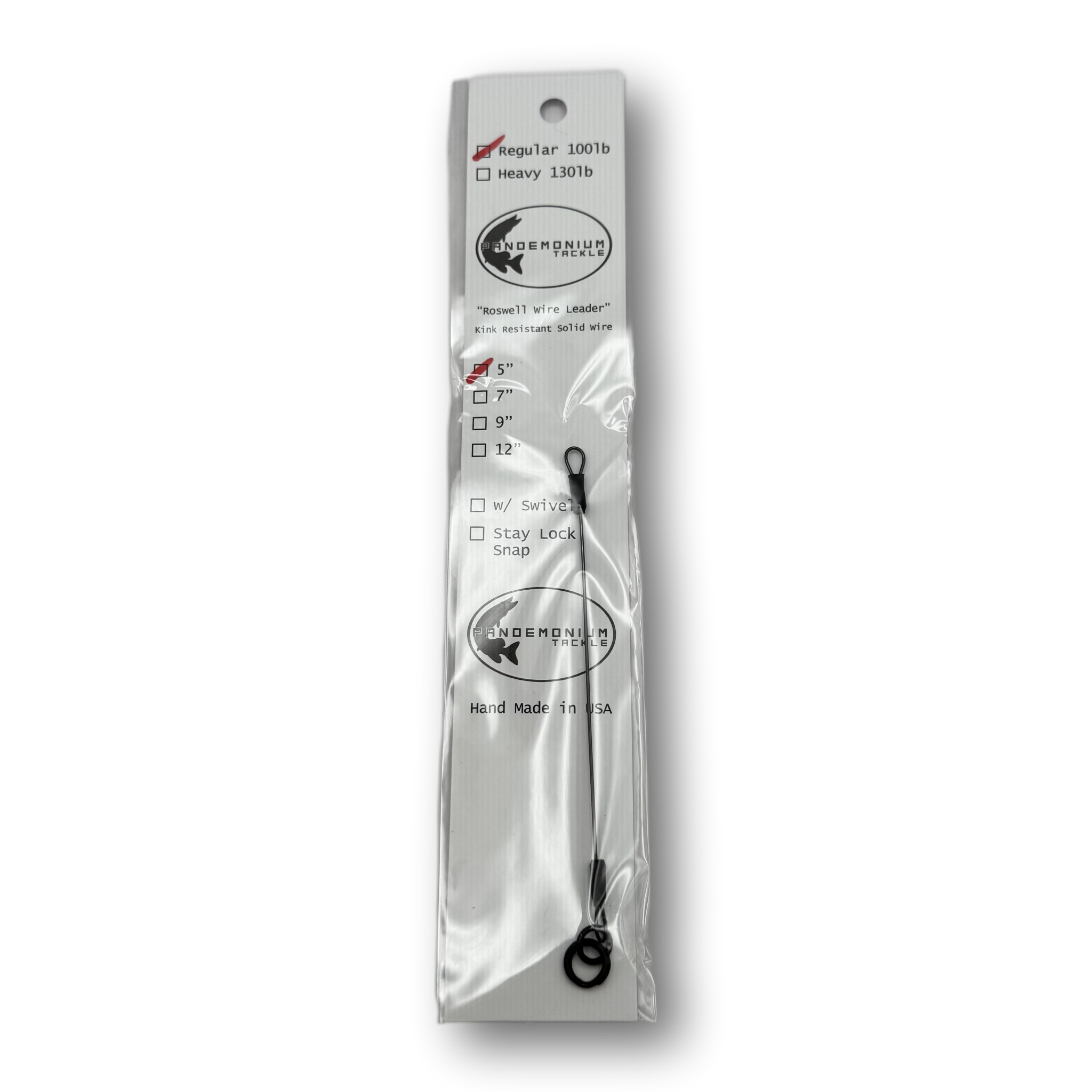 Introducing the "Roswell Wire Leader" — named playfully after Pandemonium Tackle jokingly claimed to have found this material on a UFO! Crafted from an ultra-durable, kink-resistant alloy, this solid wire measures .034" in diameter. Each leader is assembled using top-quality crimps, carefully aligned before crimping to ensure maximum strength.