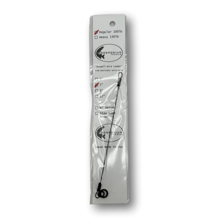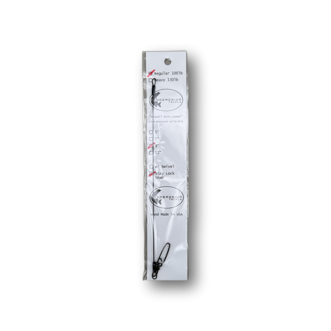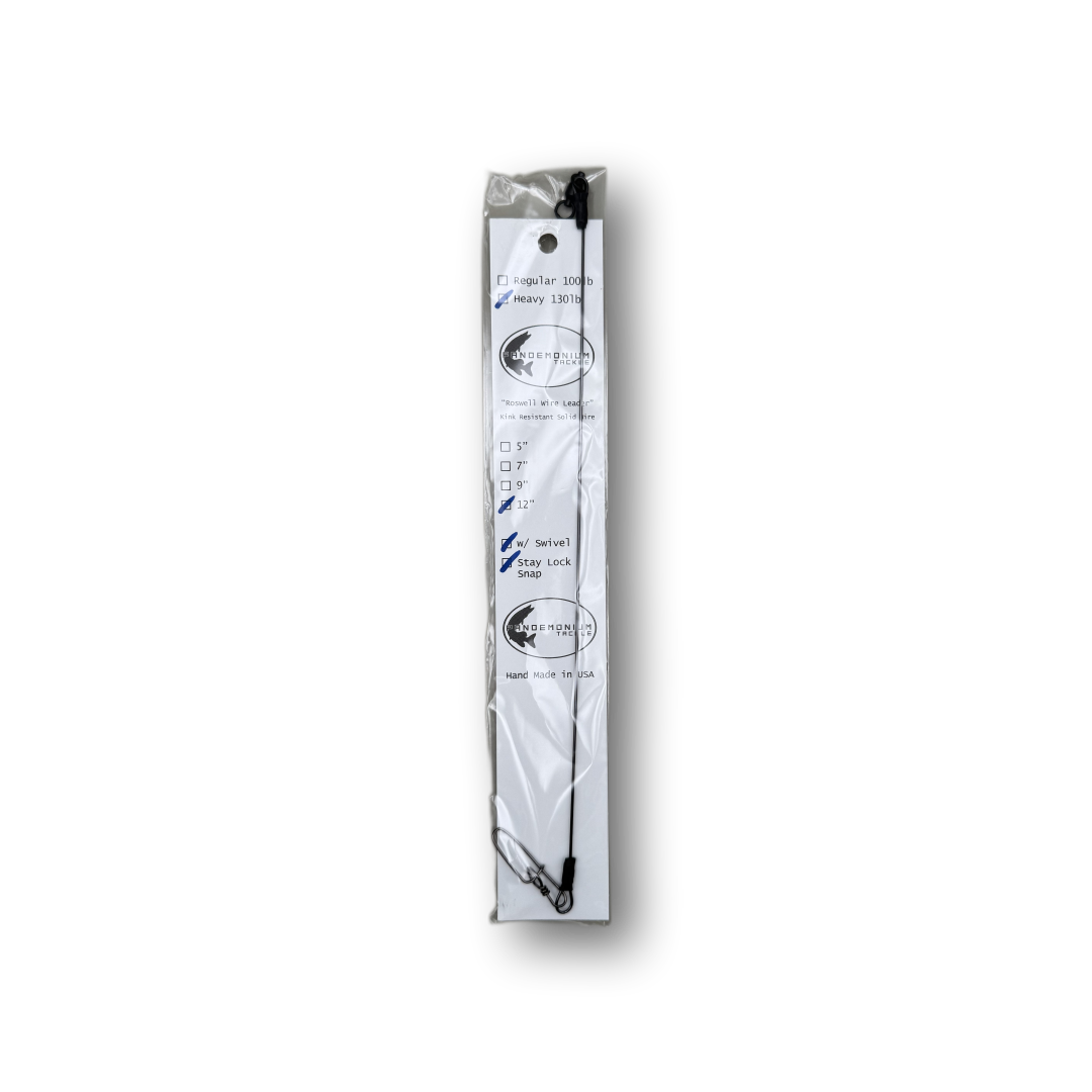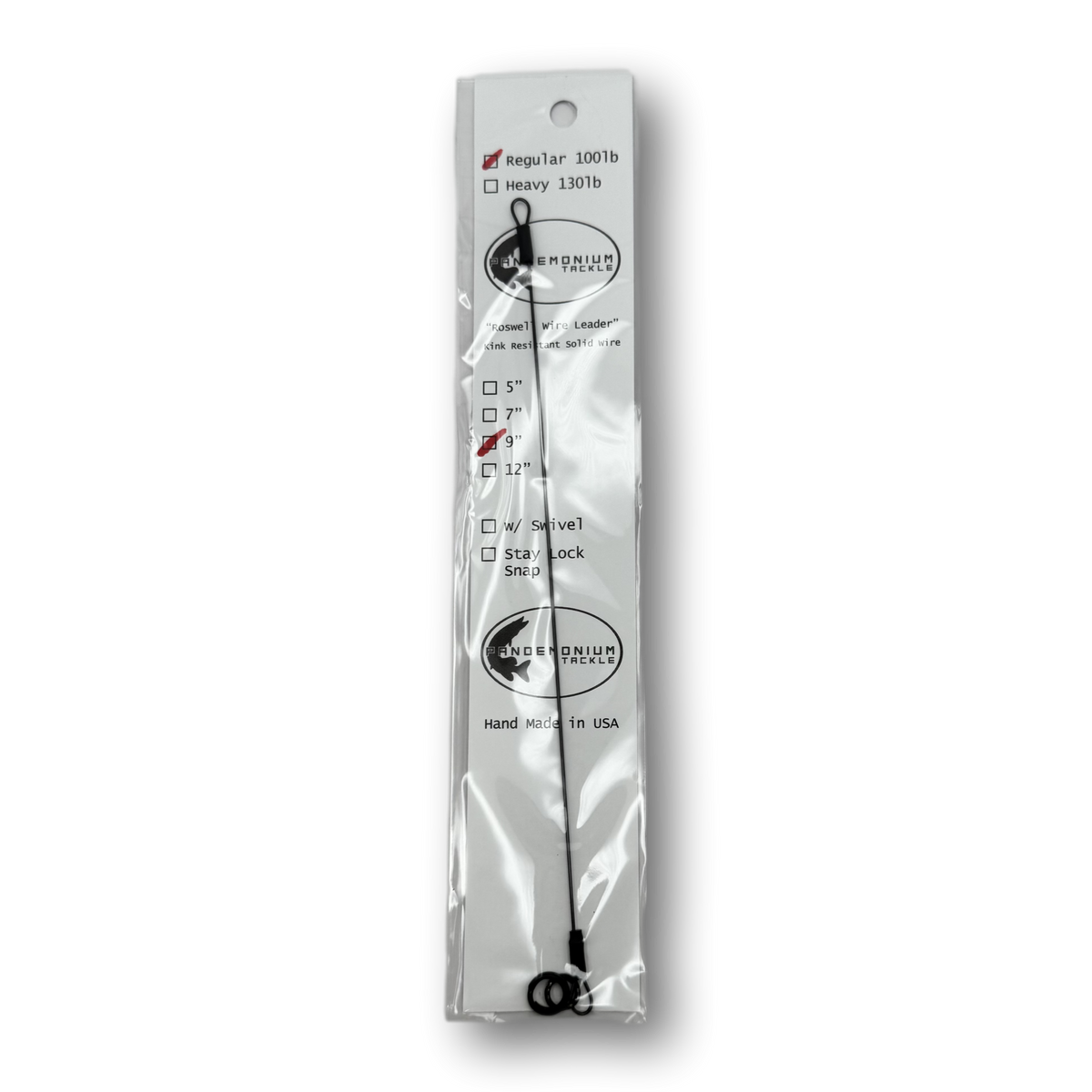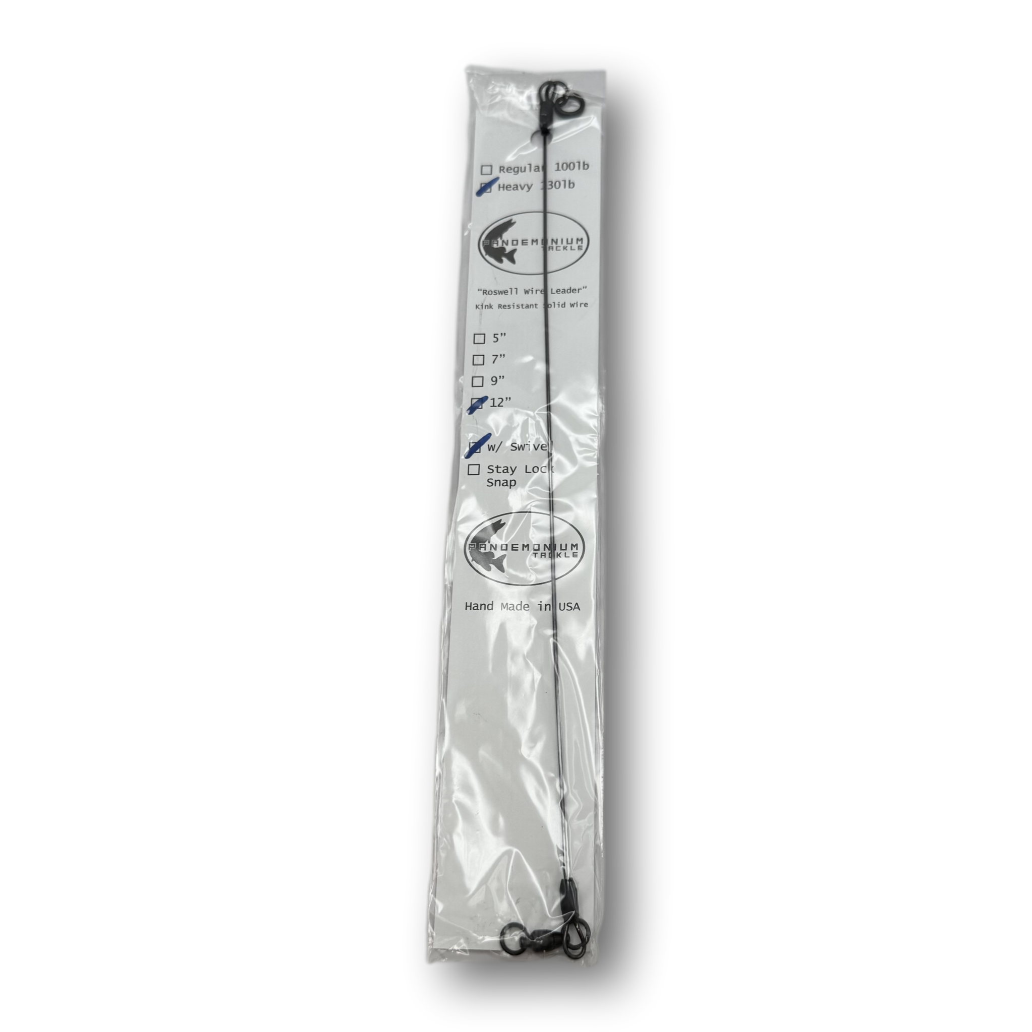 Introducing the "Roswell Wire Leader" — named playfully after Pandemonium Tackle jokingly claimed to have found this material on a UFO! Crafted from an ultra-durable, kink-resistant alloy, this solid wire measures .034" in diameter. Each leader is assembled using top-quality crimps, carefully aligned before crimping to ensure maximum strength.