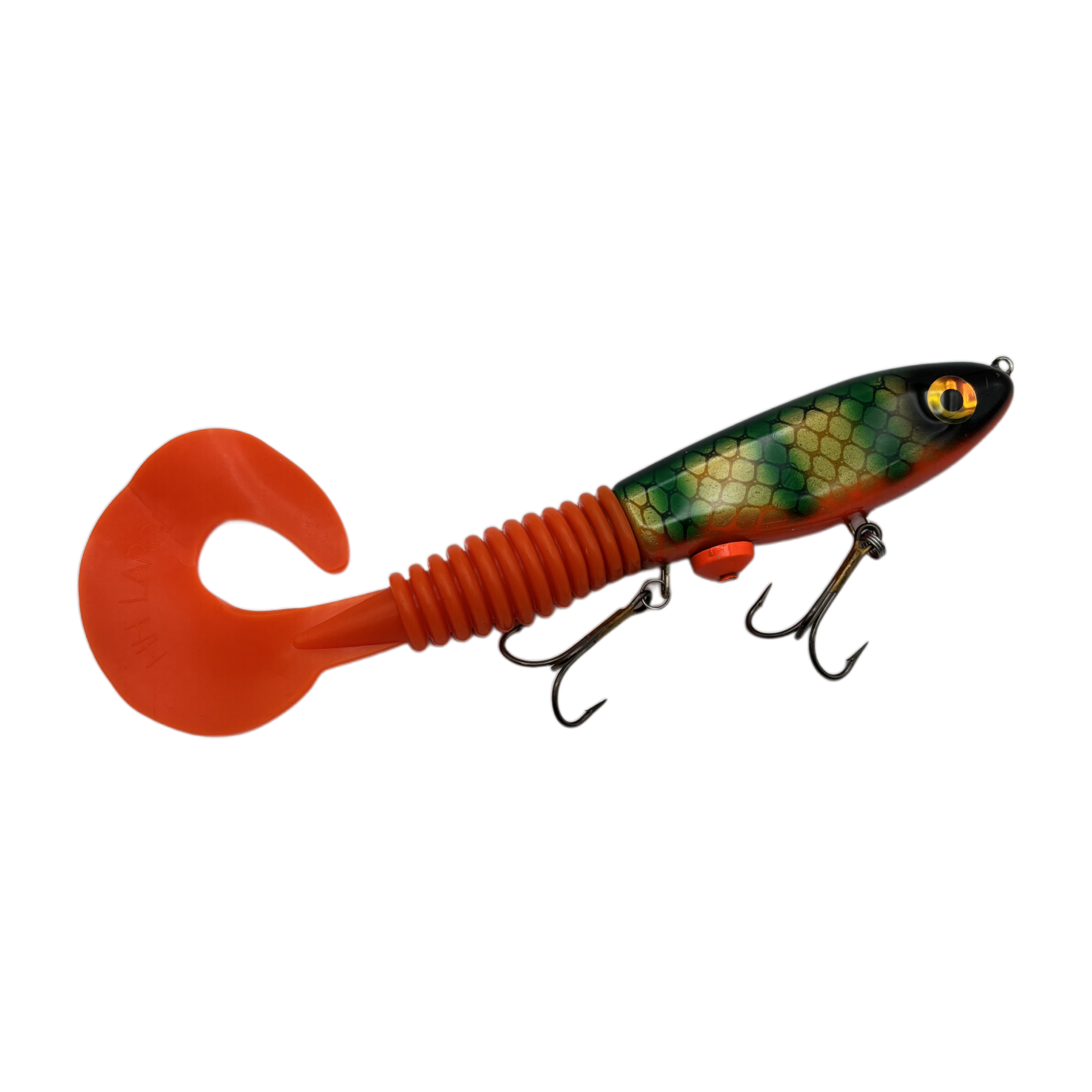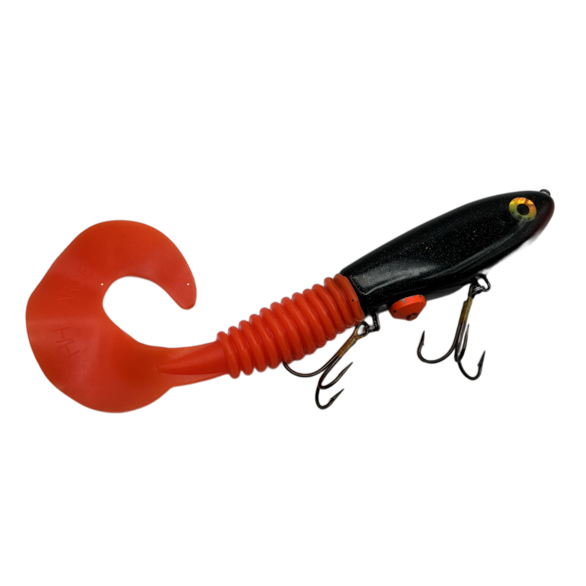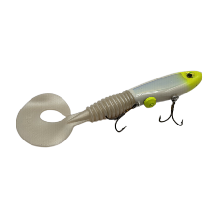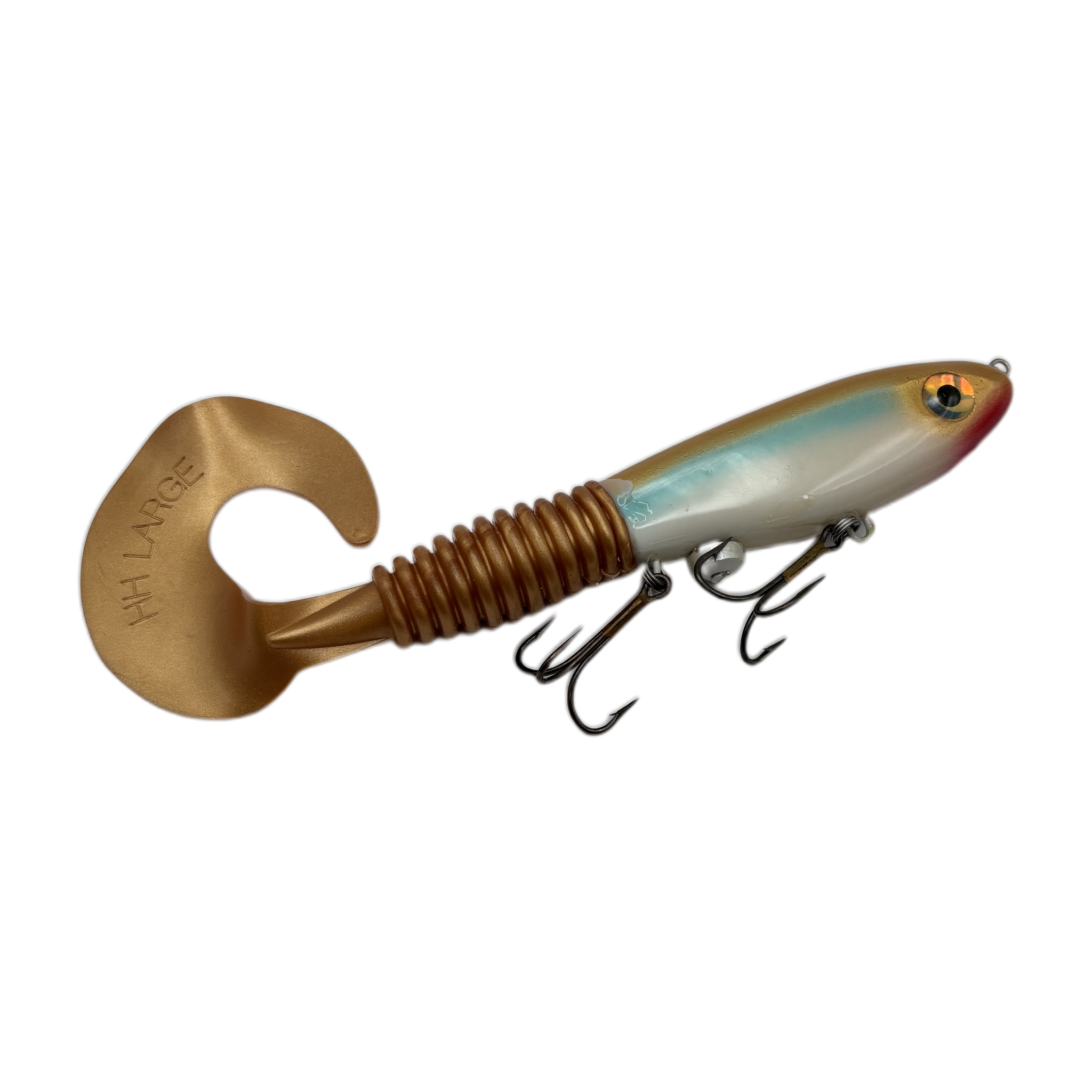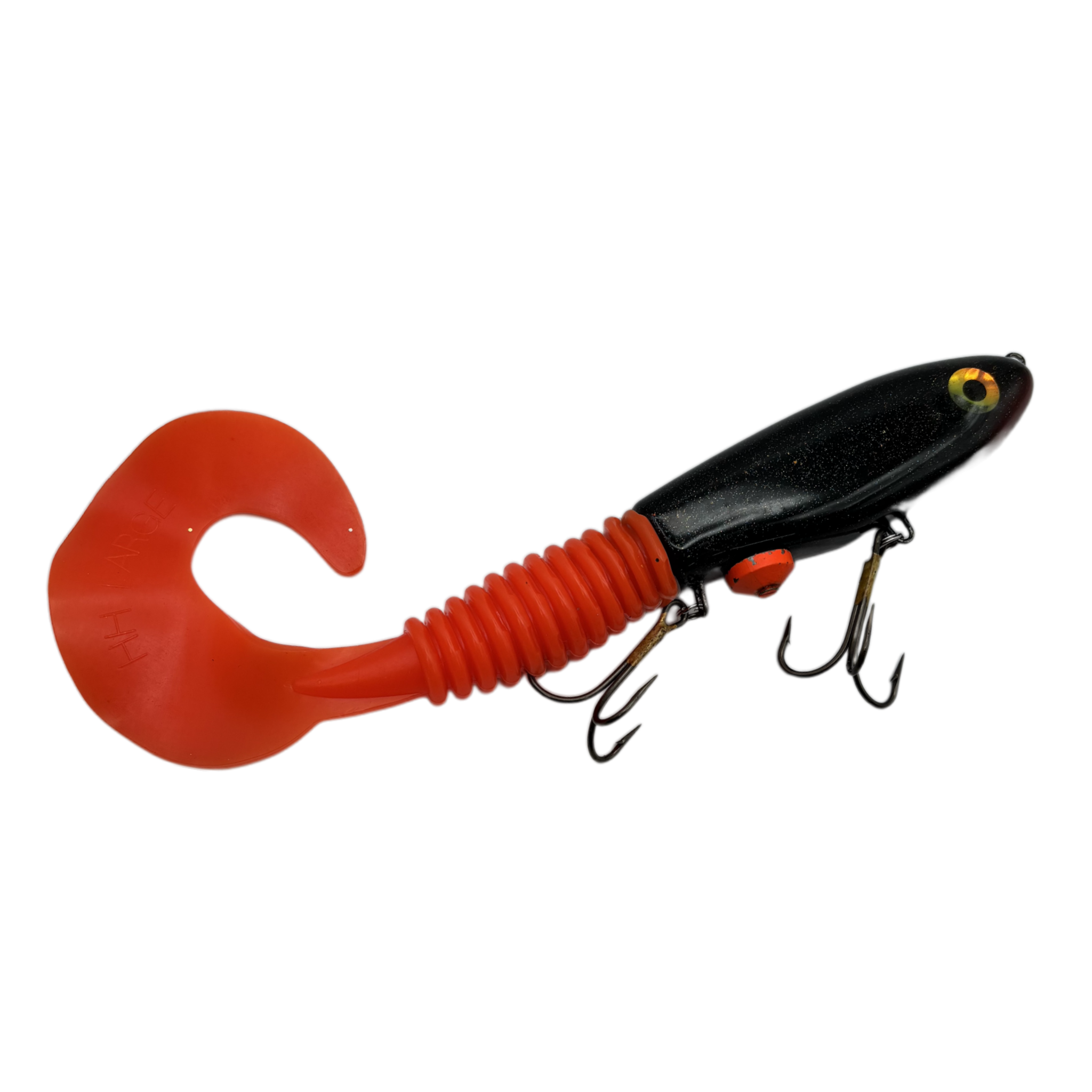The Phantom HardHead is made of solid high impact plastic head and a soft rubber tail that is turned onto a heavy duty custom made spring that can be replaced or adjusted on the water without any adhesive. The lure can be pulled or jigged and has 2 screw inserts front and rear for easy weight/balance adjustment. The lure without weight added sinks at about a foot a second.