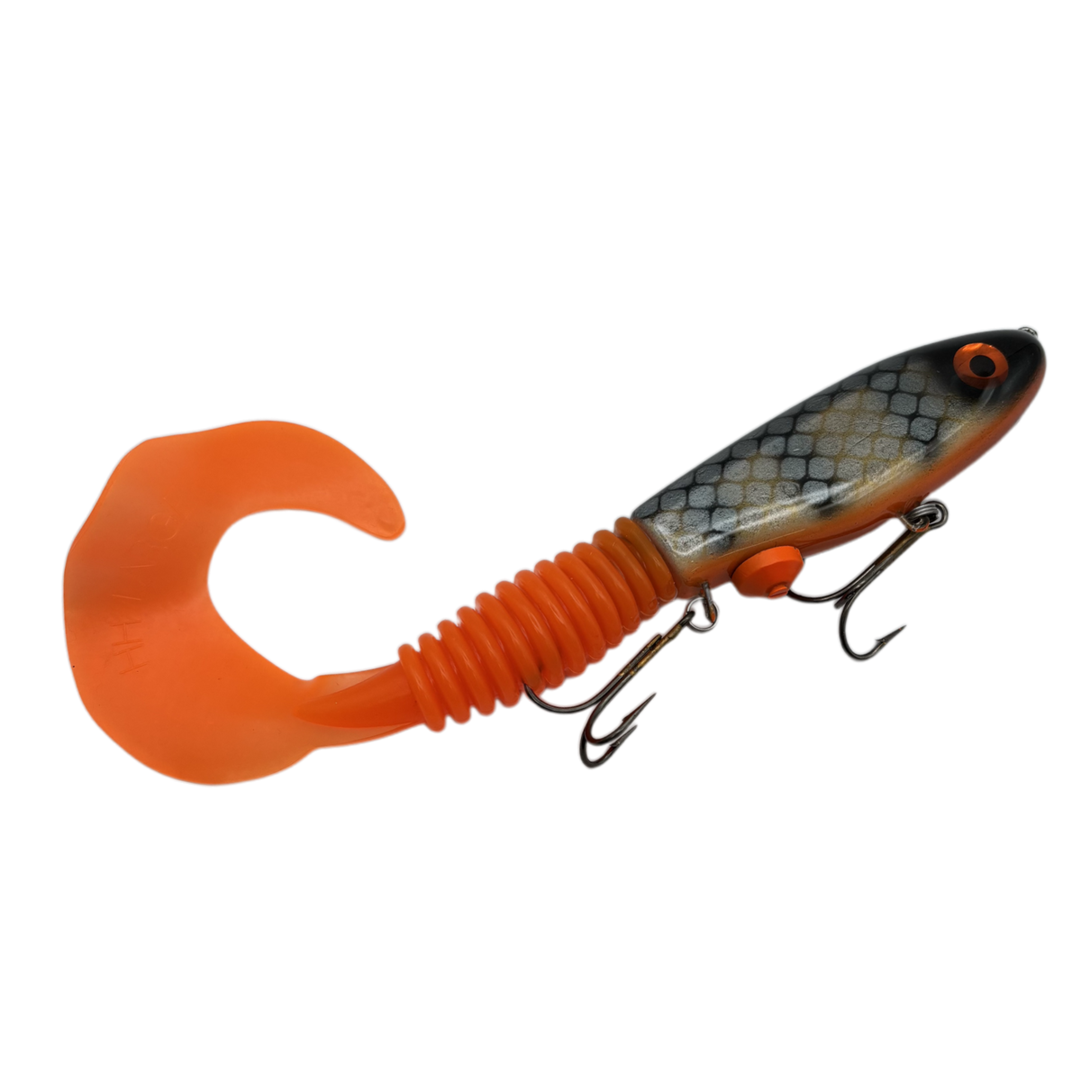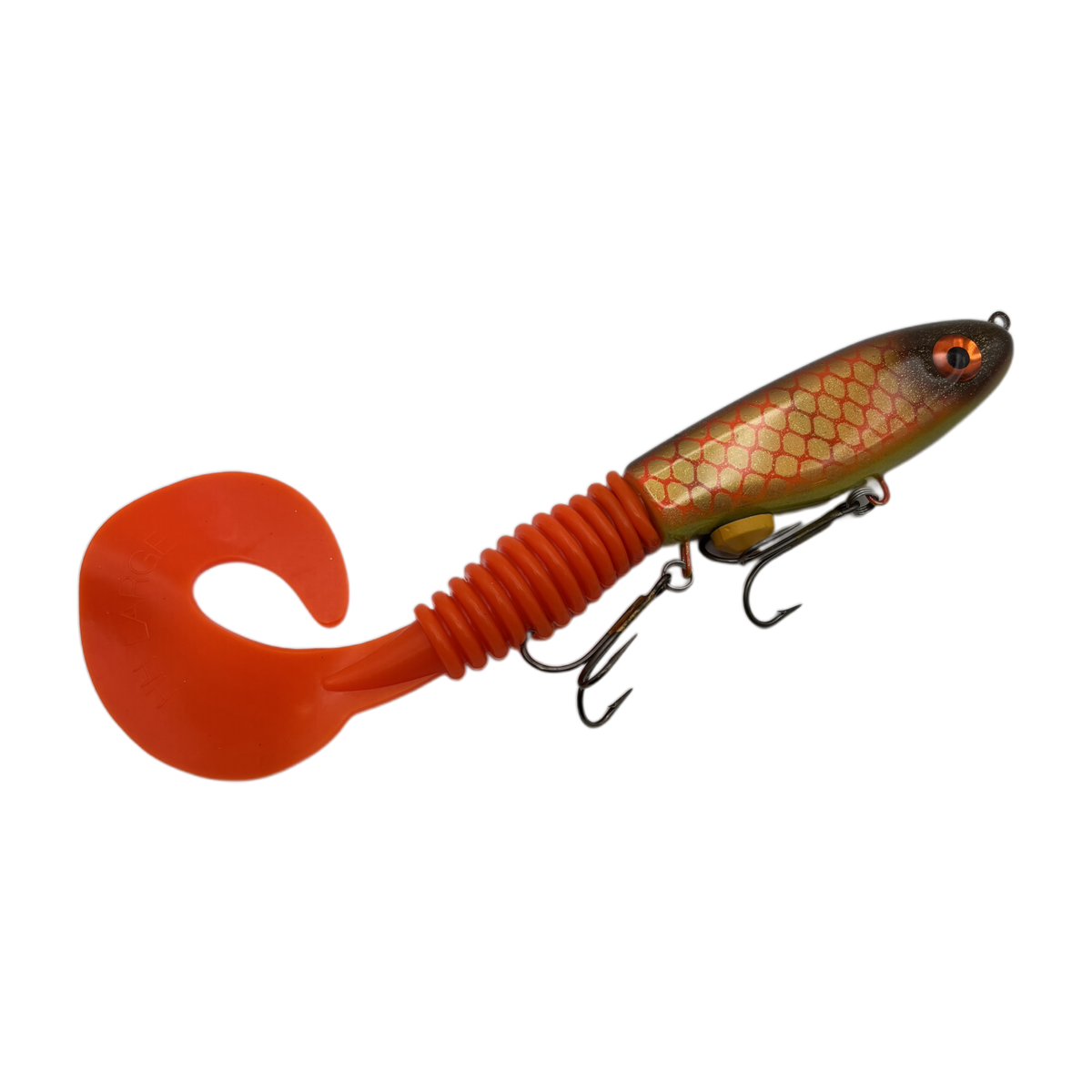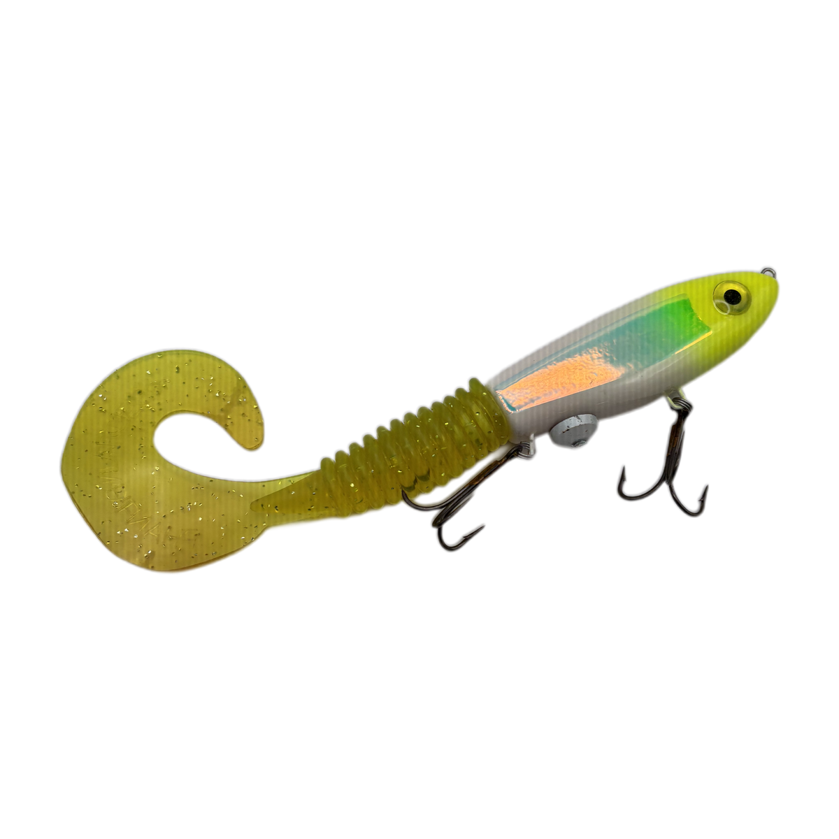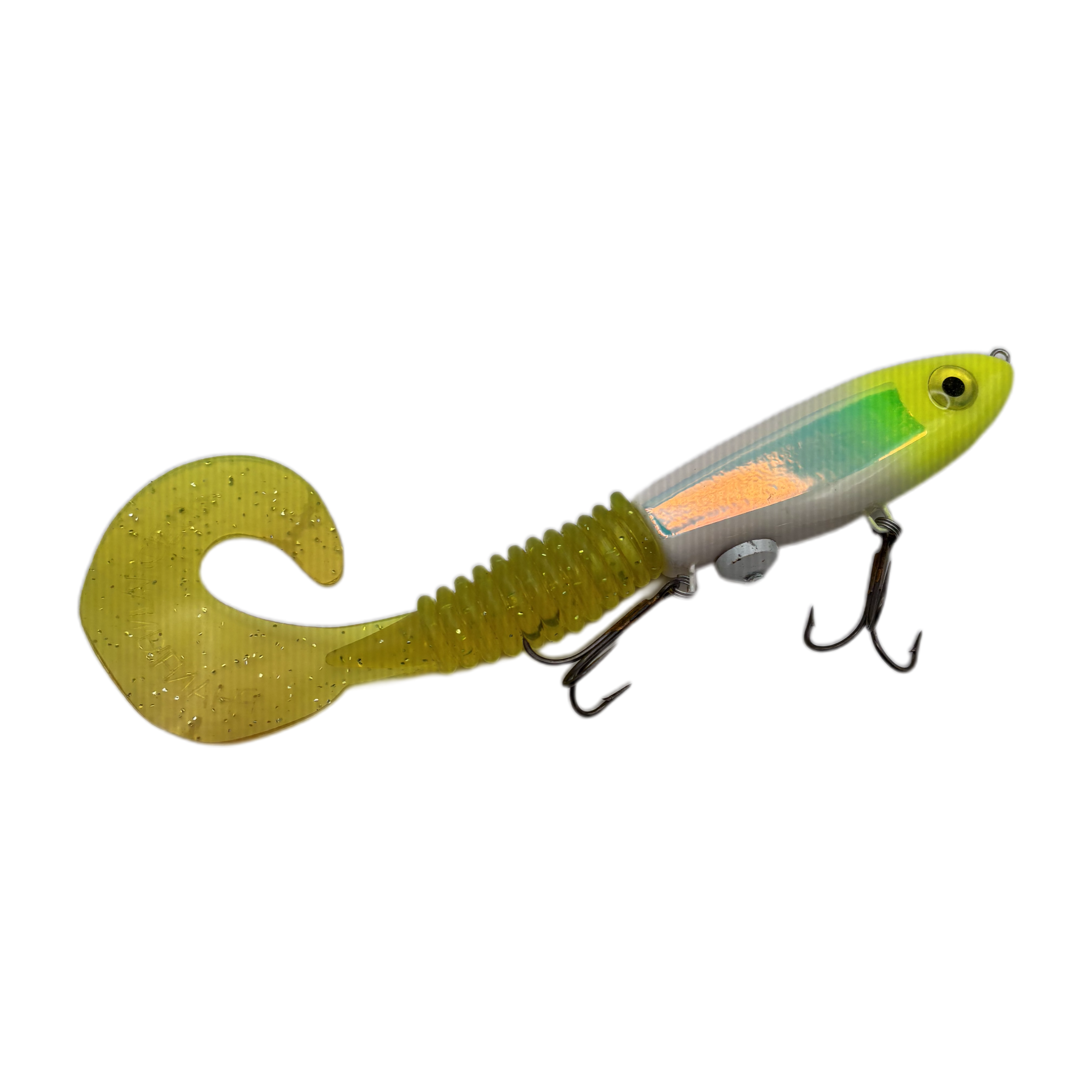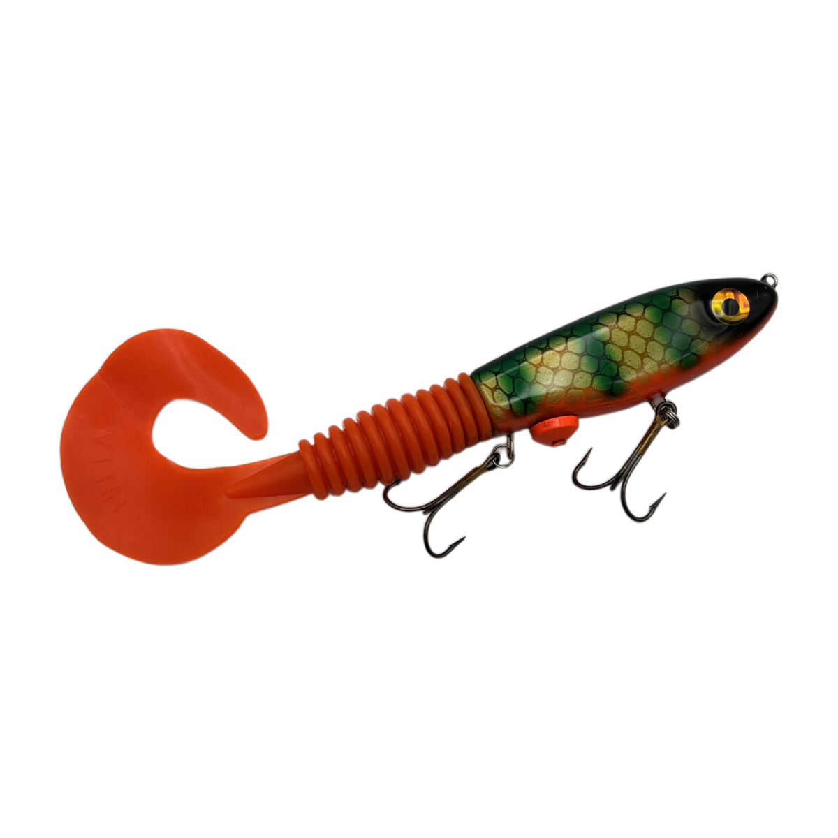 The Phantom HardHead is made of solid high impact plastic head and a soft rubber tail that is turned onto a heavy duty custom made spring that can be replaced or adjusted on the water without any adhesive. The lure can be pulled or jigged and has 2 screw inserts front and rear for easy weight/balance adjustment. The lure without weight added sinks at about a foot a second.