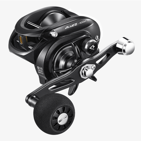 The Alijoz 400 is a heavy-duty, high-line capacity casting reel equipped with a Baitfeeder Switch. It features a magnetic brake system that enables long-distance casting and has a maximum Drag Power of 38 LBS making it suitable for saltwater scenarios where large bait and big fish are targeted.