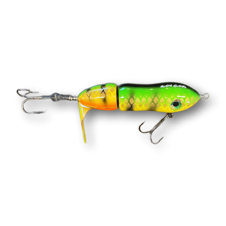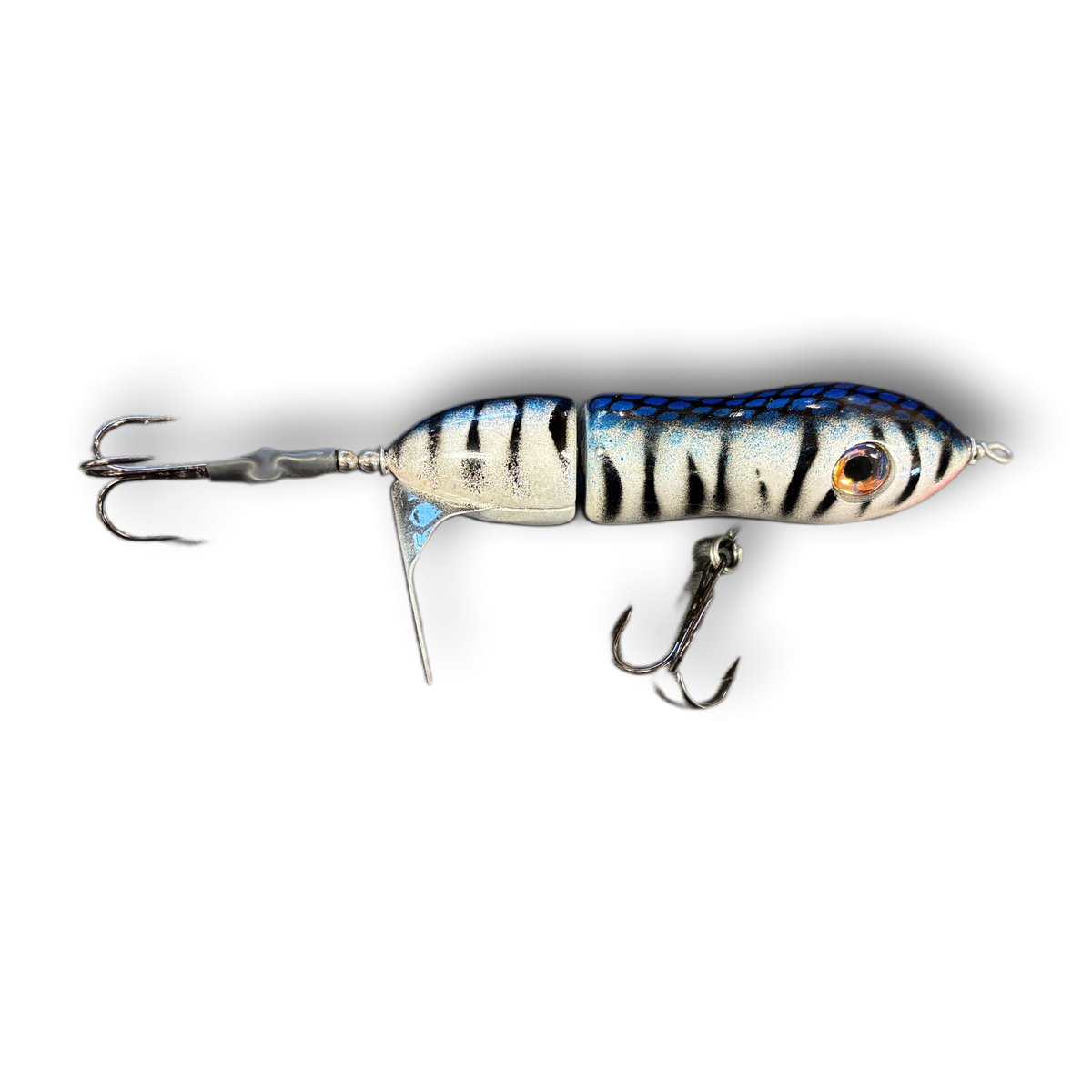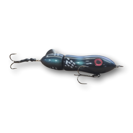 The Psycho Sis'tr with it's distinctive slow rotation with deep plops has been a consistent producing tail bait since day one. The Psycho Sis'tr is the largest of the Sis'trs. The Psycho Sis'tr has a well earned reputation for producing huge fish. Hand made out of cedar you will find a thru wire construction, a swiveled front hook and a stainless steel blade that you can tune and stays tuned. The back hook is shrink tubed to hold it in the perfect hooking position. Psycho Sis'tr comes standard with a 6/0 Premium Black Trident Treble Hook on the front and a 7/0 on the back.