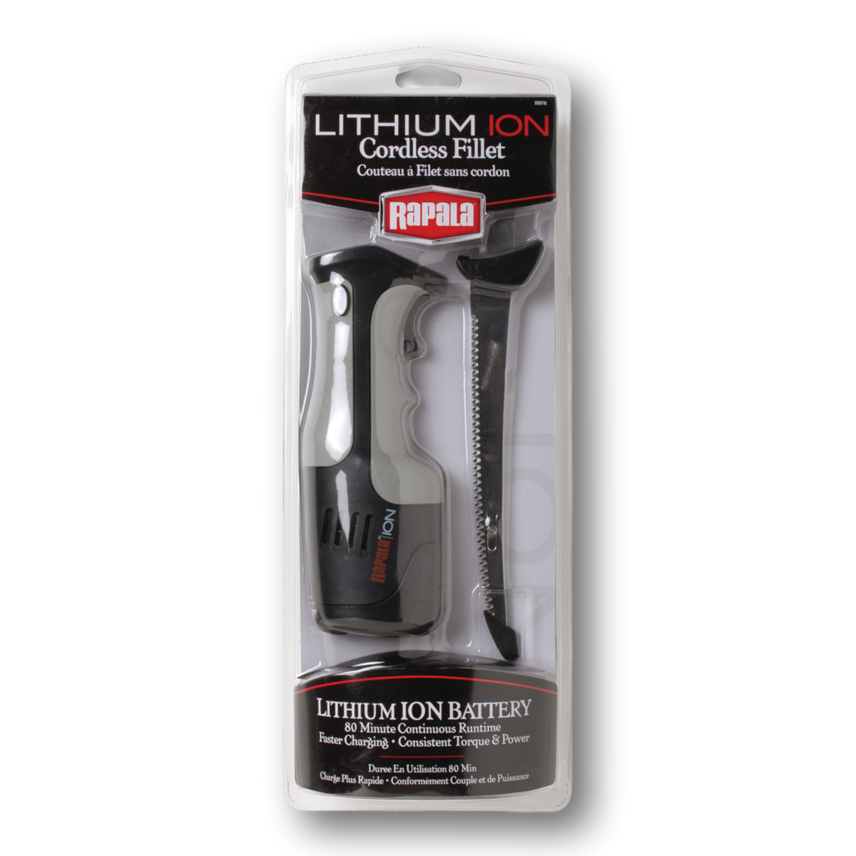 Ready to match up with any filleting task, the new Lithium Ion Cordless Fillet Knife produces 80 continuous minutes of runtime without any loss of power. Lithium Ion batteries provide a consistent speed and torque from fillet to fillet, without reduced power or slow down as battery power wains. Quick charge time, a full 80 minute runtime charge takes less than 2 hours. Low "memory" effect increases the number of charge/discharge cycles for longer battery life. Advanced air flow design keeps quiet, high torque motor running smoothly for years. Relaxed grip body ensures comfort and secure grip while 7" reciprocating blades make fast work of any filleting task. Includes 110V AC battery charger.
