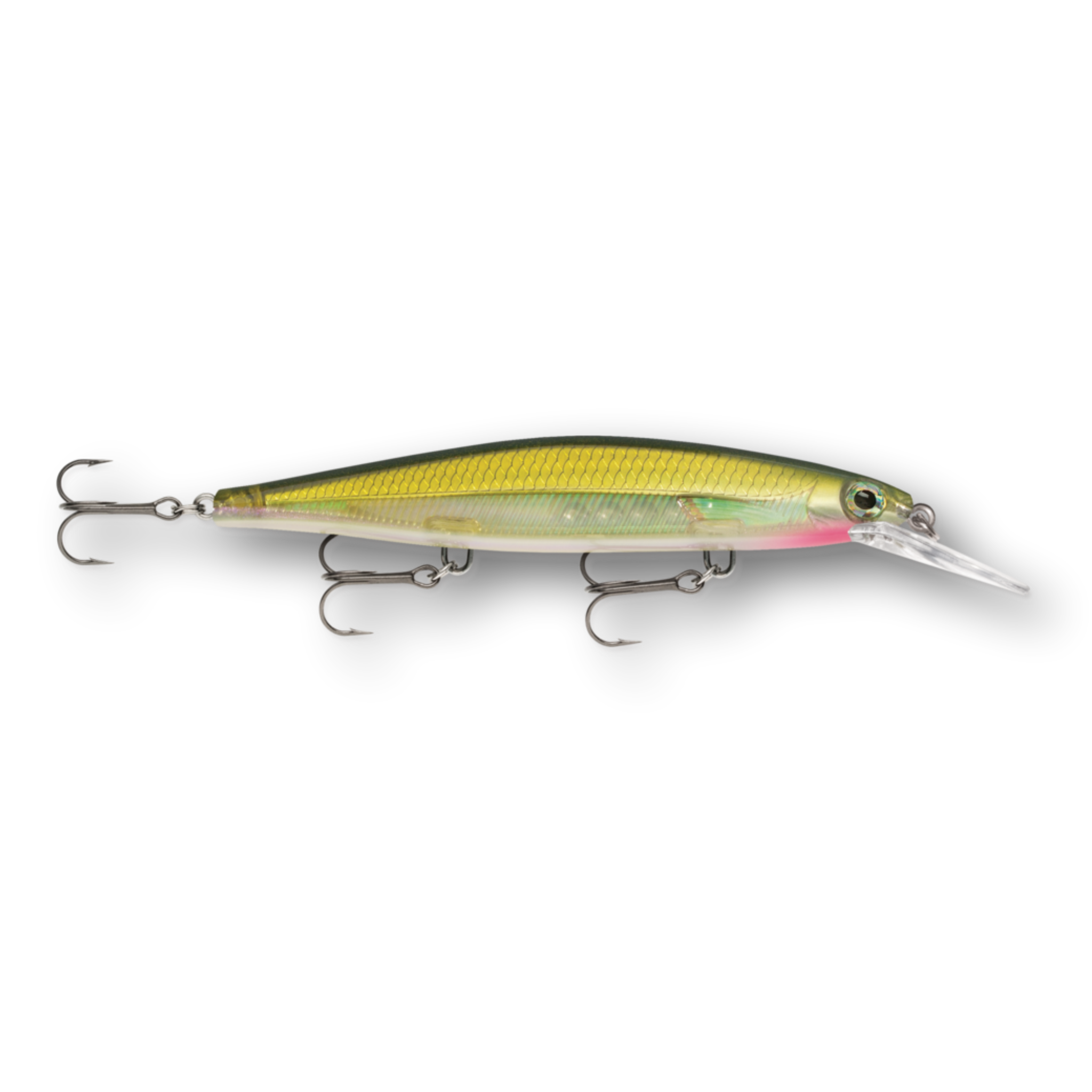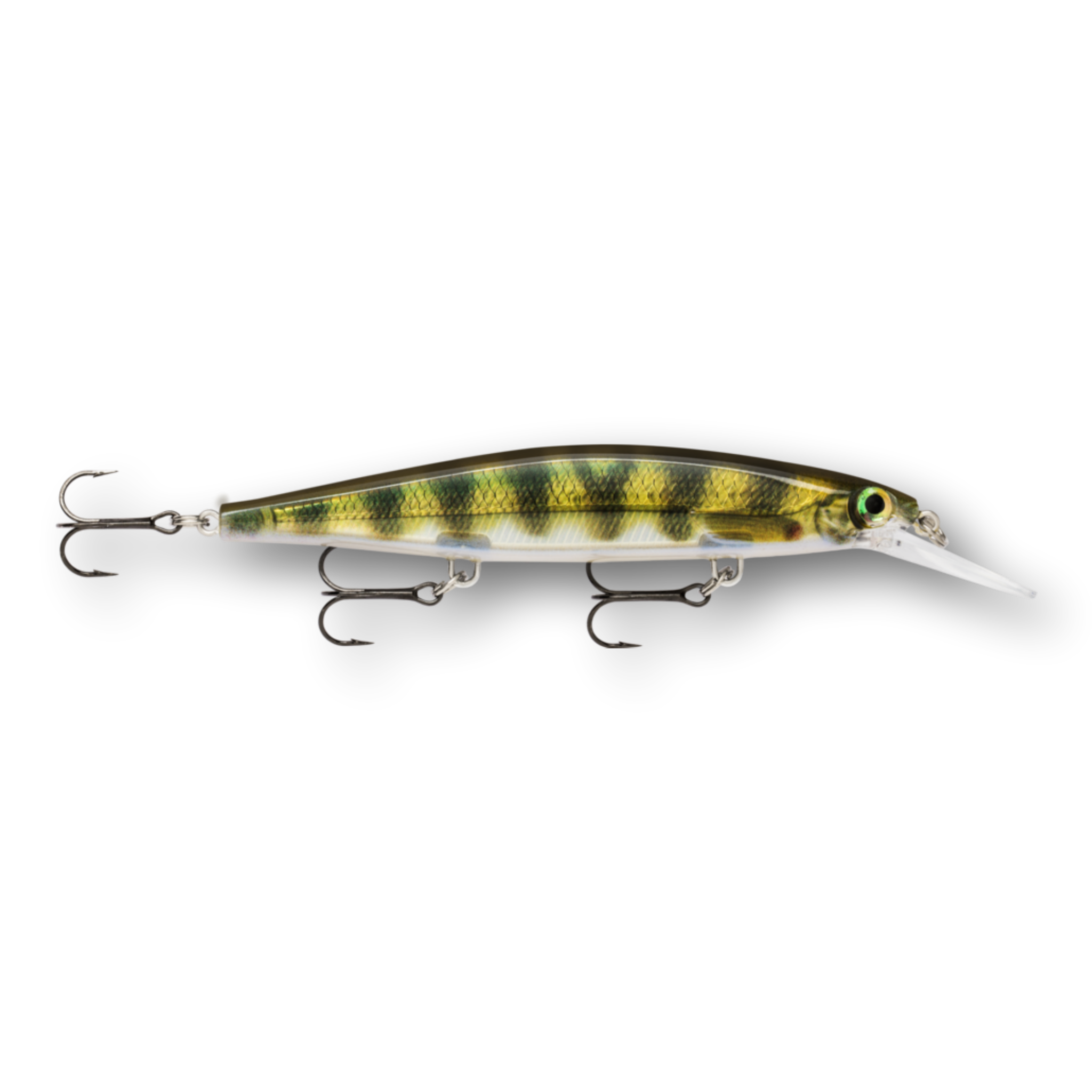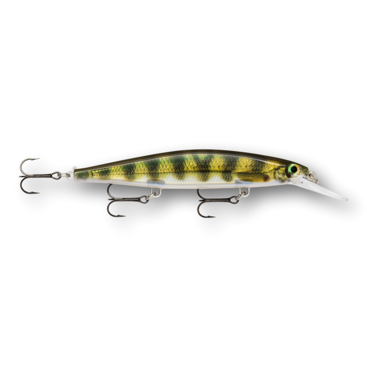 The Shadow Rap® Deep combines a horizontal struggle with a vertical fade that perfectly mimics a minnow in trouble in the 4-8 foot depth range. Rapala has perfected the natural minnow action in this new jerkbait that triggers fish in three ways: on the kick, on a slow fading fall and on the snap back to life. Most jerk baits continue on a forward plane with each jerk. Not the Shadow Rap® Deep. It kicks almost 180 degrees right then left, so it can be fished nearly in place with very little forward travel, keeping the flickering fade right in a fish's strike zone. IT'S ABOUT THE STRUGGLE - Kicking almost 180 degrees right then left, with very little forward travel, it stays in the strike zone. HEAD DOWN ATTITUDE - Head down, ready to work, the fixed weight system allows lure to fade slowly like a dying minnow. SLACK LINE LOOK BACK - After a sharp snap and generous slack line, it will actually spin around and look backwards.