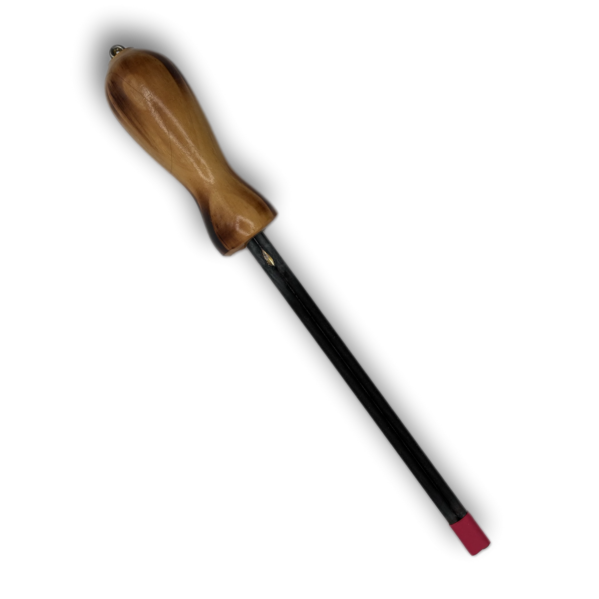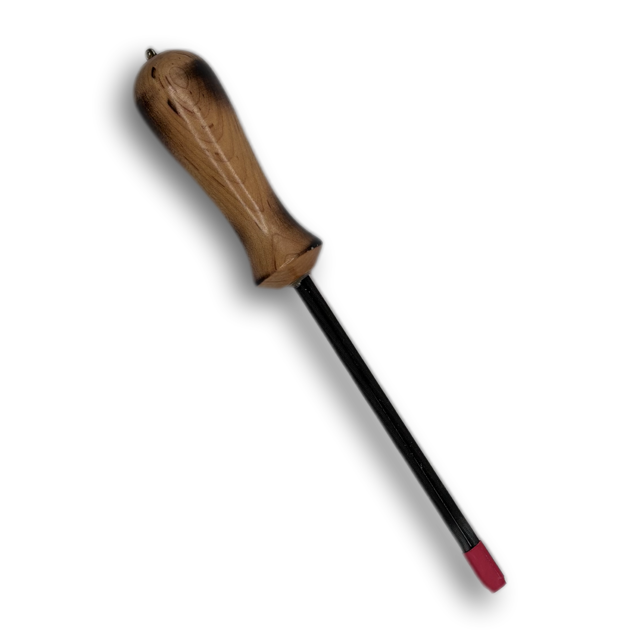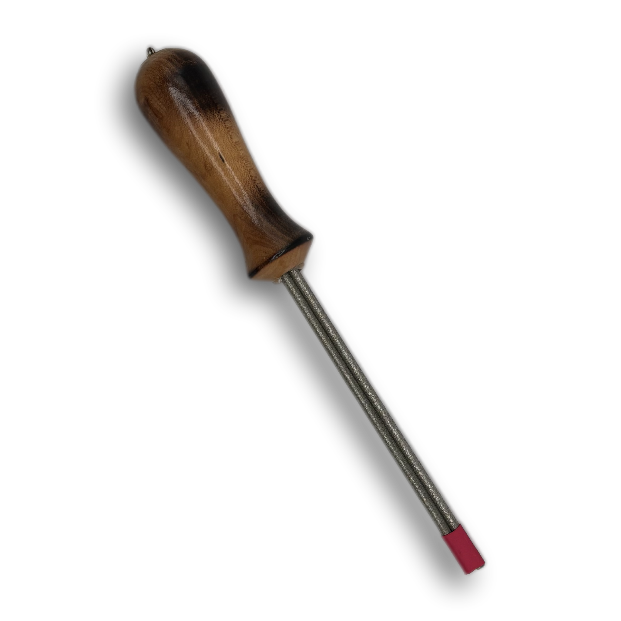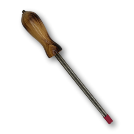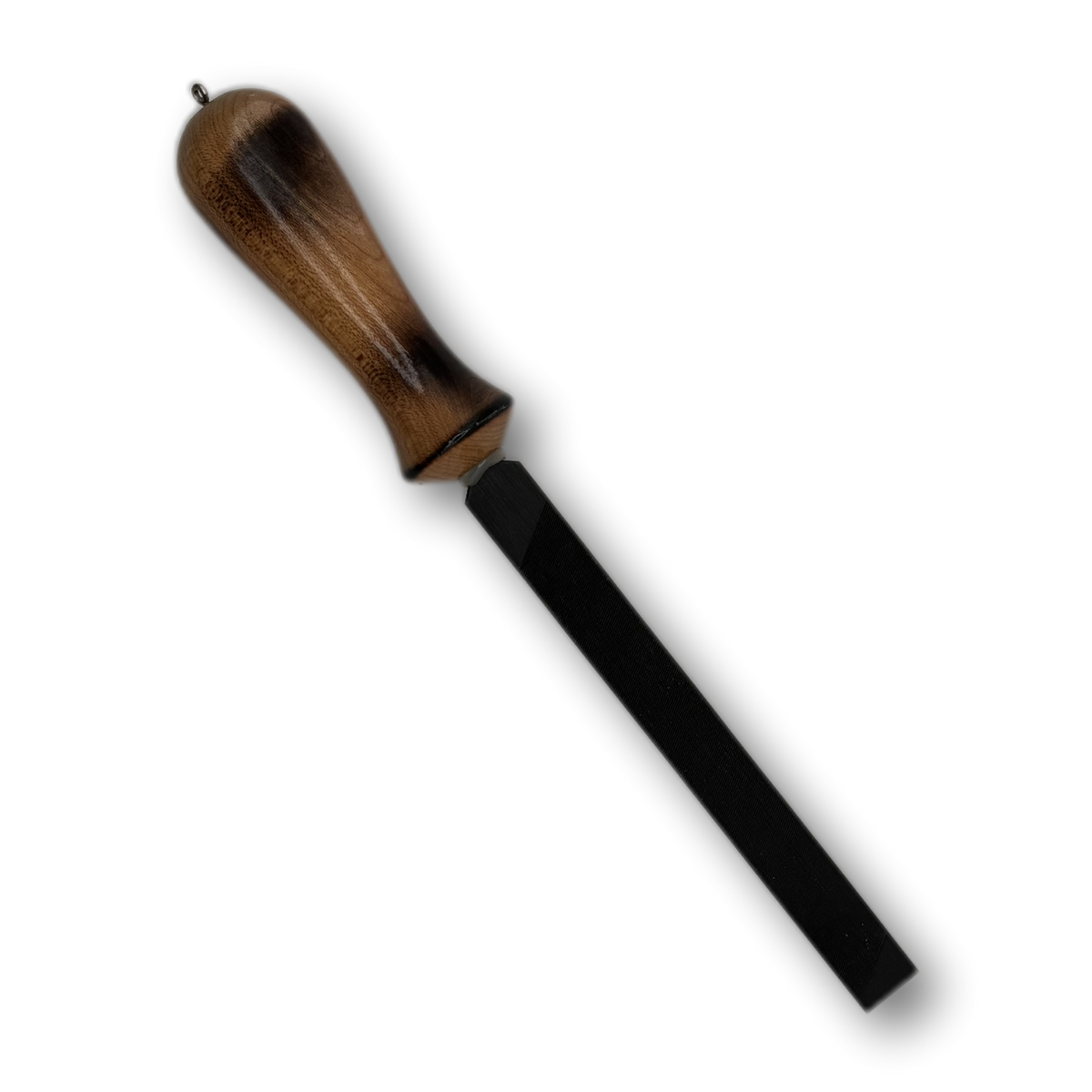 Rust resistant flat file on a wooden handle. 10" in length and best size 1/0 to 5/0 hooks.