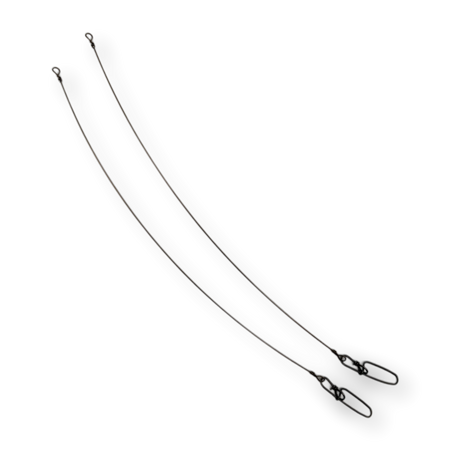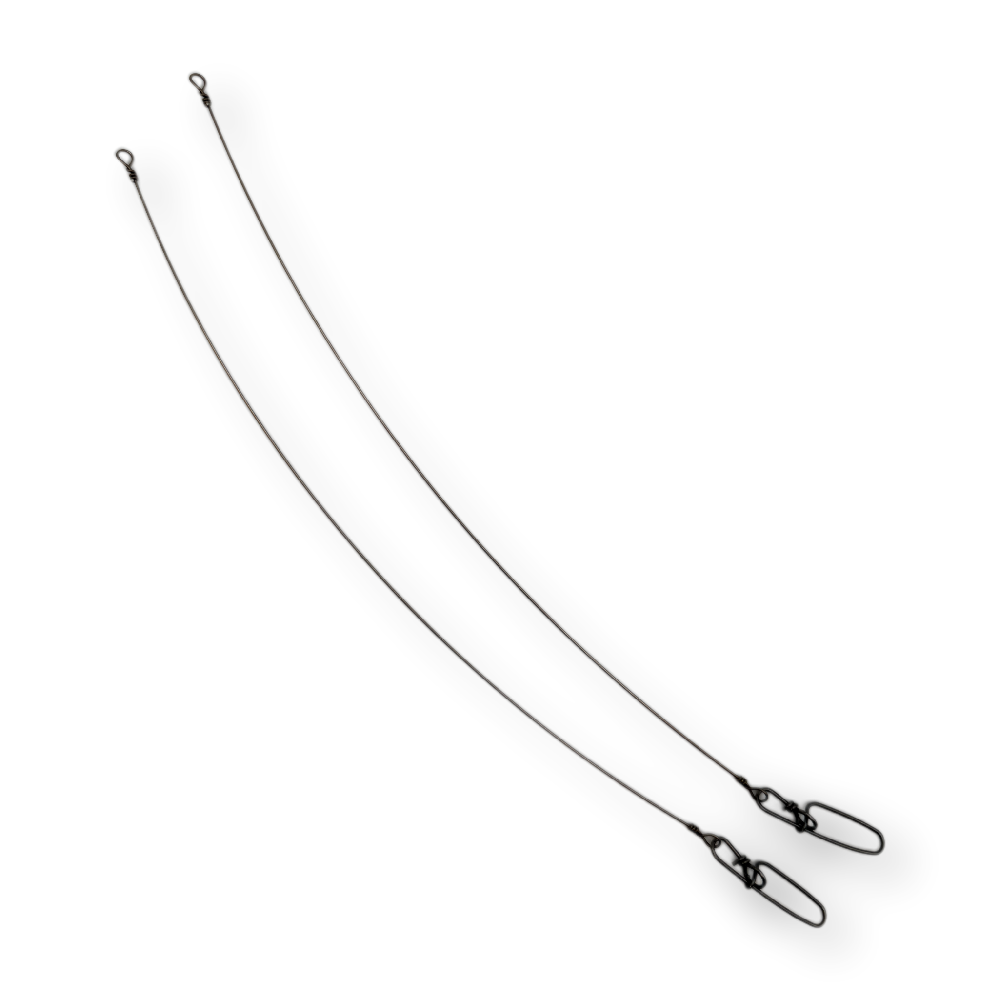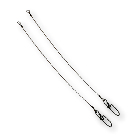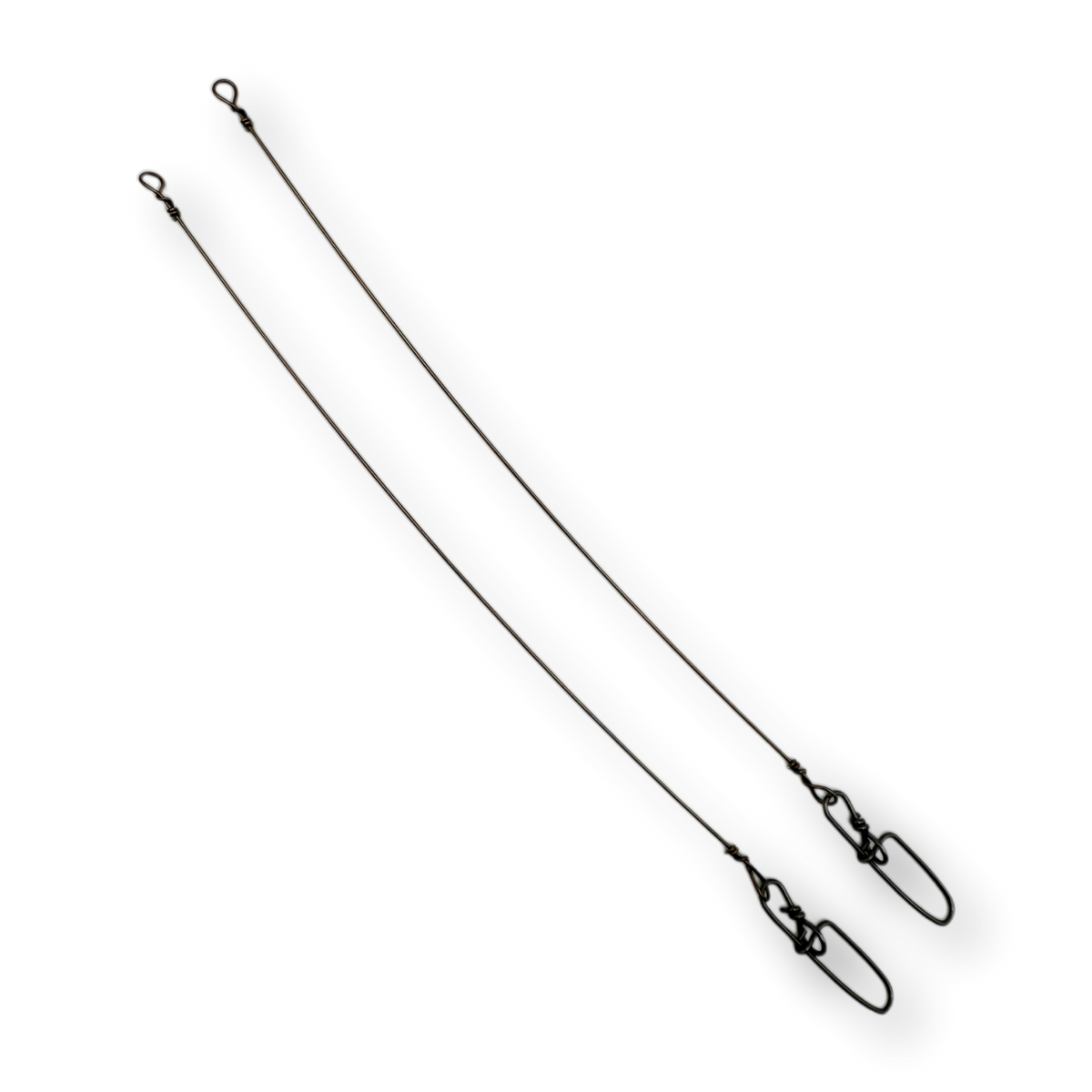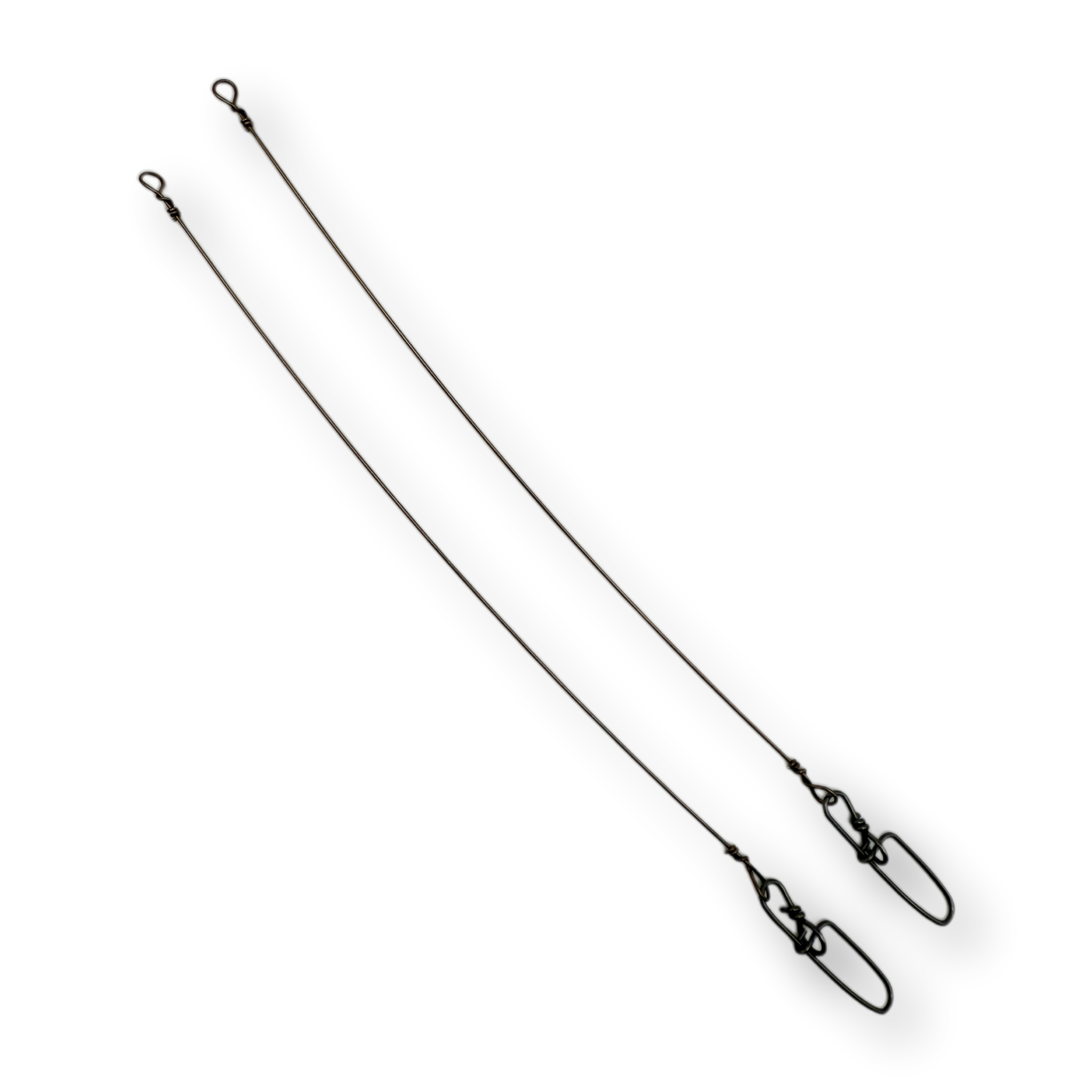 2 Pack 174# Test Solid Stainless Steel Wire 11″ WTD ” Walk the Dog” Leaders. (No Swivel) These leaders are mainly used on “walk the dog” style glide baits or jerkbait where it is not necessary to have a swivel. They also work great with Topwater baits due to being very lightweight by not having a swivel attached. WTD leaders come standard with a #5 Stringease Stay Lok Snap.