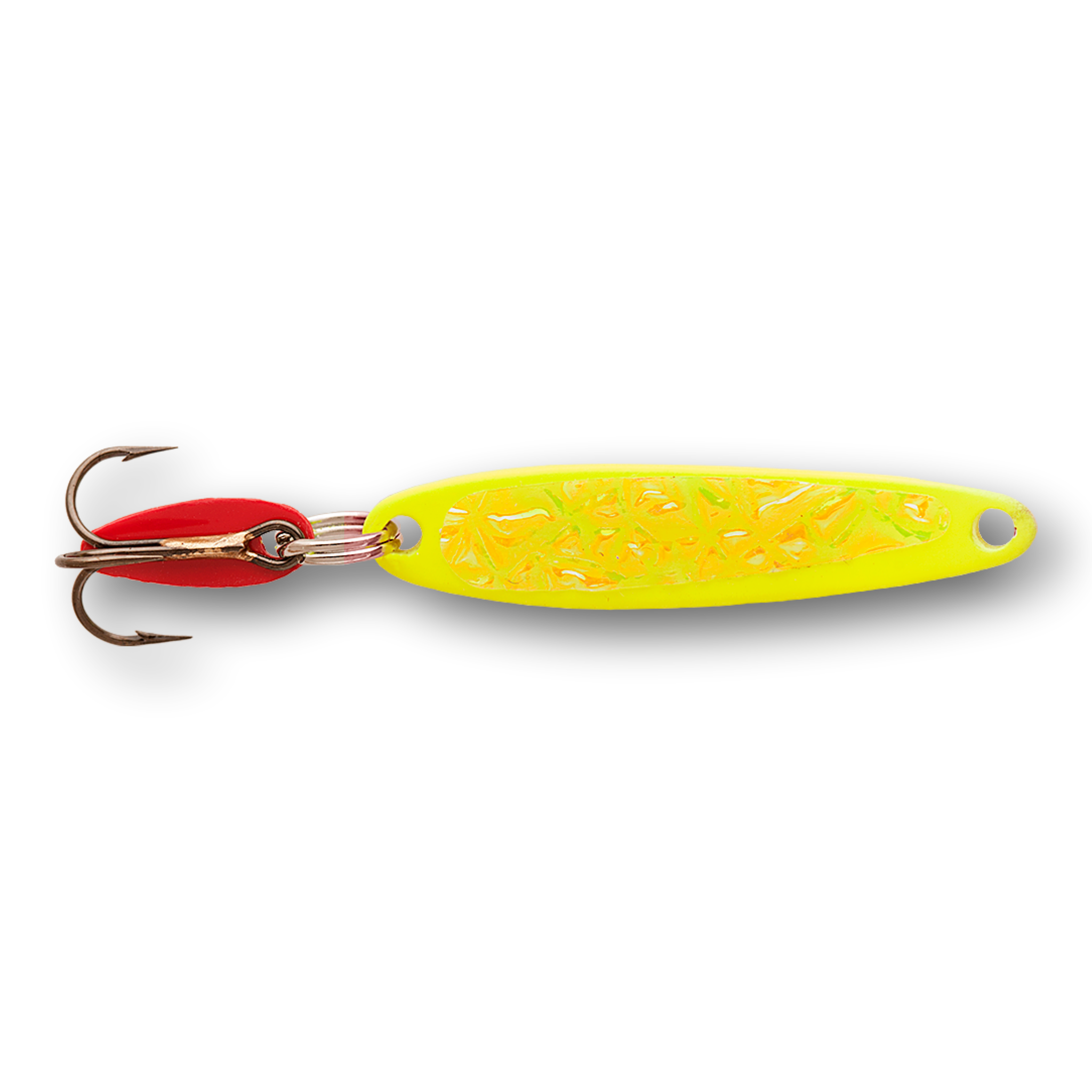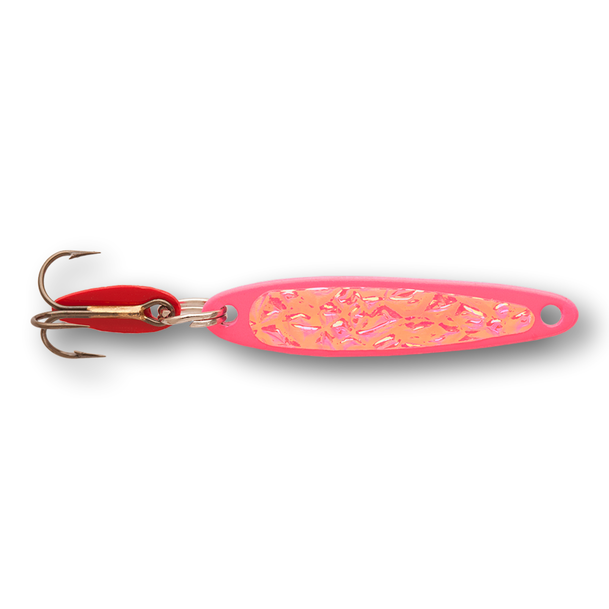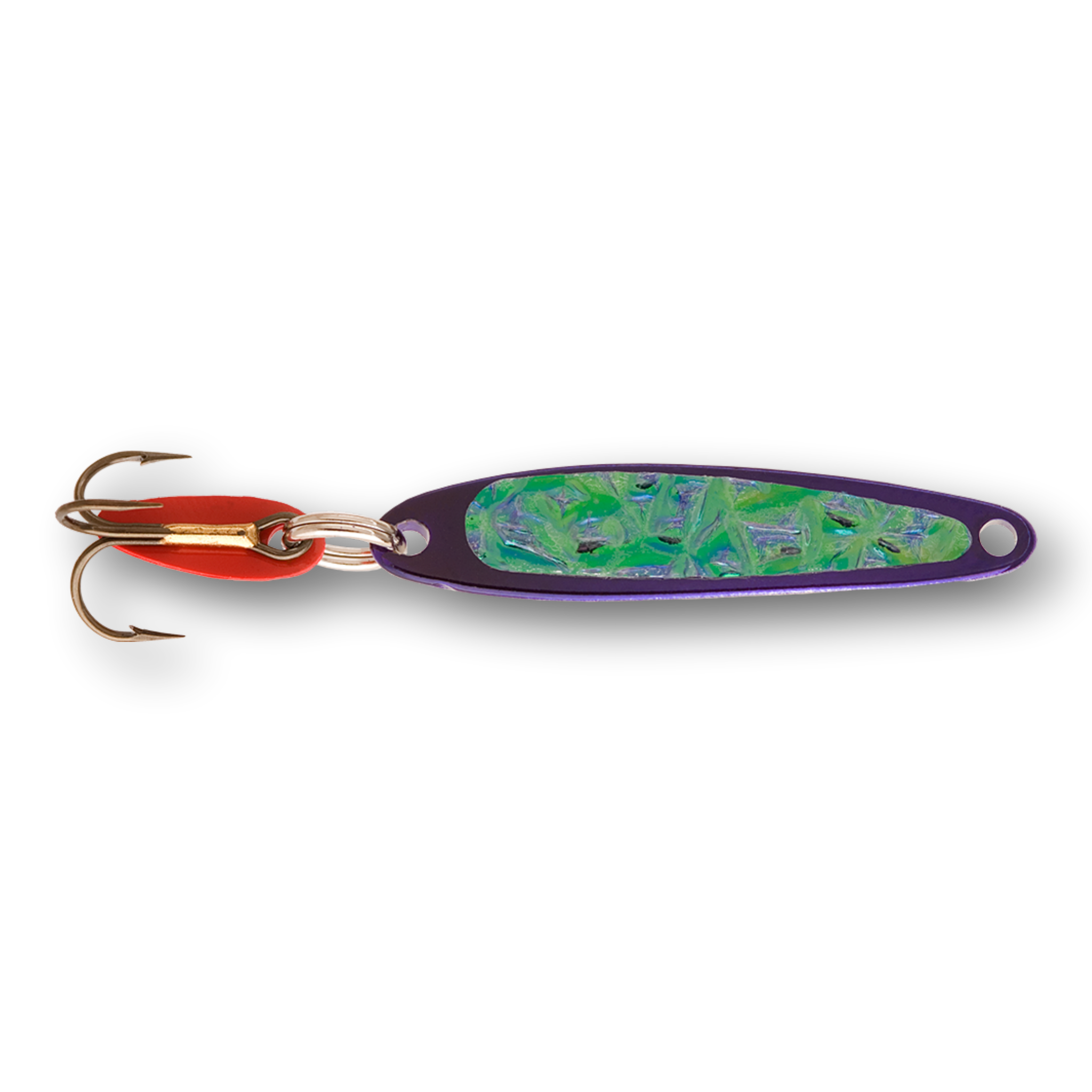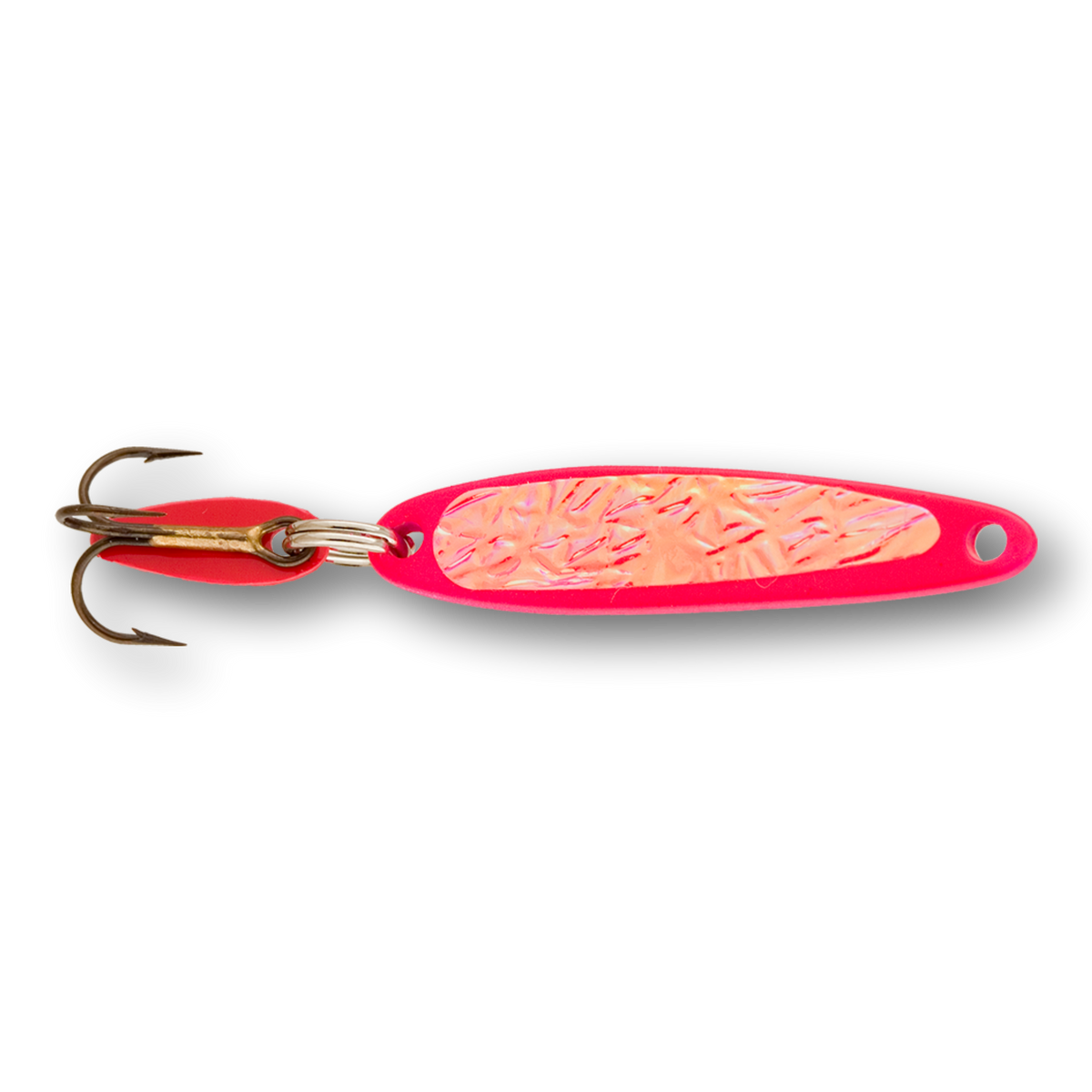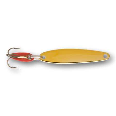 These fine lures, forged of solid brass are available in six lustrous metallic finishes in metal, prism colors, white pearl and fluorescent colors.