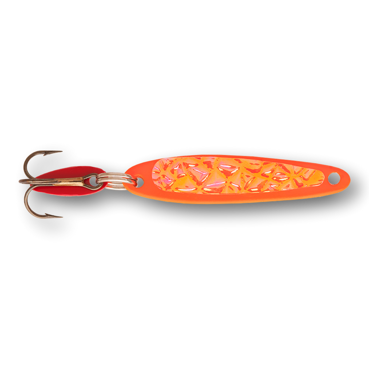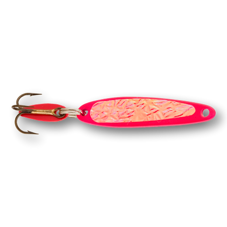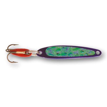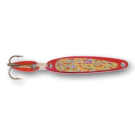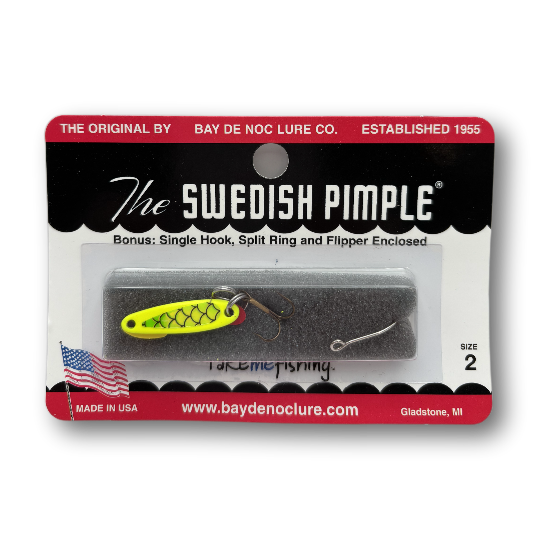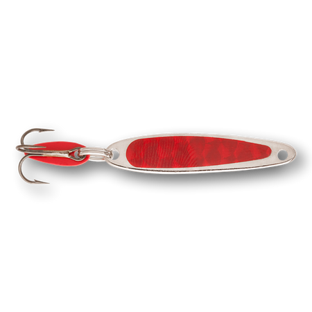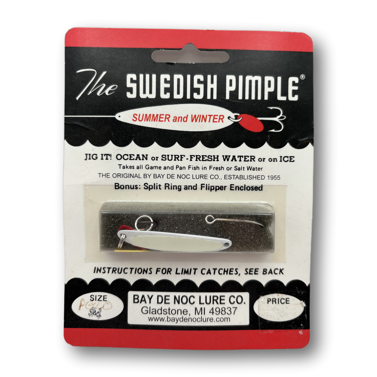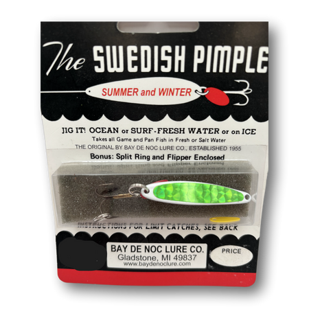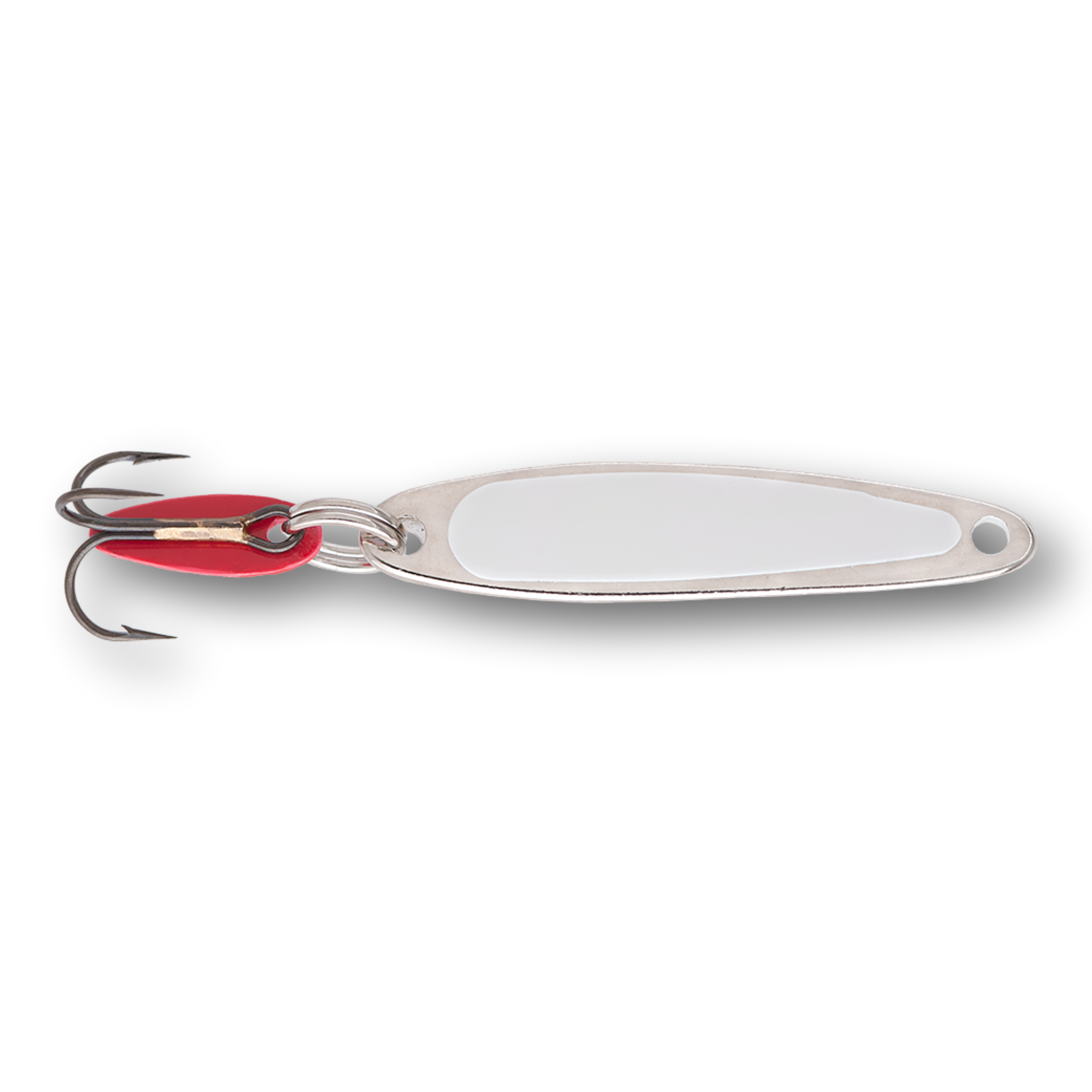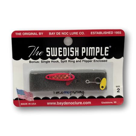 Use a #2, 3, 4 or 5 Swedish Pimple for best results on pan fish and game fish in shallower waters. Used with a lift, fall and pause retrieve, they are good spinning spoons for all game and pan fish. To use as a spinning lure with a straight or interrupted retrieve, reverse the location of the red flipper for more kick to the lure (i.e. remove the flipper and reinstall it on the flat side of the Pimple). A bonus Single Baiter Hook and Flipper is supplied with sizes 2,3 and 4.