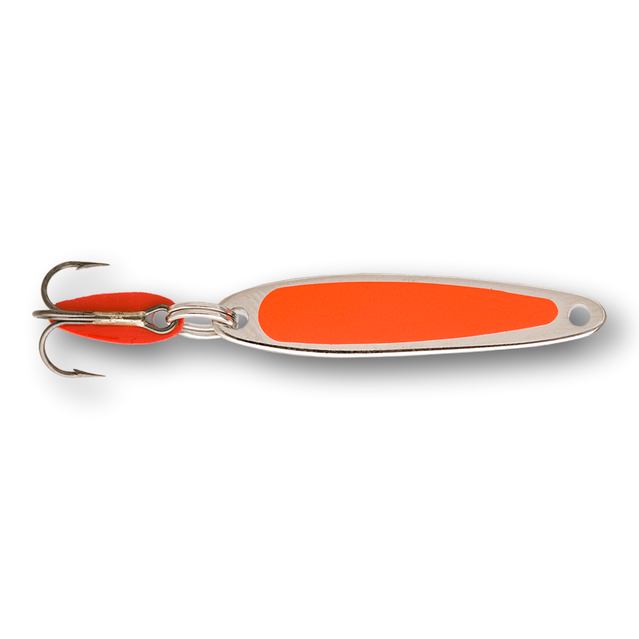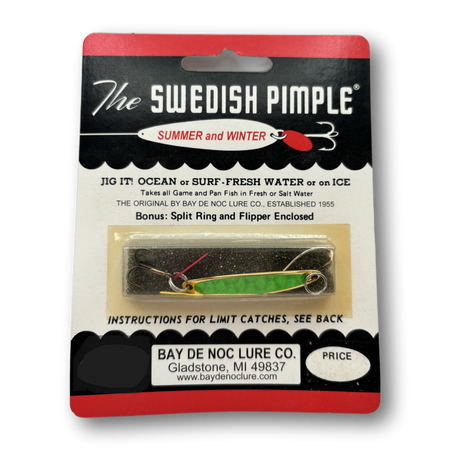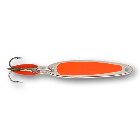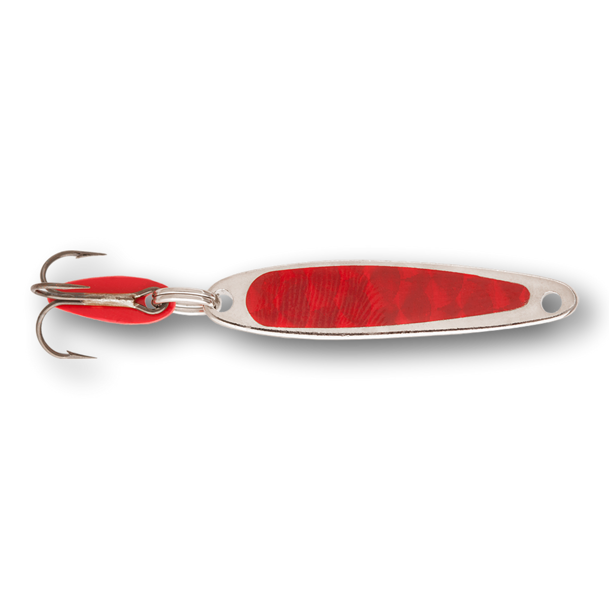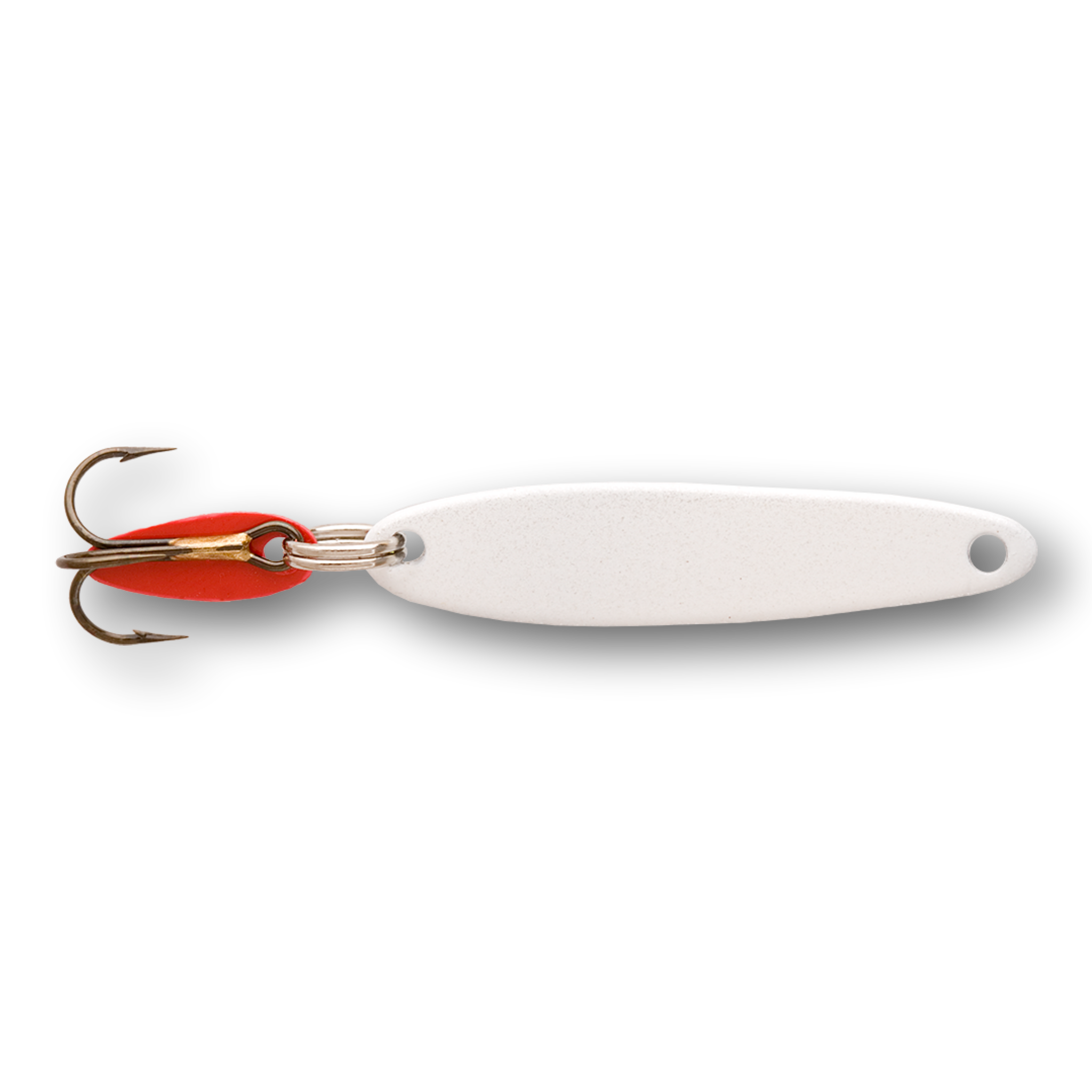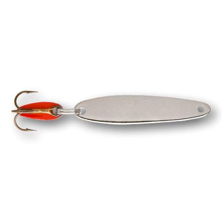Use a #2, 3, 4 or 5 Swedish Pimple for best results on pan fish and game fish in shallower waters. Used with a lift, fall and pause retrieve, they are good spinning spoons for all game and pan fish. To use as a spinning lure with a straight or interrupted retrieve, reverse the location of the red flipper for more kick to the lure (i.e. remove the flipper and reinstall it on the flat side of the Pimple). A bonus Single Baiter Hook and Flipper is supplied with sizes 2, 3 and 4.