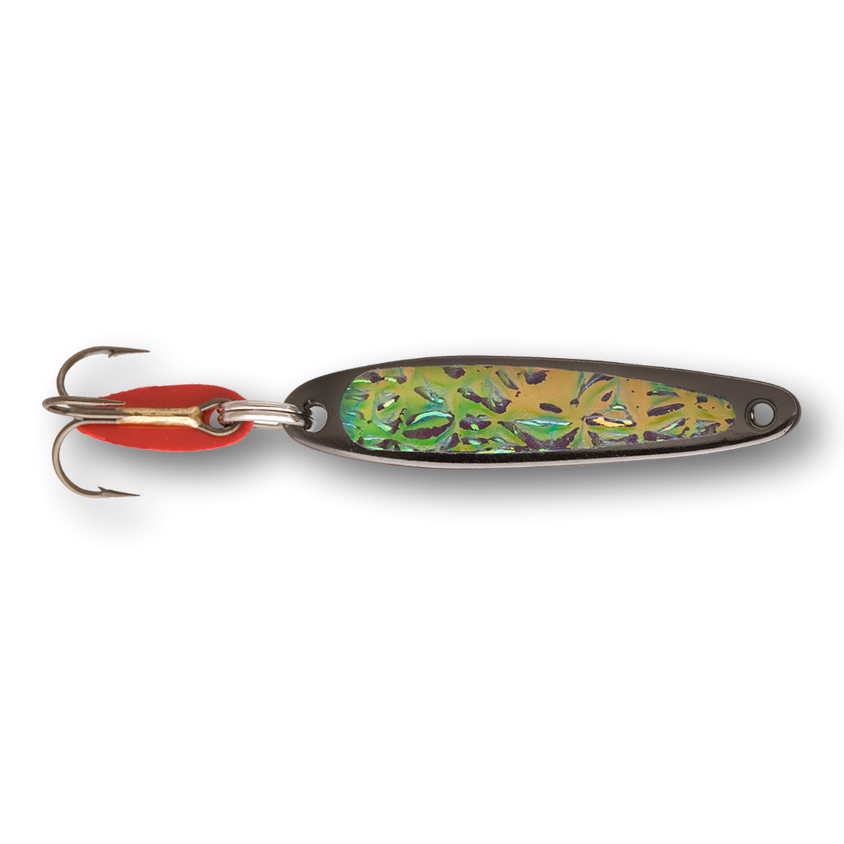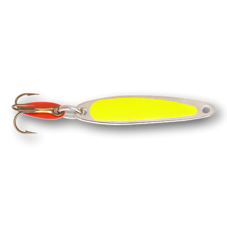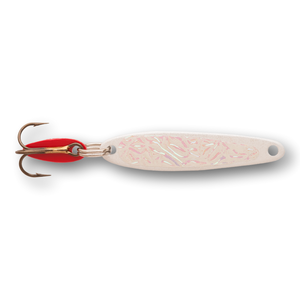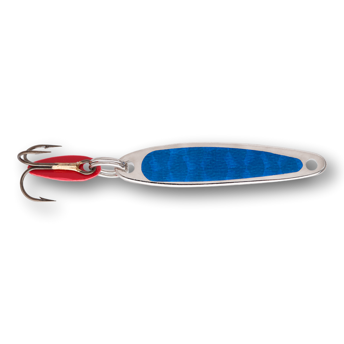 Use a #2, 3, 4 or 5 Swedish Pimple for best results on pan fish and game fish in shallower waters. Used with a lift, fall and pause retrieve, they are good spinning spoons for all game and pan fish. To use as a spinning lure with a straight or interrupted retrieve, reverse the location of the red flipper for more kick to the lure (i.e. remove the flipper and reinstall it on the flat side of the Pimple). A bonus Single Baiter Hook and Flipper is supplied with sizes 2, 3 and 4.