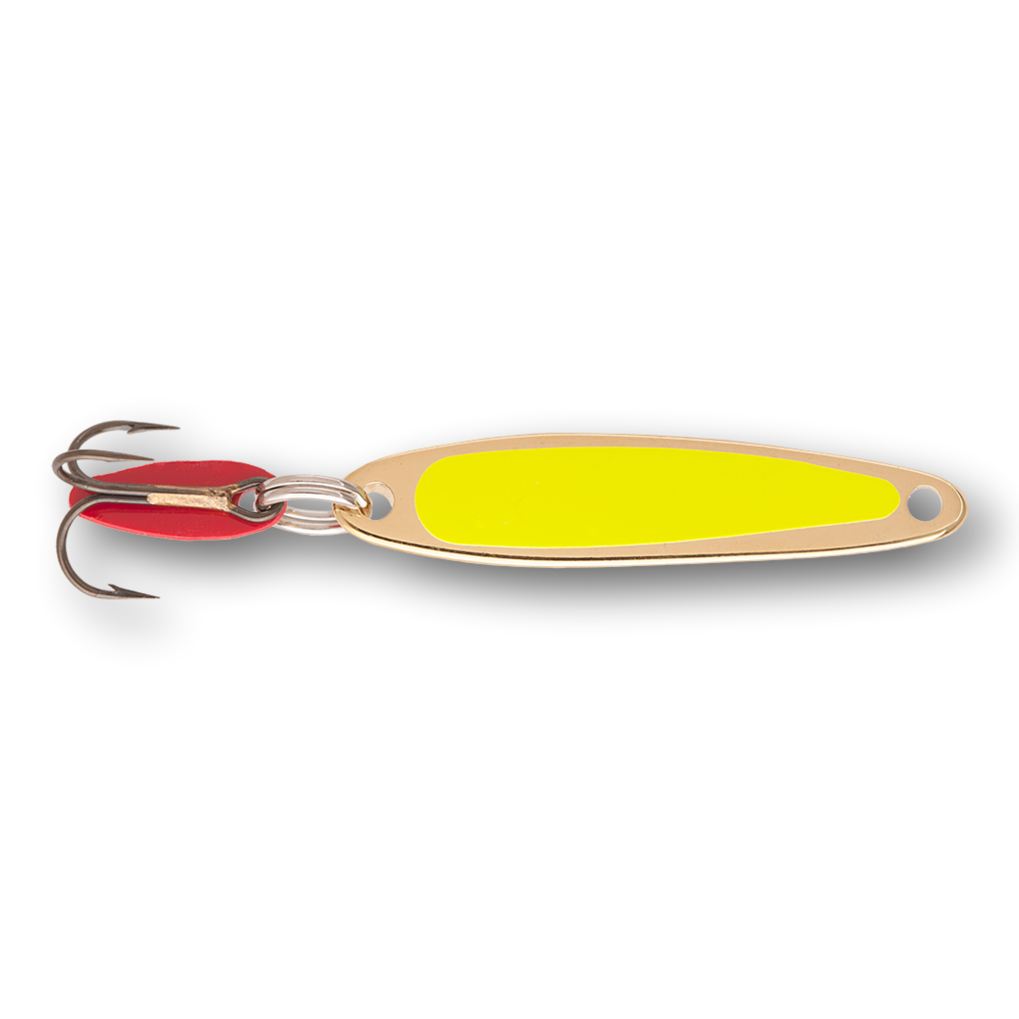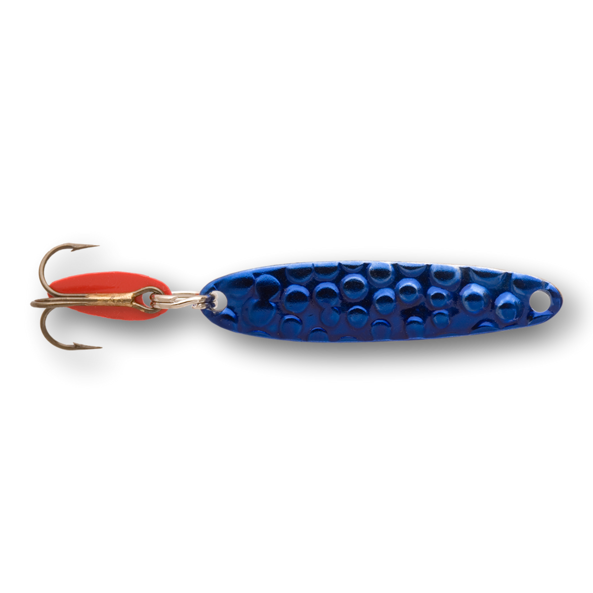 These fine lures, forged of solid brass are available in six lustrous metallic finishes in metal, prism colors, white pearl and fluorescent colors.