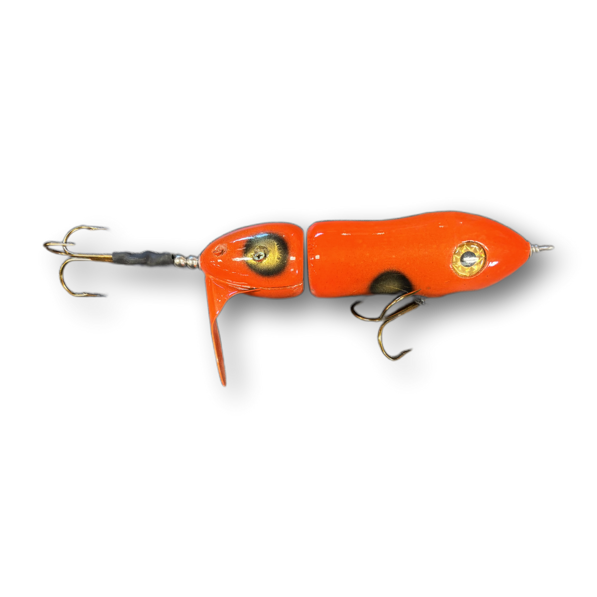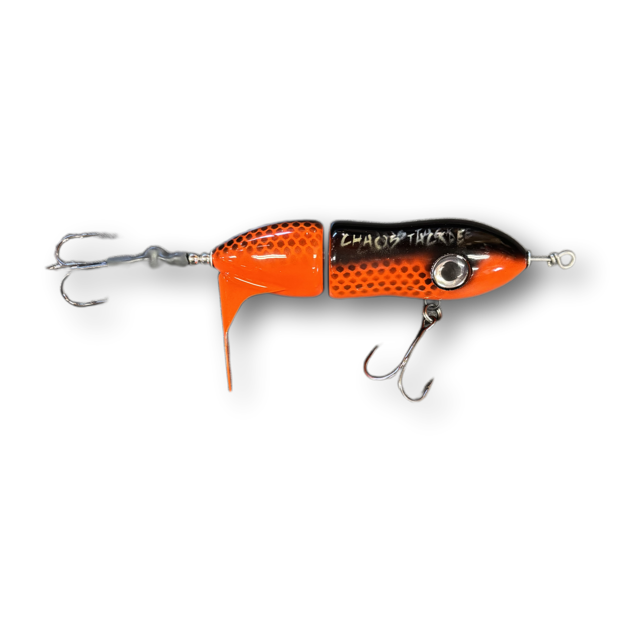 The Twis'td Sis'tr with it's distinctive slow rotation with deep plops has been a consistent producing tail bait since day one. The Twis'td Sis'tr has a well earned reputation for producing huge fish. Hand made out of cedar you will find a thru wire construction, a swiveled front hook and a stainless steel blade that you can tune and stays tuned. The back hook is shrink tubed to hold it in the perfect hooking position. Twis'td Sis'tr comes standard with a 3/0 Premium Black Trident Treble Hook on the front and a 4/0 on the back.