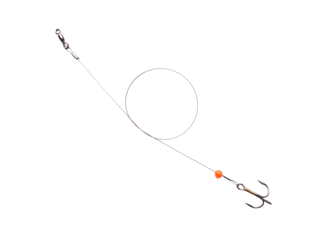 Description: Stop losing fish to sharp teeth! The Z-Leaders Wire Hot Bead Treble Rig is the professional choice for landing toothy game fish, and is extremely popular for Northern Pike and other predators through the ice.
